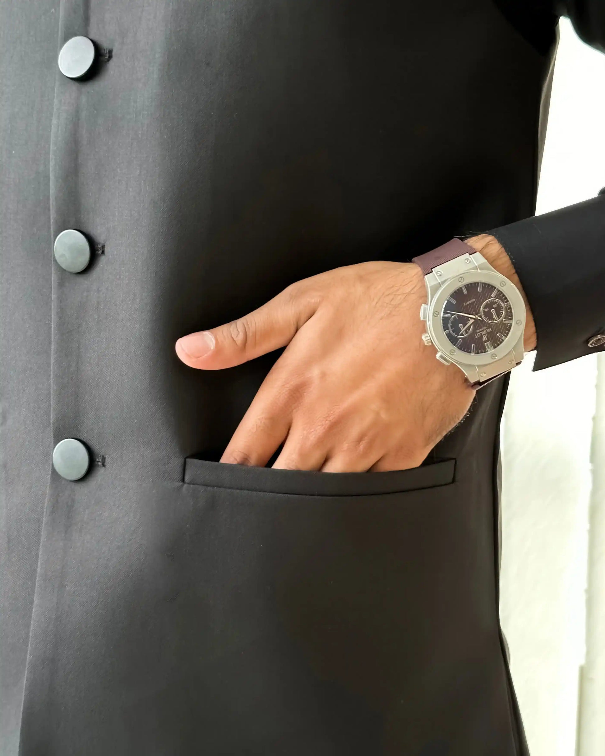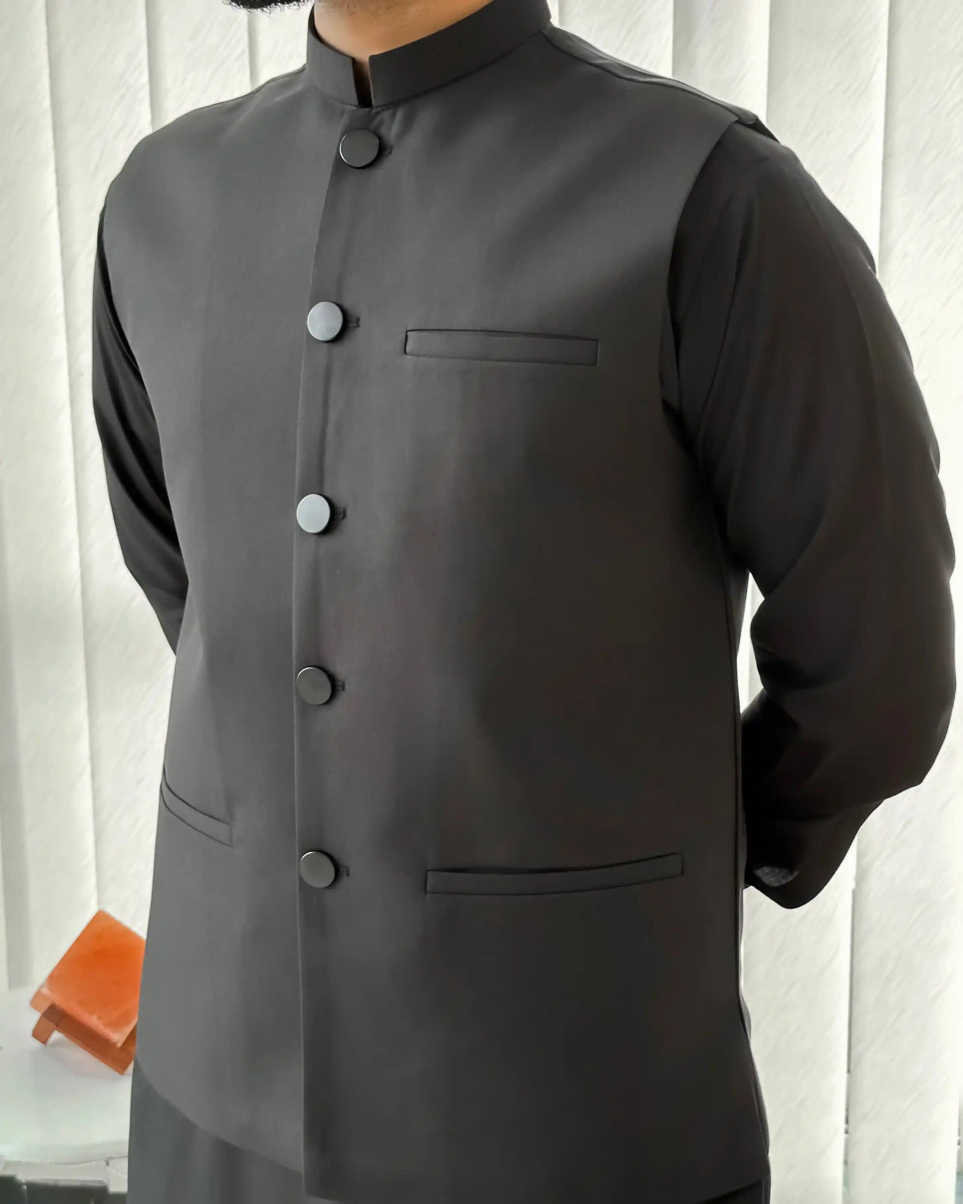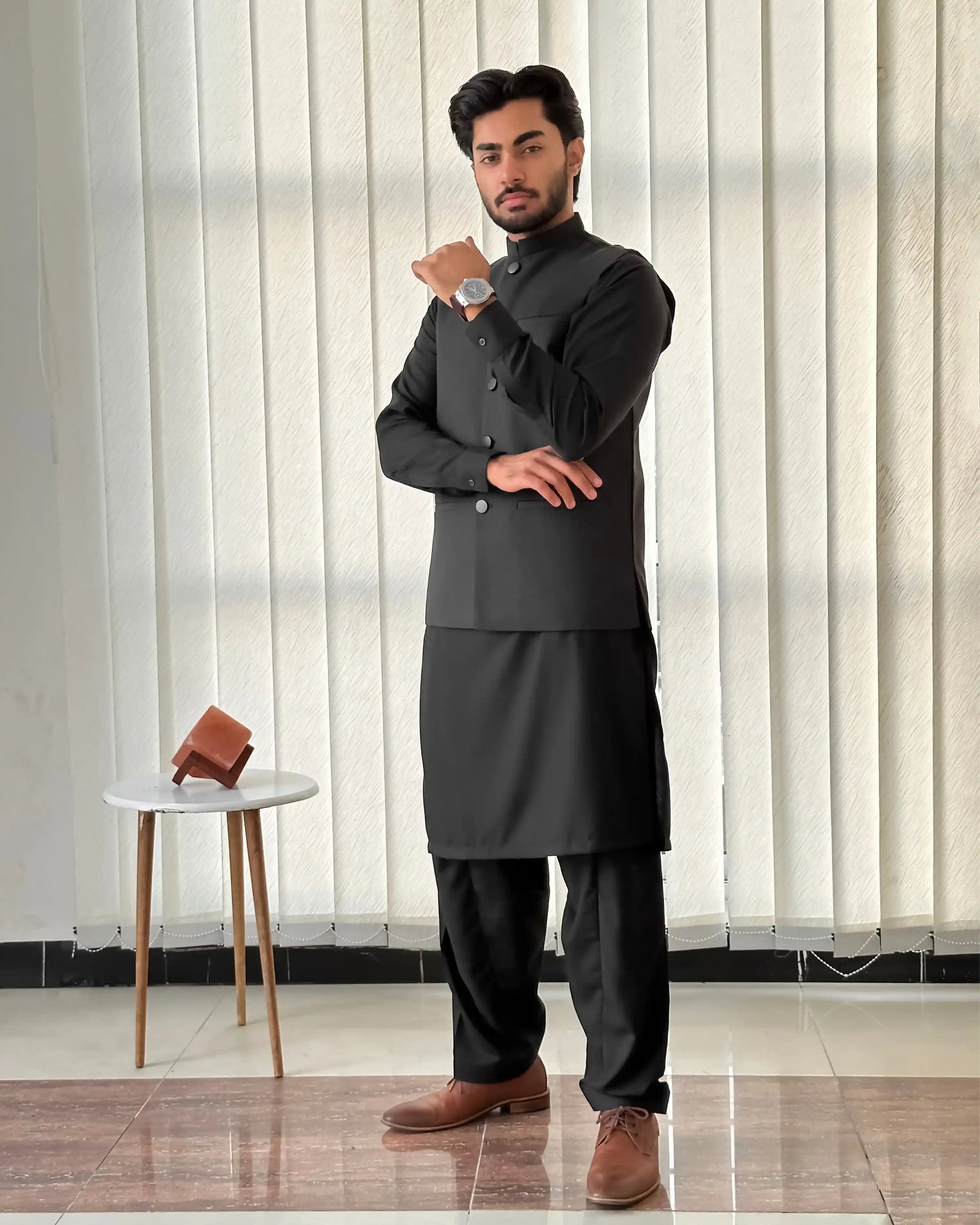 Black Kurta Shalwar with Suiting Waistcoat - Straight Cut - Men