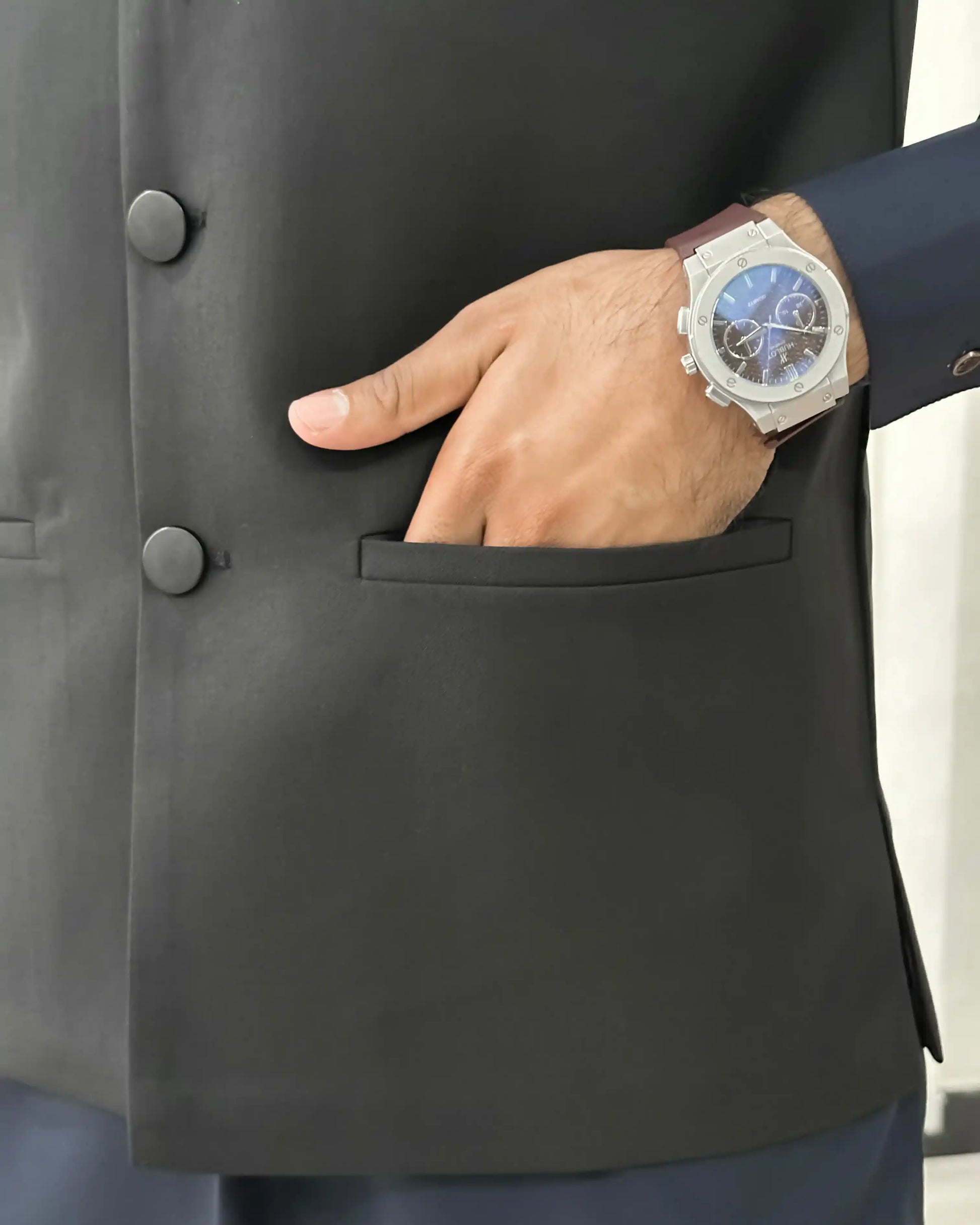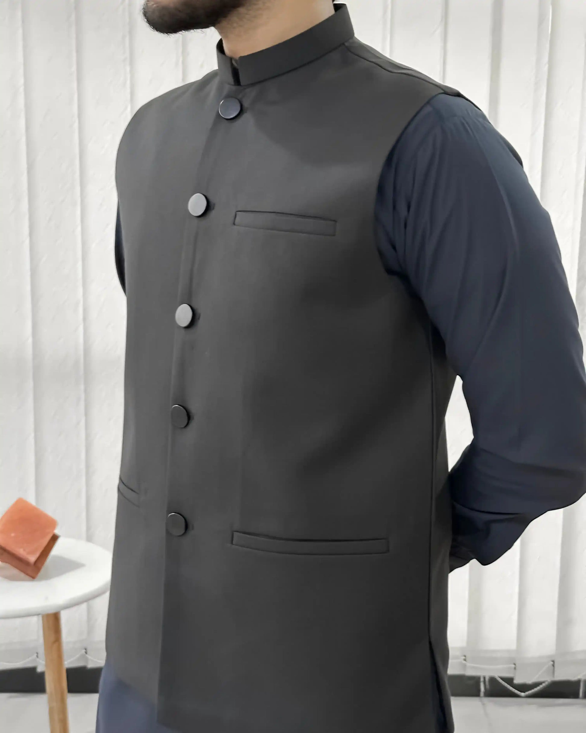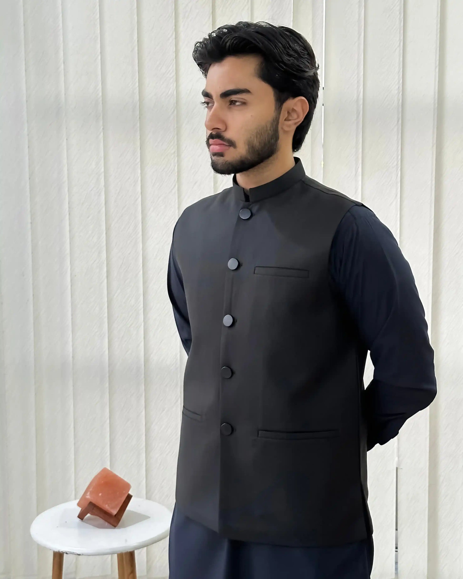 Black Suiting Waistcoat For Men—Blending Eastern Elegance With Modern Style. Featuring A Straight Cut And Classic Buttons, This Waistcoat Adds A Polished Look To Any Formal Or Traditional Outfit.