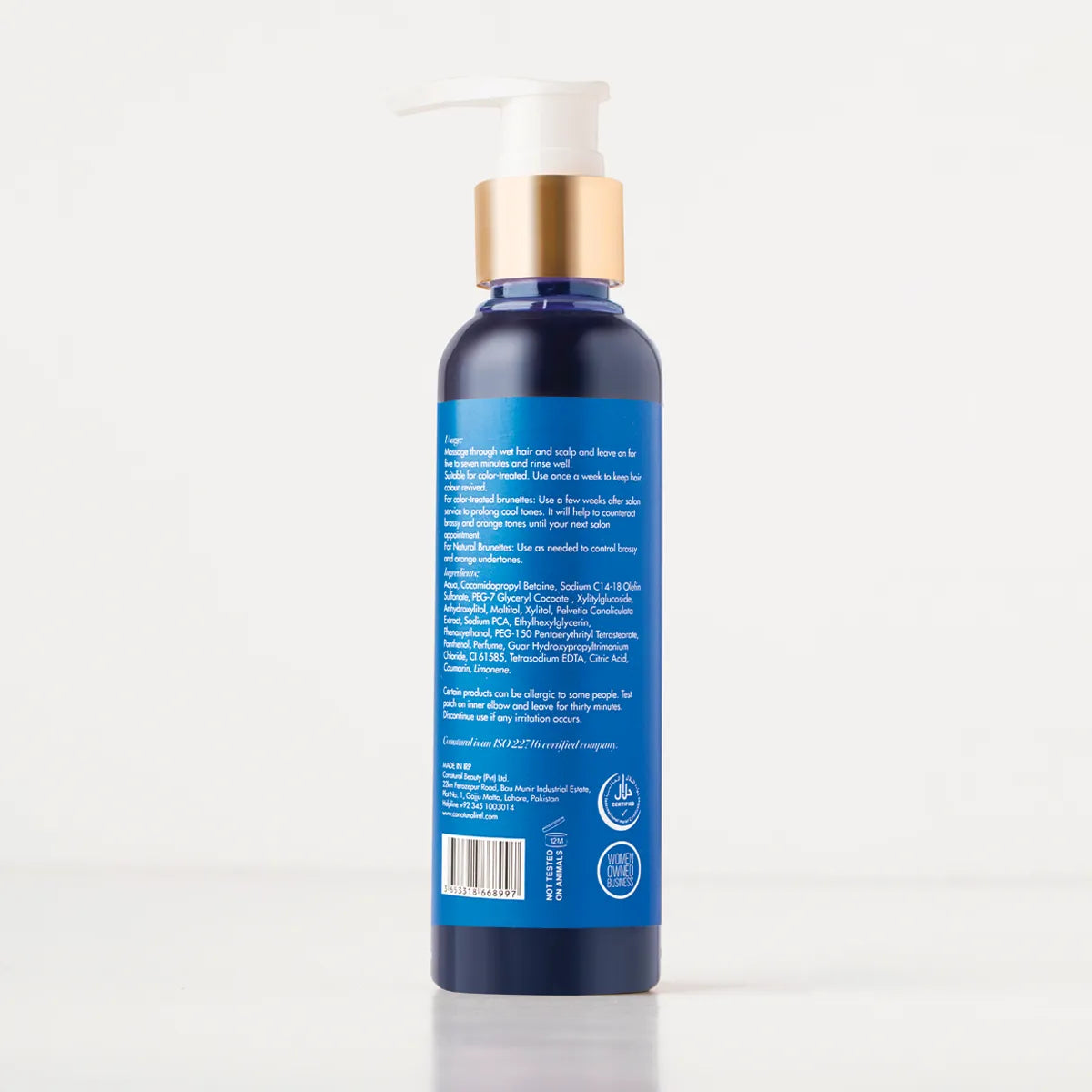 Blue pigments in our shampoo actively combat and neutralize orange tones, effectively eliminating any brassy effects in highlighted brunette hair.