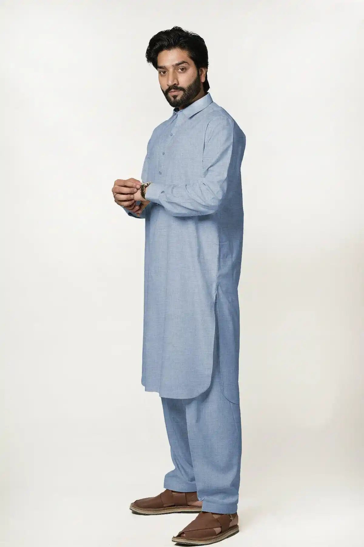 Blue Shirt Collar Kameez Shalwar in Cotton