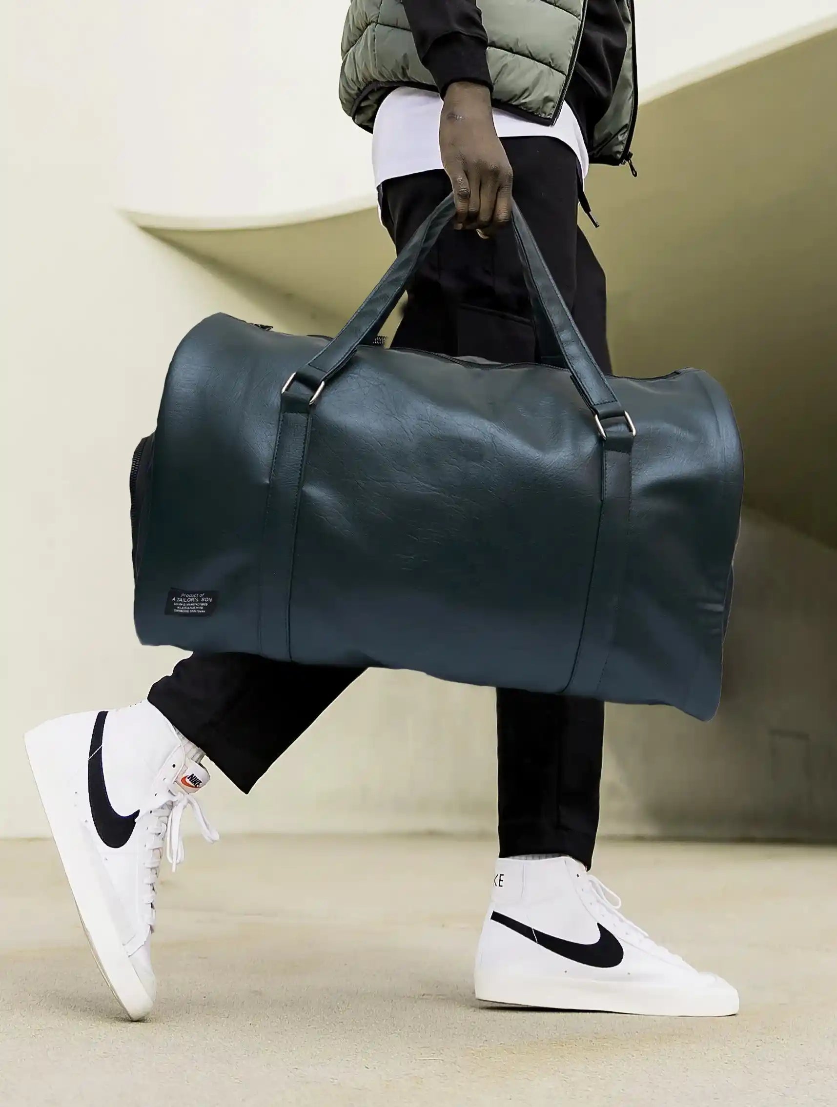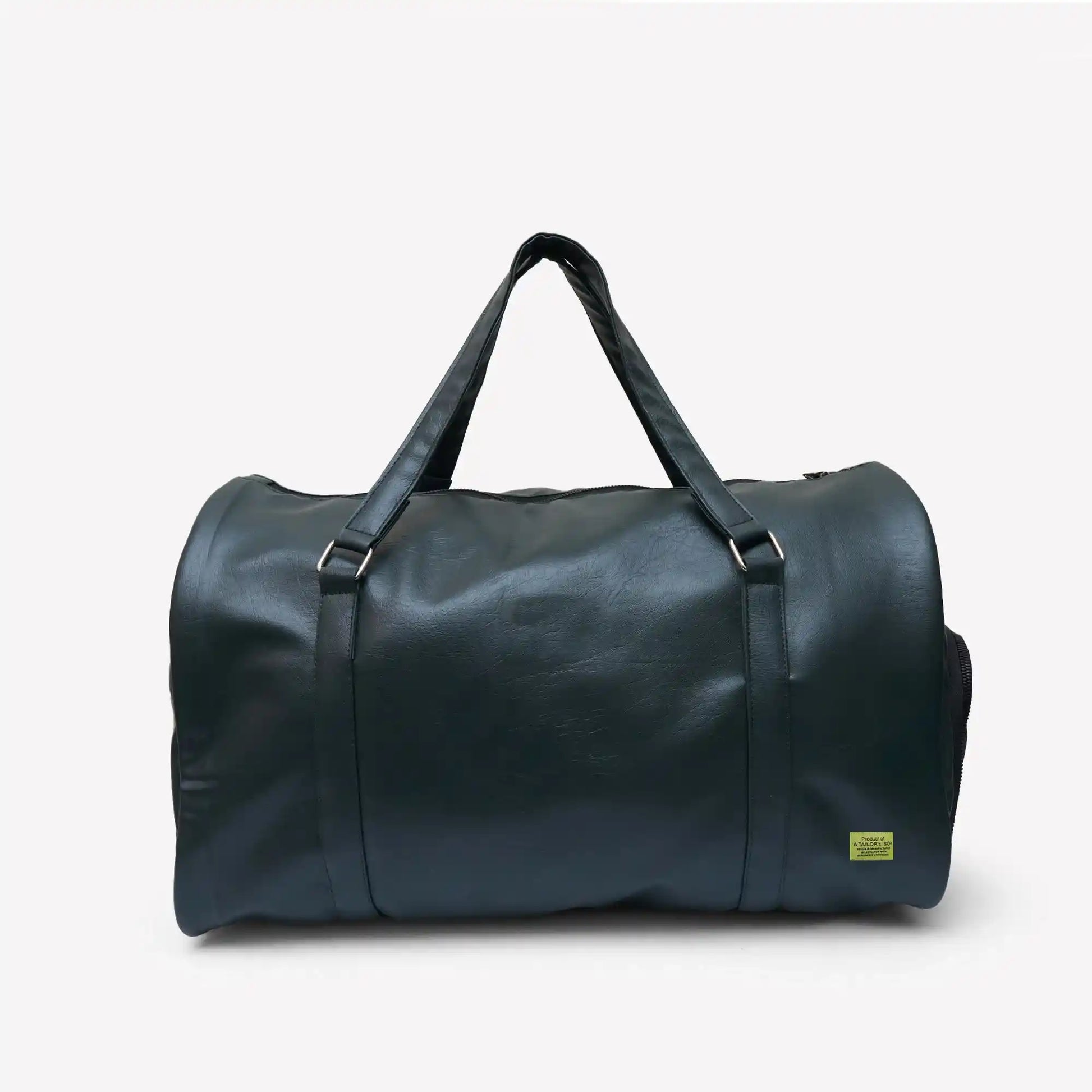 The House's newest essential, the A Tailor Son British Green Duffle bag, is a practical and elegant design. Crafted in Texture synthetic leather inspired by the House's archives, A side zipped compartment to carry a pair of shoes. The folding top handles and adjustable, removable shoulder strap allow the bag to be carried by hand, worn over the shoulder or crossbody.