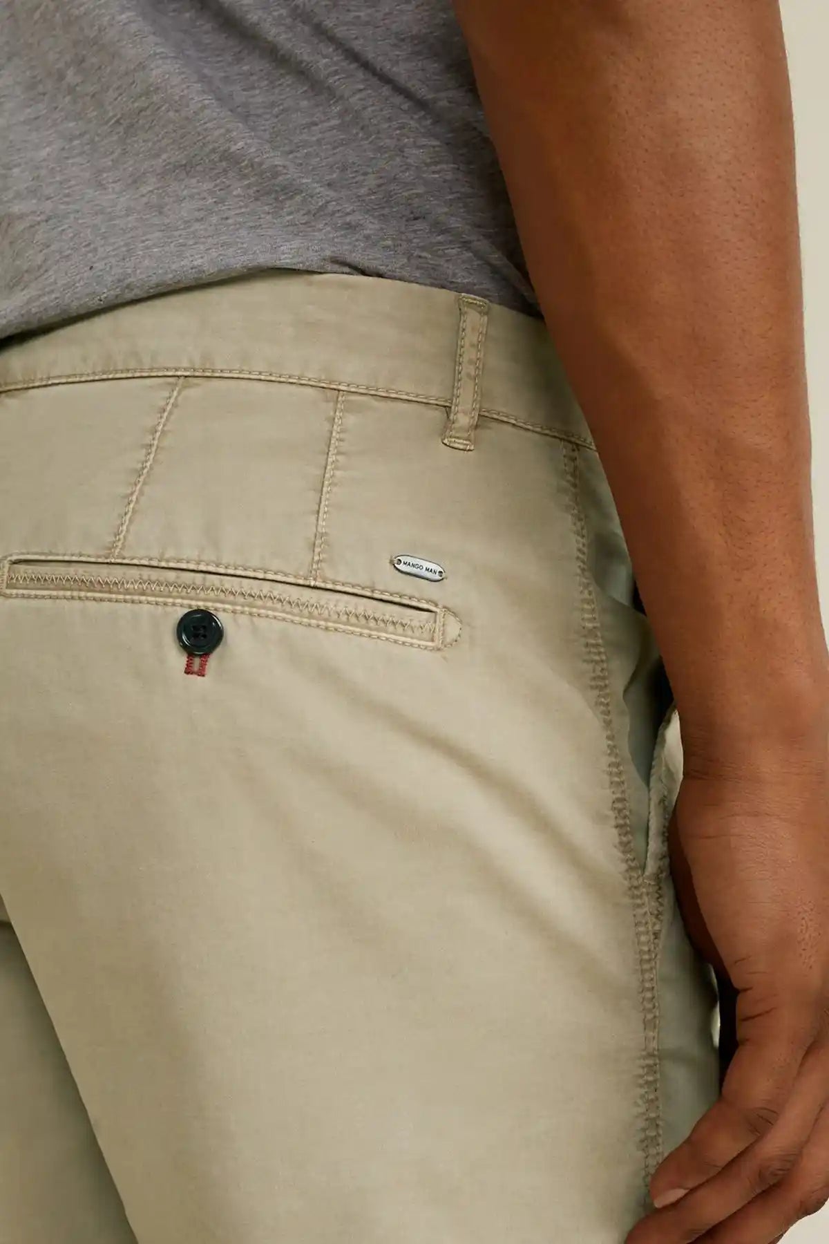Smart collection. Chinos style. Stretch cotton fabric. Two side pockets. Coin pocket. Two welt pockets with button on the back. Loops. Decorative seams. Zip and one button fastening.