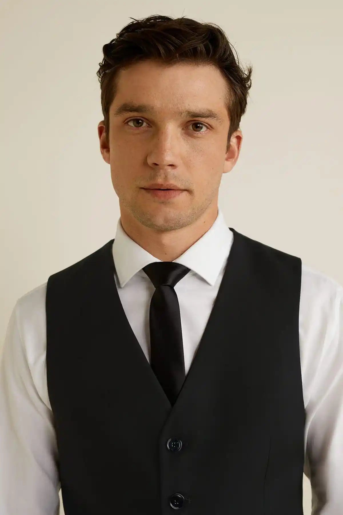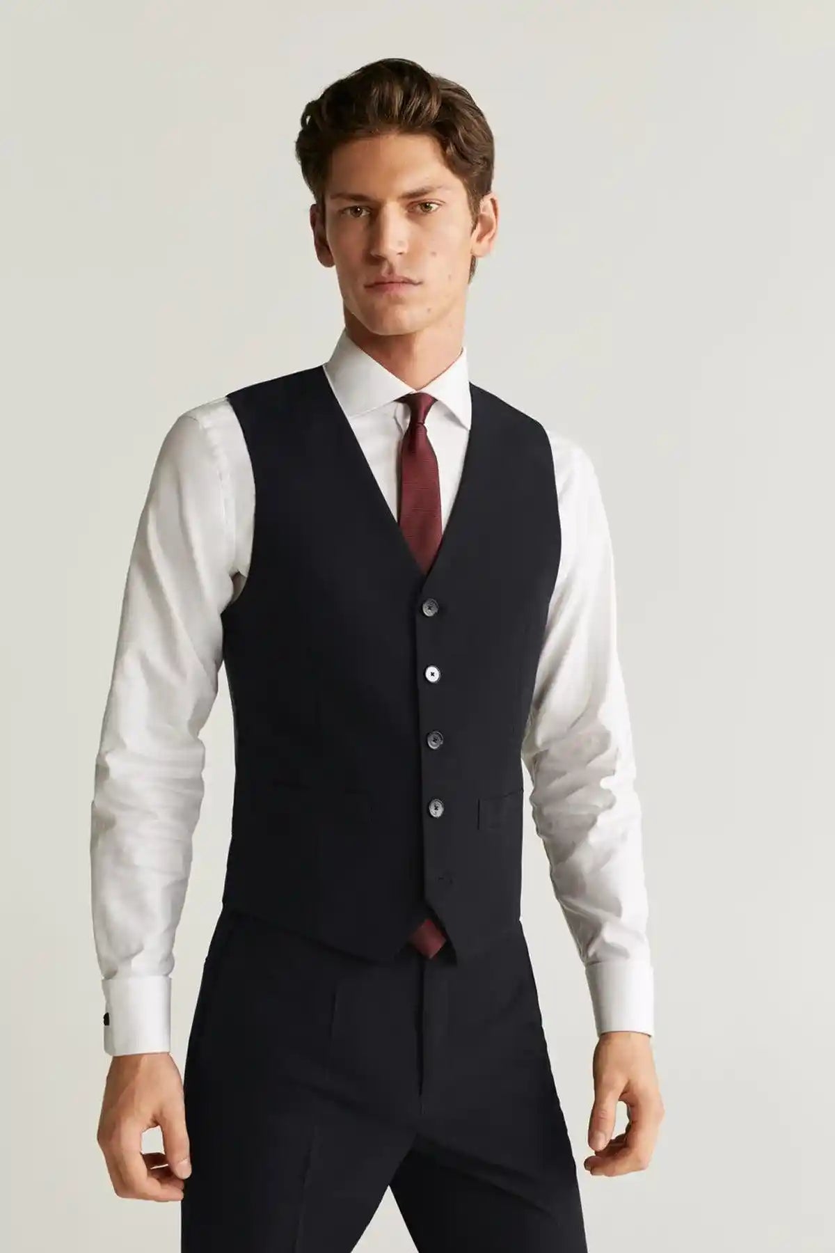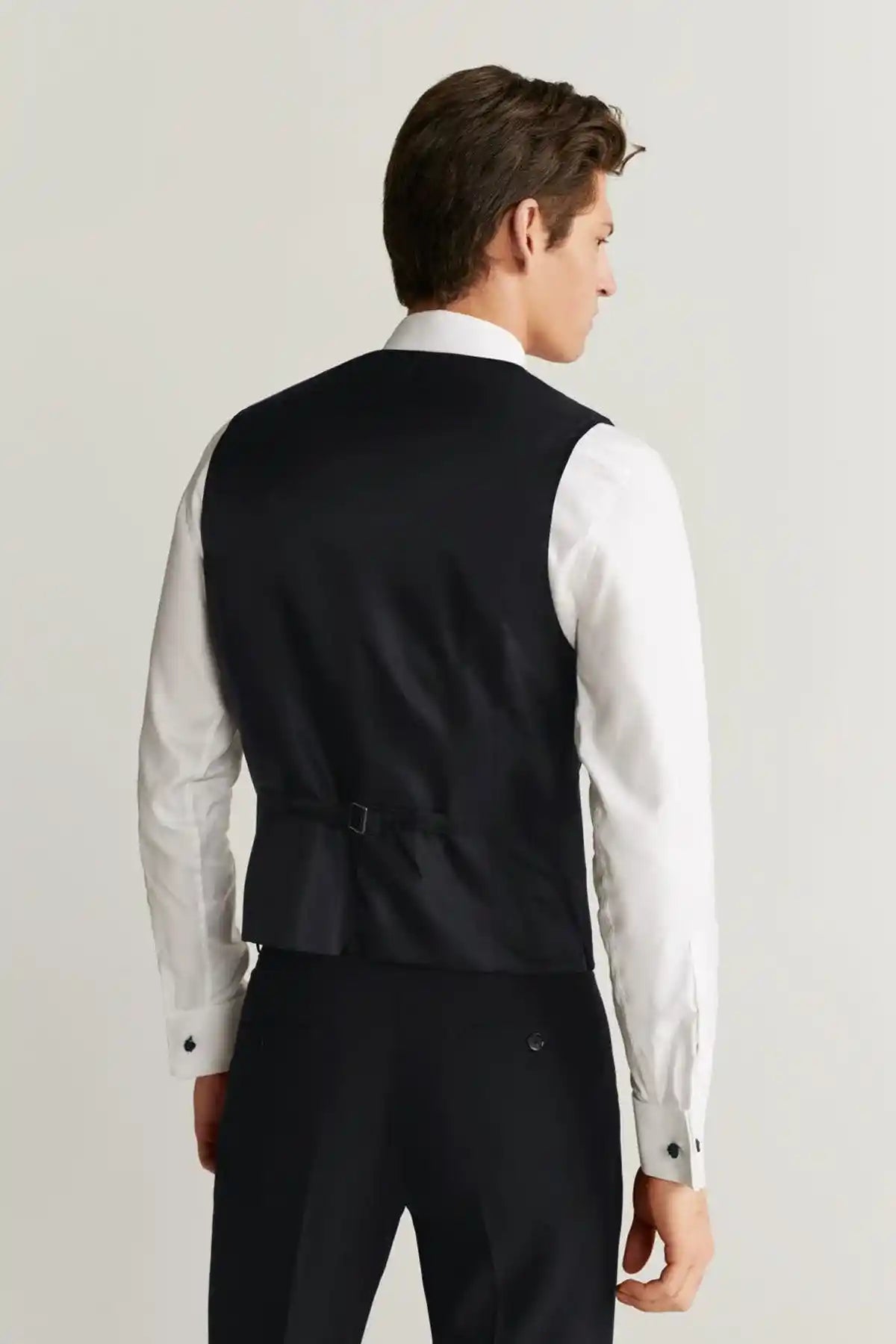 Tailored line. Short design. Slim fit. V-neck. Two side pockets. Sleeveless. Adjustable buckles. Button up. Inner lining. Inner pocket.
