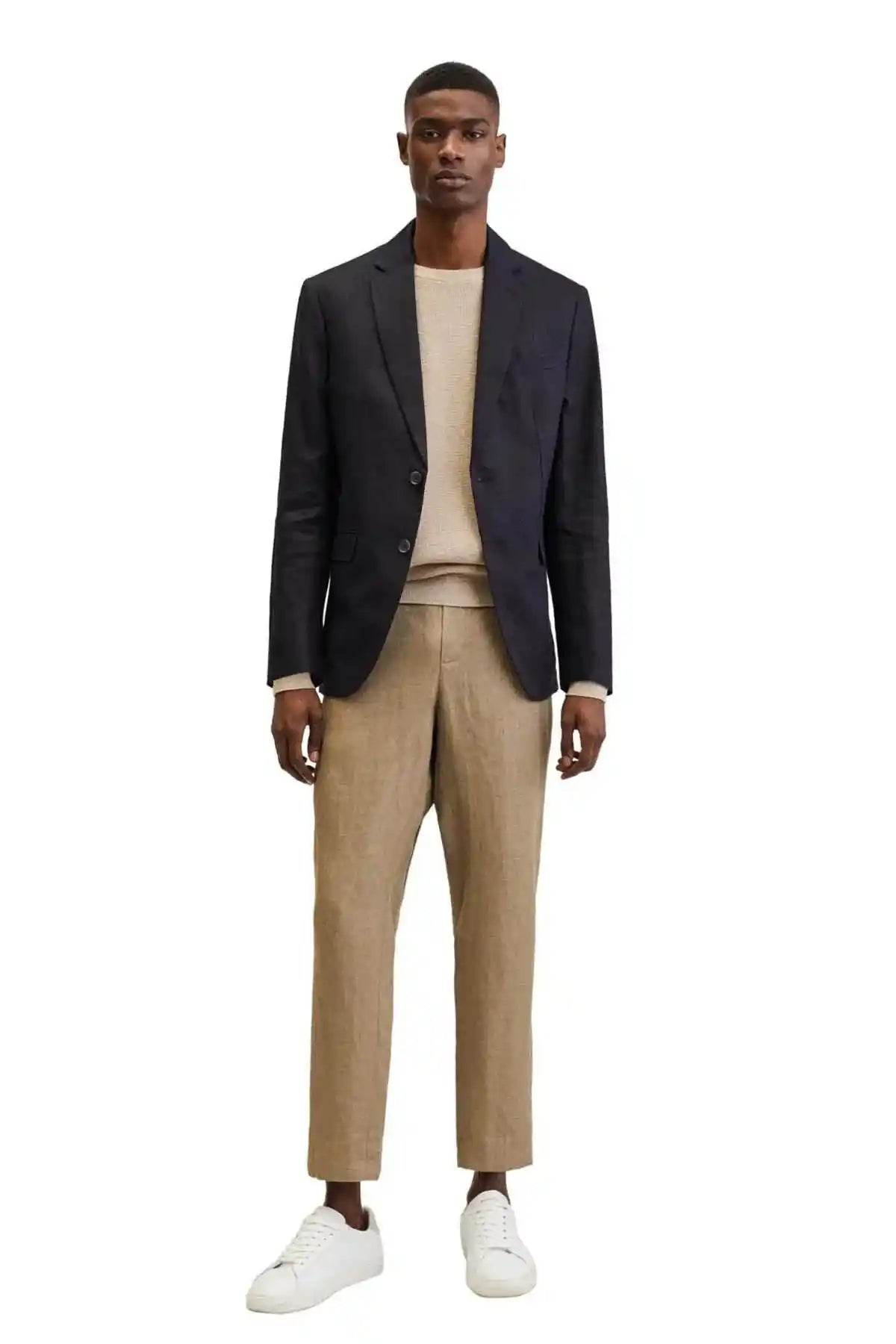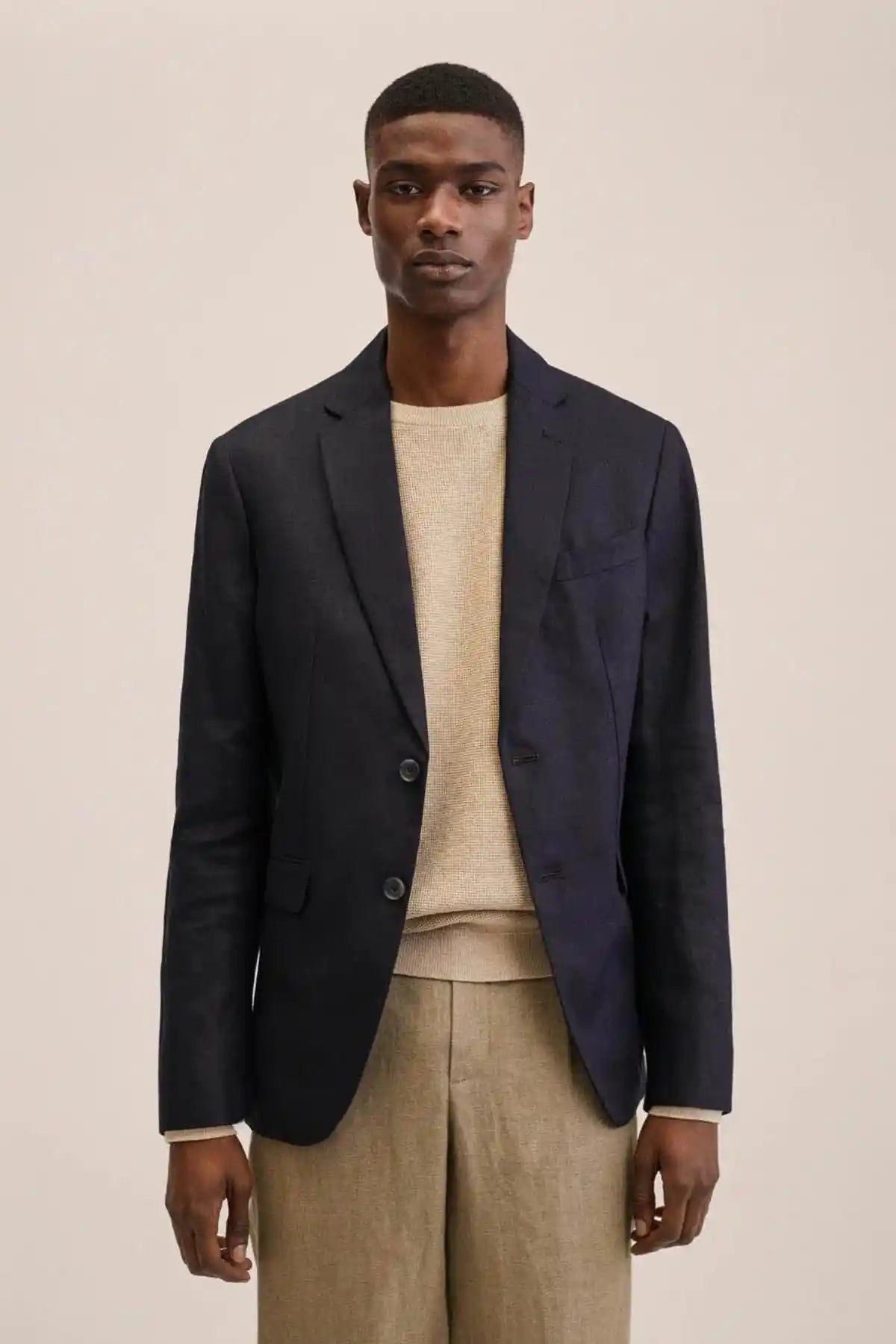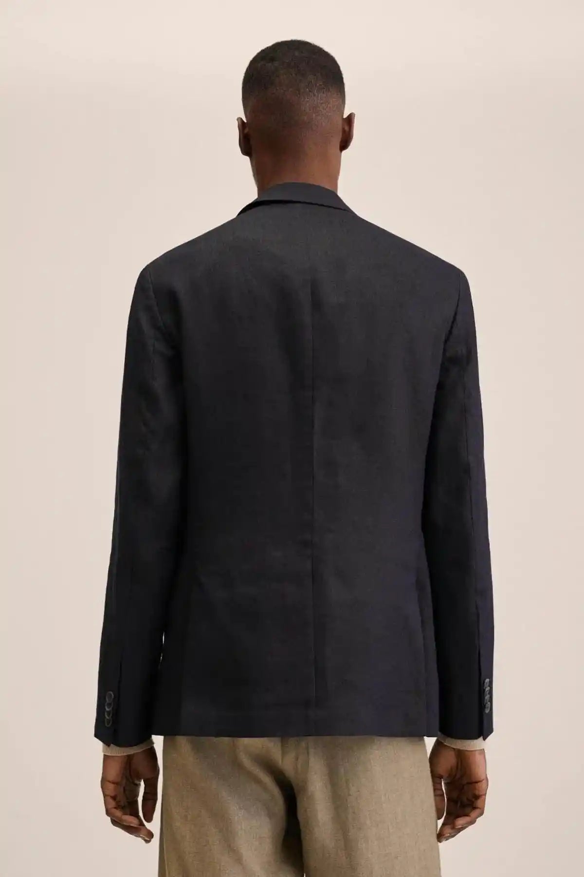 Standard design. Light fabric. Slim fit. Long sleeve. Front closure. Regular neck. Lining only. 100% Linen. Short design. Lapel with notch. Long buttoned sleeve. Welt pocket on the chest. Two side patch pockets. Button up. Inner lining. Inner pockets. The excellent qualities of this natural fibre, such as its lightness and breathability, make this fabric particularly suitable during warm weather. Elegant and comfortable as well, this garment is a perfect choice.. The model is 190 cm tall and is wearing a size 50.