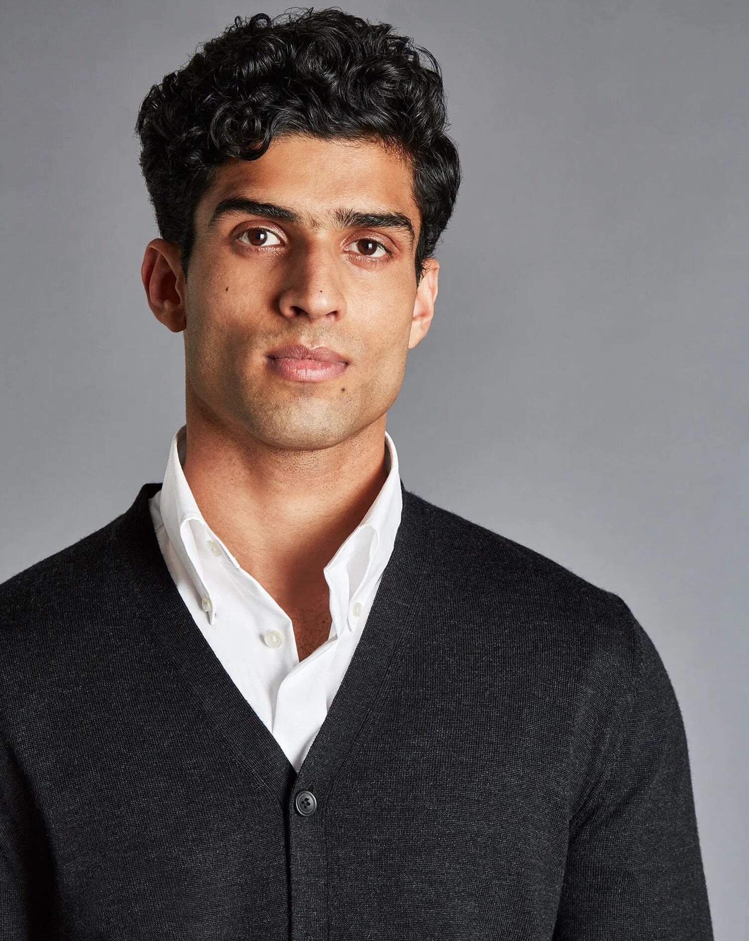 This cardigan is made from 100% extra fine merino wool in a jersey knit, to a simple and elegant shape. The merino fibers make it lightweight and soft, yet offer good insulation in cold weather, and the piece has been garment-washed for extra softness. Shaped to a V-neck with a six-button fastening and ribbed hem and cuffs, this is a straightforward and failsafe cardigan; a suitable middle layer for both casual and formal looks.