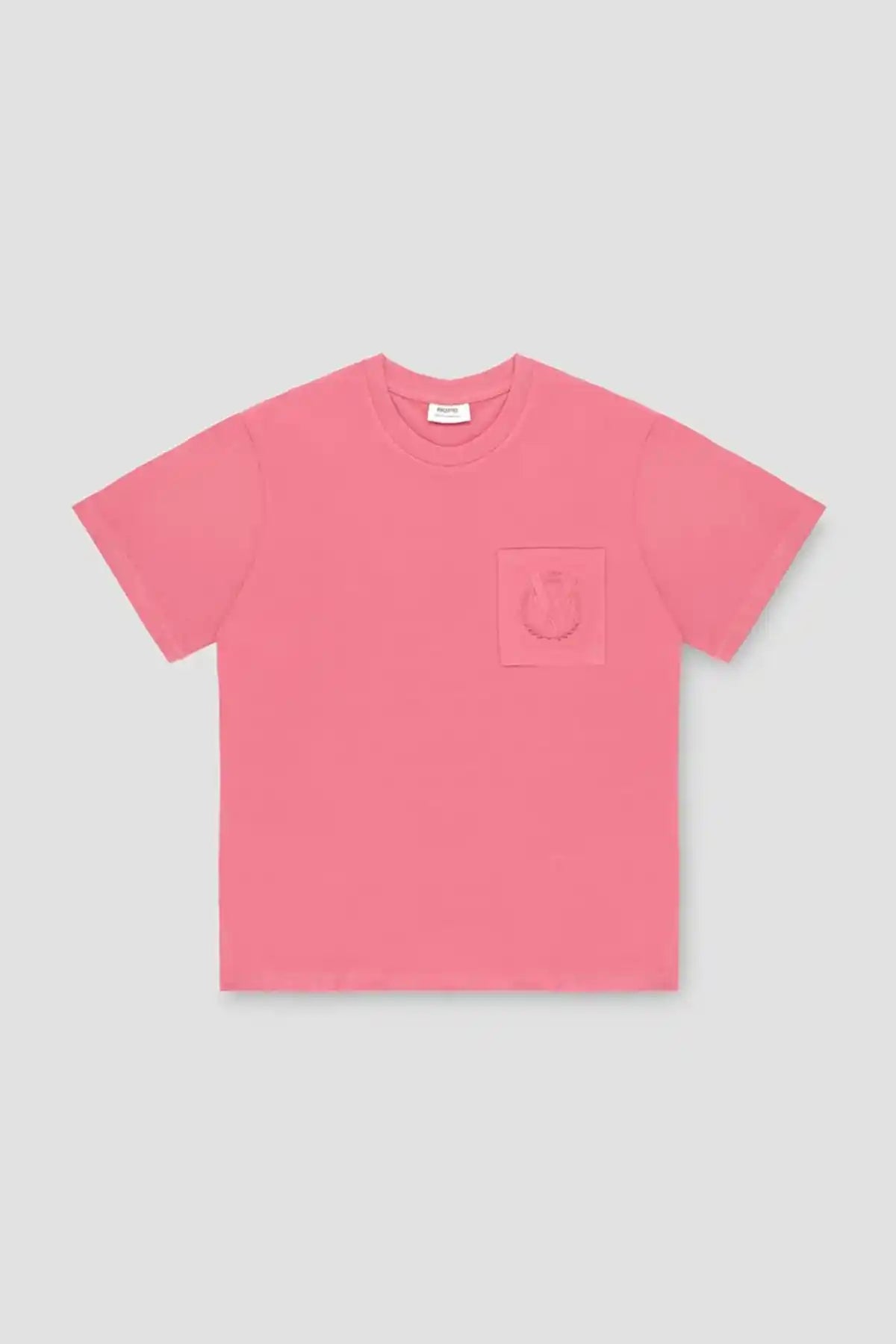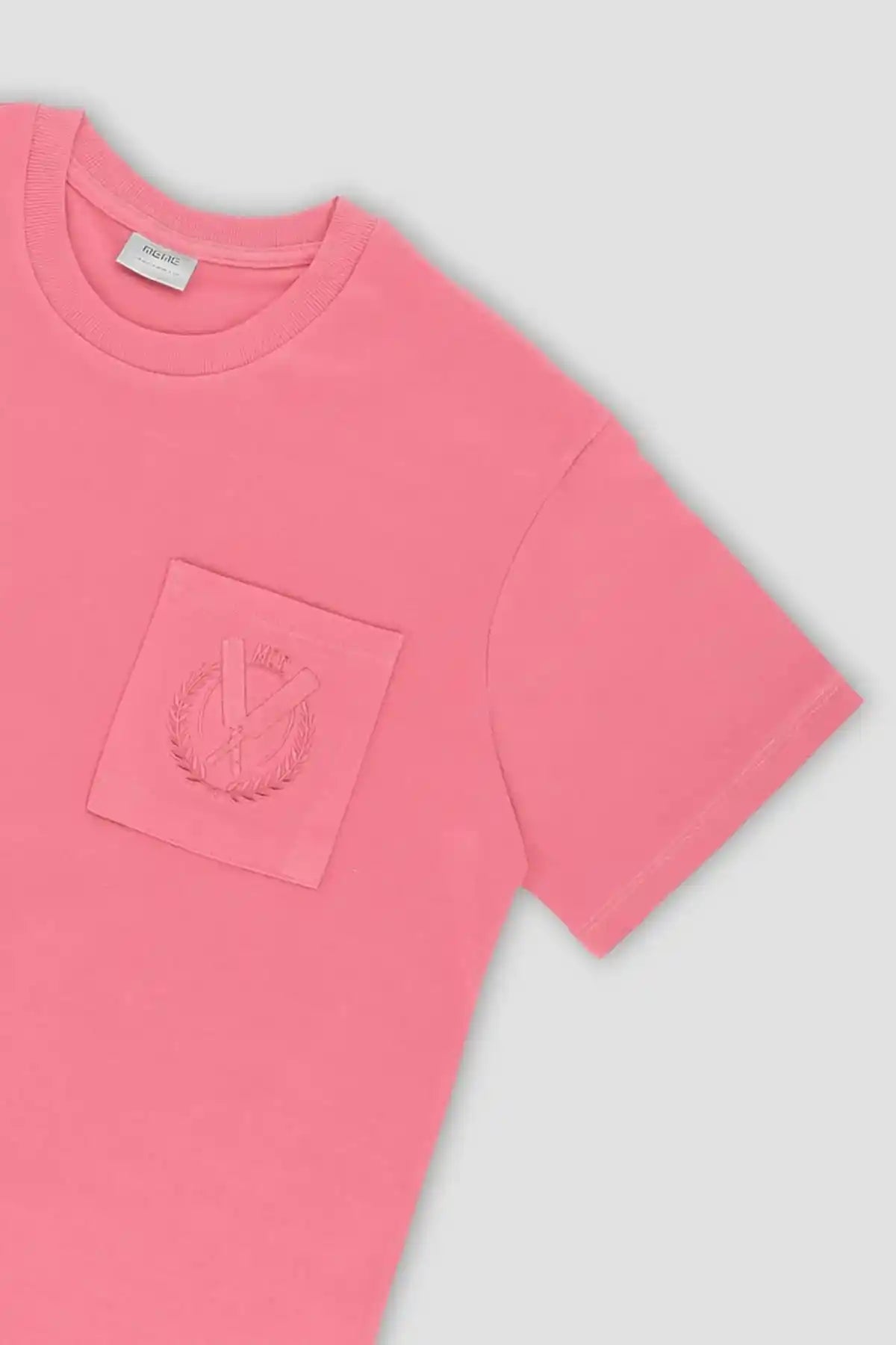 100% Cotton. Muted And Comfortable Bias Binding Crew Neck Athleisure T-Shirt Featuring Chest Embroidered Patch Pocket And Short Sleeves.