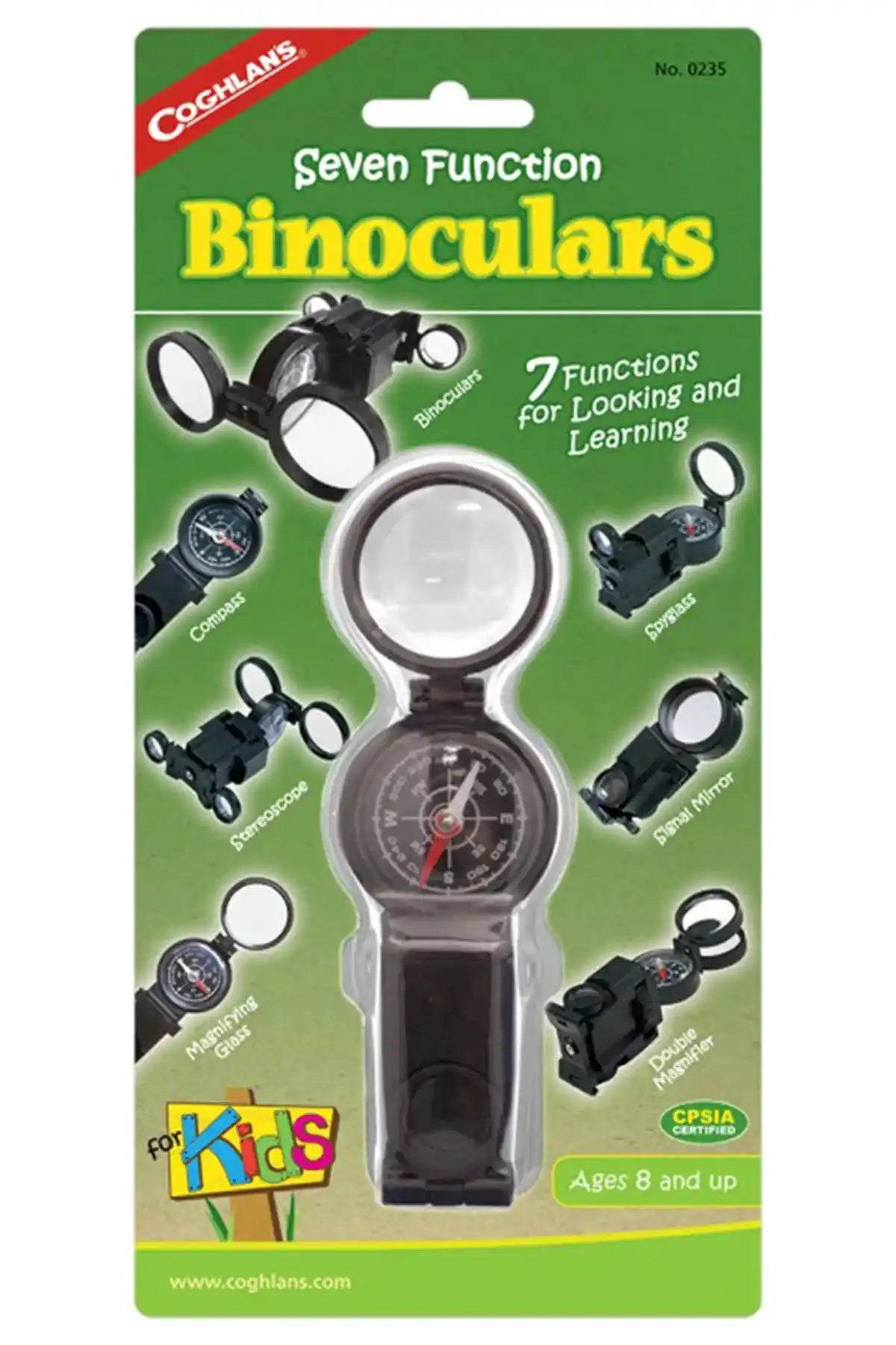 These feature seven separate functions for looking and learning binoculars monocular spyglass magnifier compass stereoscope and signal mirror. The binoculars can be adjusted with the thumbwheel.