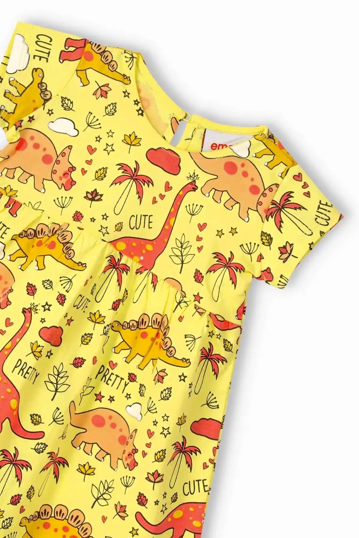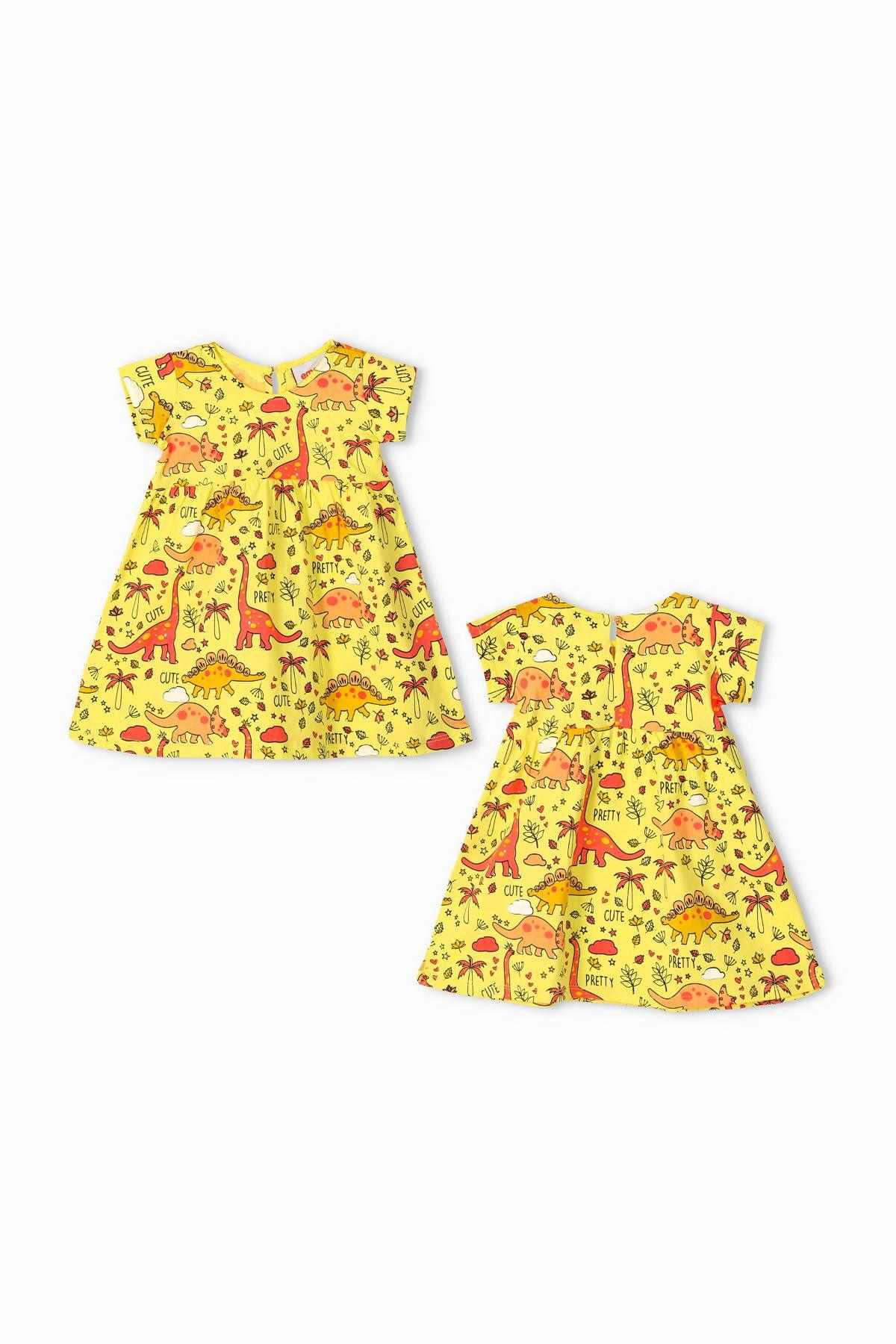 Trendy And Comfortable Conversational Print Crew Neck A-Line Dress Featuring Short Sleeves. Waist Gathers. Wide Hem