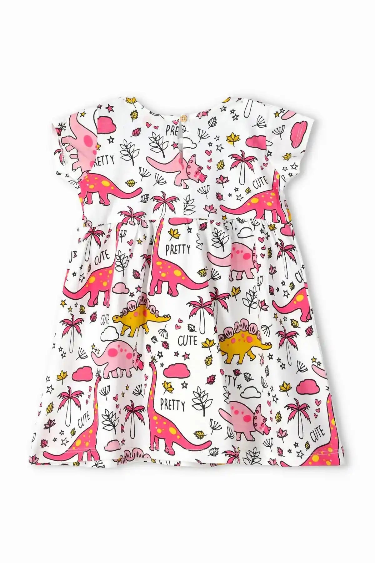 Trendy And Comfortable Conversational Print Crew Neck A-Line Dress Featuring Short Sleeves. Waist Gathers. Wide Hem