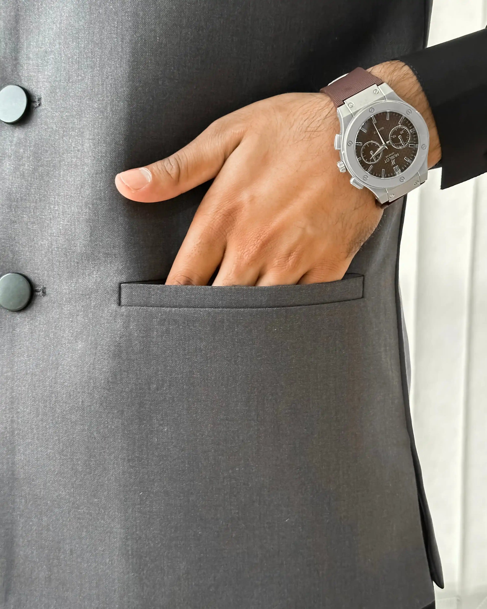 Gray Suiting Waistcoat For Men—Blending Eastern Elegance With Modern Style. Featuring A Straight Cut And Classic Buttons, This Waistcoat Adds A Polished Look To Any Formal Or Traditional Outfit.