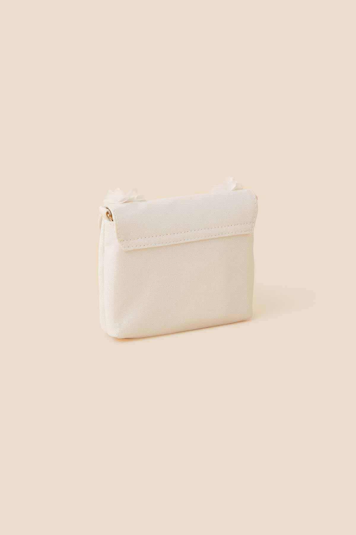 The perfect accessory for trips down the aisle and other celebration days, this bag boasts a soft and shimmery profile with a fold over flap to fasten. To the flap is a bouquet of fabric florals, with pretty pearls resting at the centre. Simply sling it over their shoulder (or the back of the grown ups' chair) with the long strap and they'll be good to go.