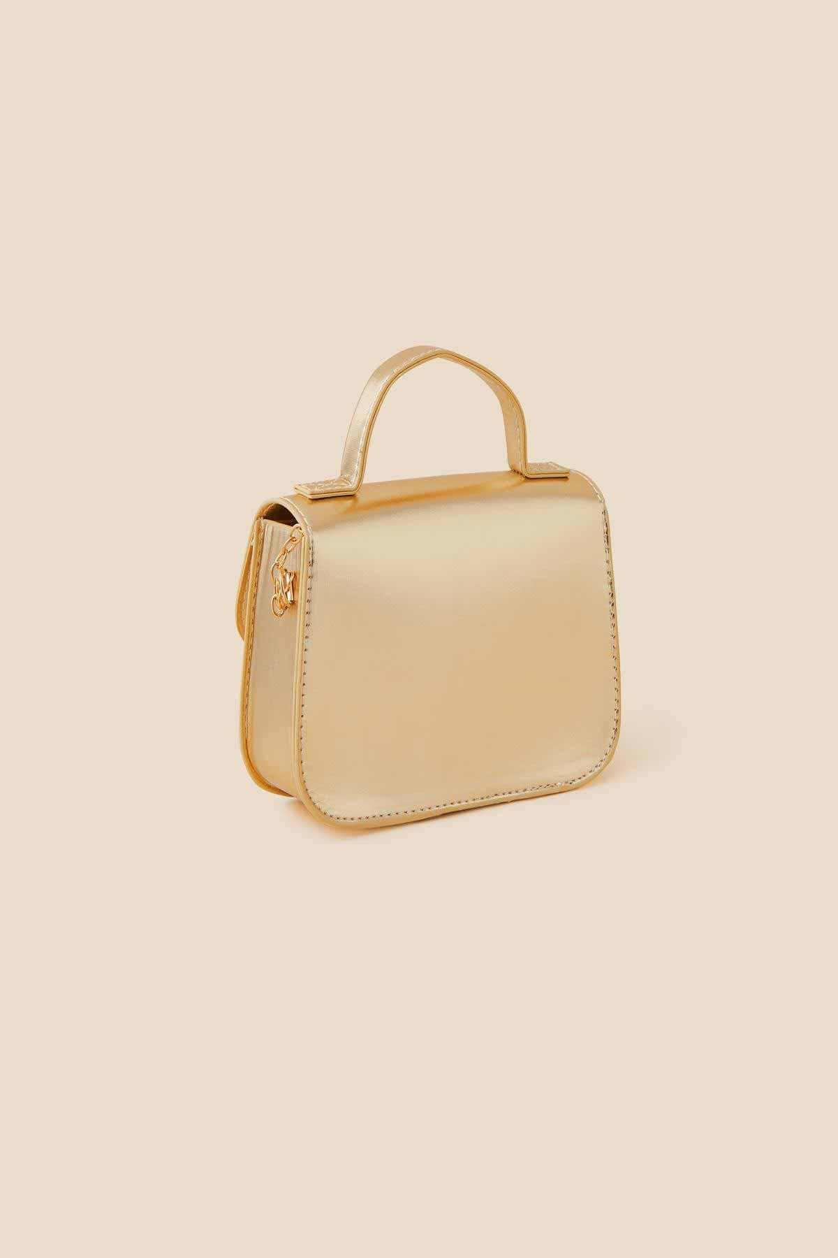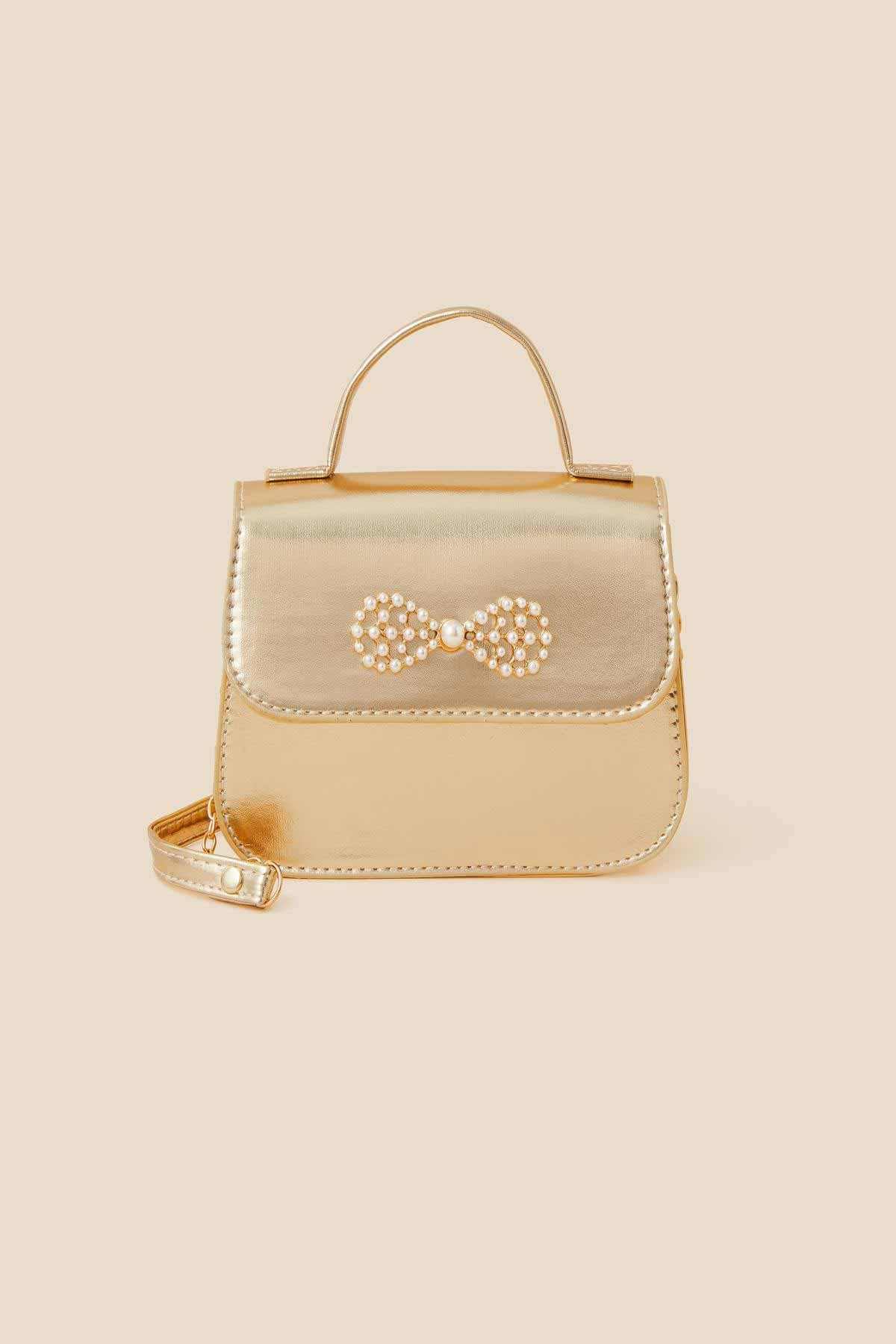 Shining in a gold sheen ready for the festive season, this mini bag features a pearly bow to the front of the fold-over flap. It's finished in a structured silhouette, ready to house all their party bits 'n' bobs. The shoulder strap makes for easy carrying (and flinging over the grown ups' chair when it's time to dance).