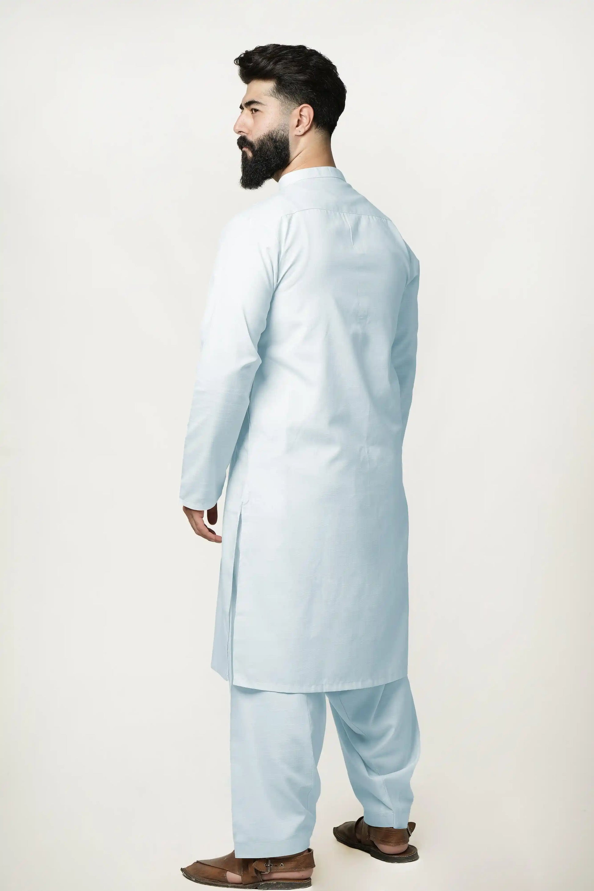 Sky Blue Band Collar Kurta Shalwar In Cotton