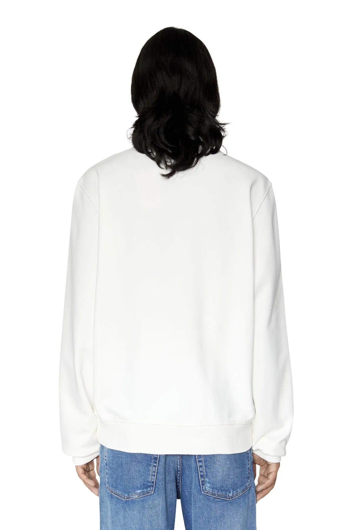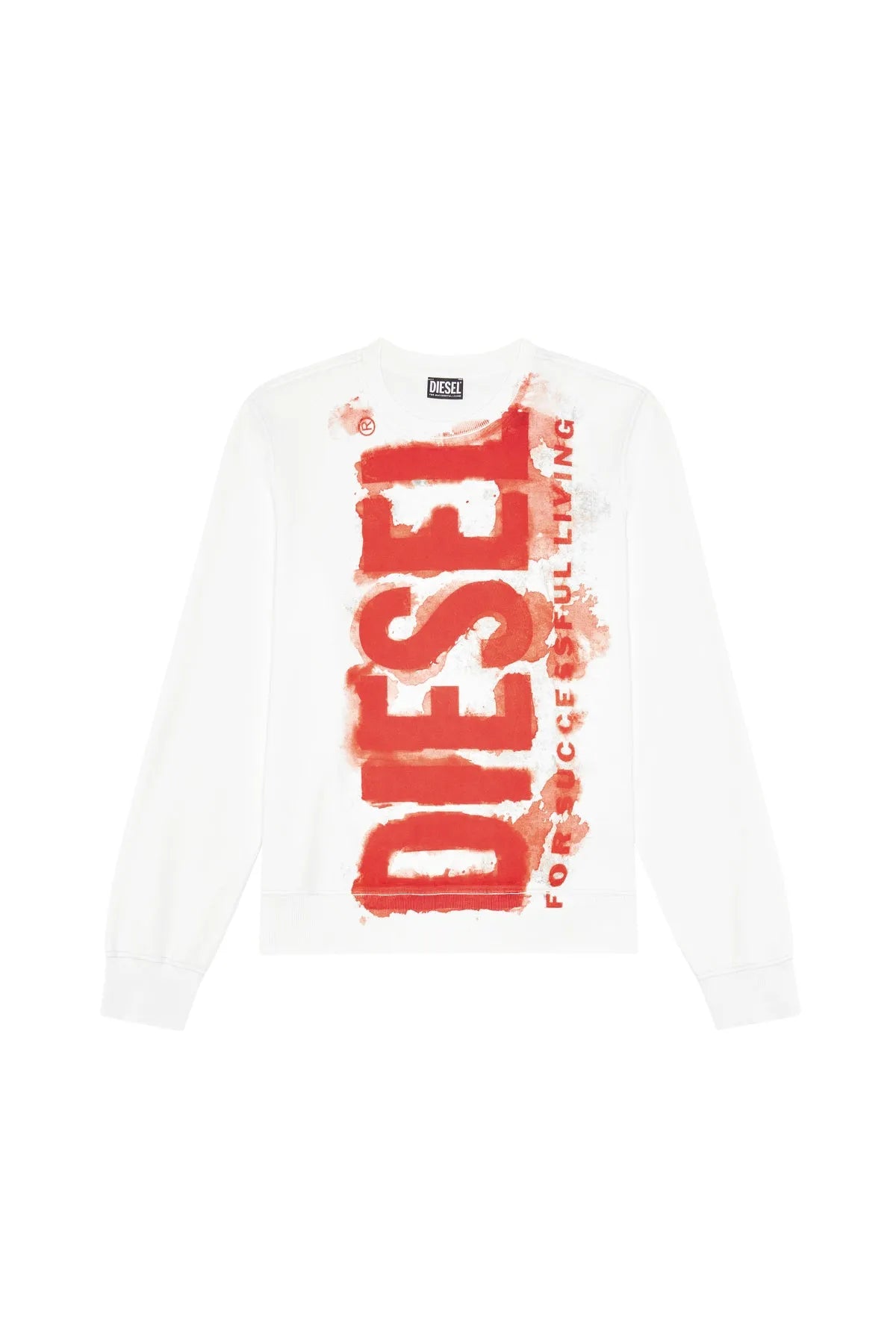 Men's crew-neck sweatshirt with regular fit. Made from loopback cotton jersey, this pigment-dyed style has a splotched, watercolour-style logo plastered all over the front—a result of printing on a damp garment.