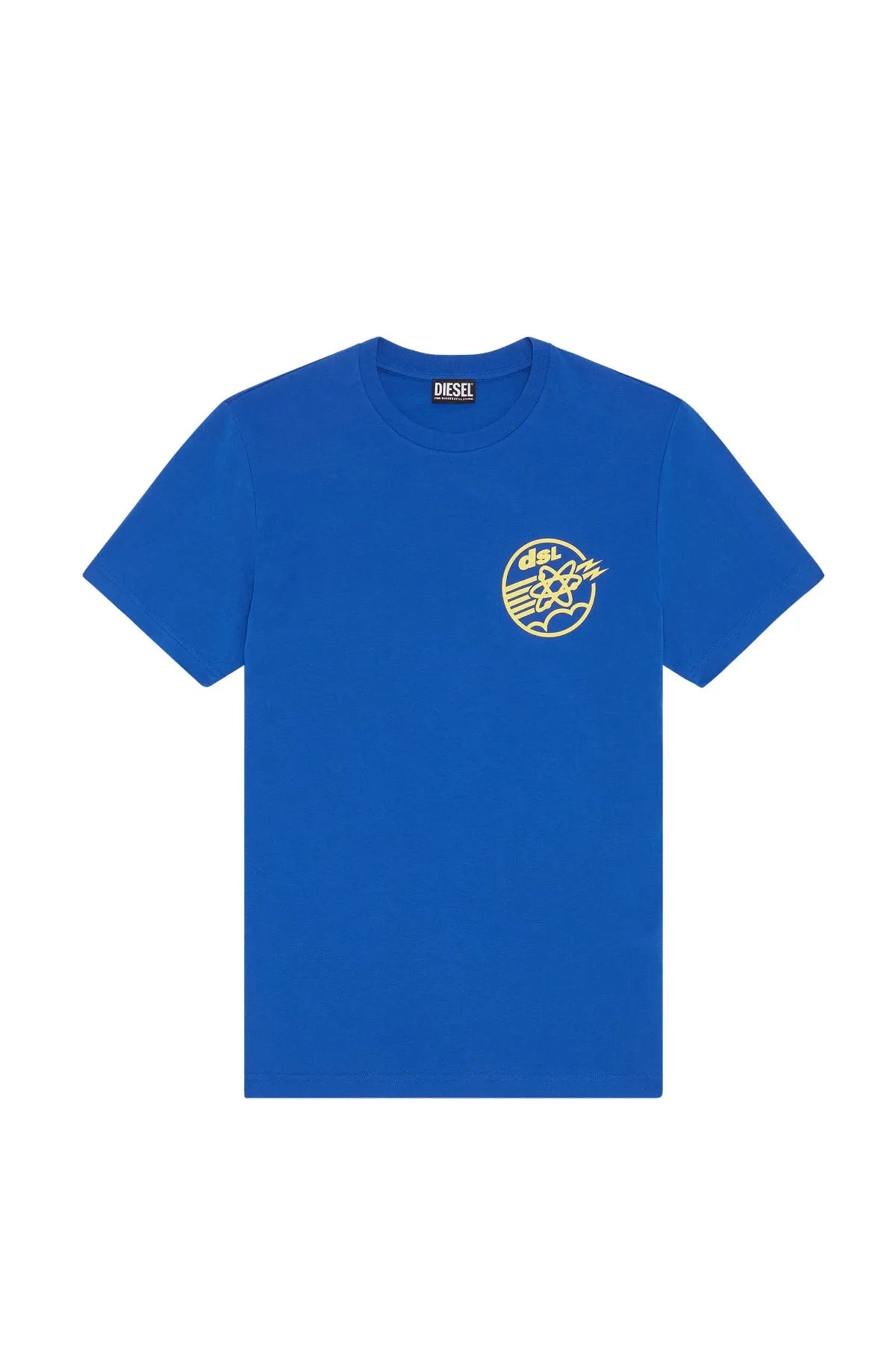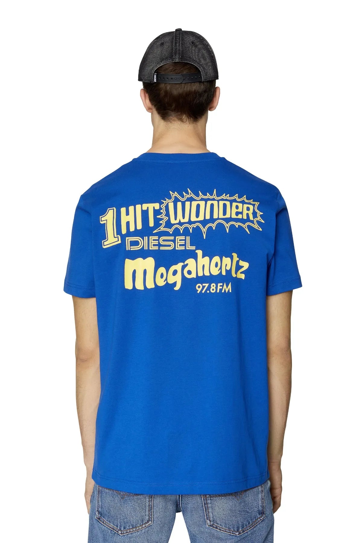 Men's T-shirt crafted from organic cotton and recycled polyester. A slim-fit style, this tee features a small logo print on the chest and a bold graphic with 'Diesel Megahertz' lettering on the back.