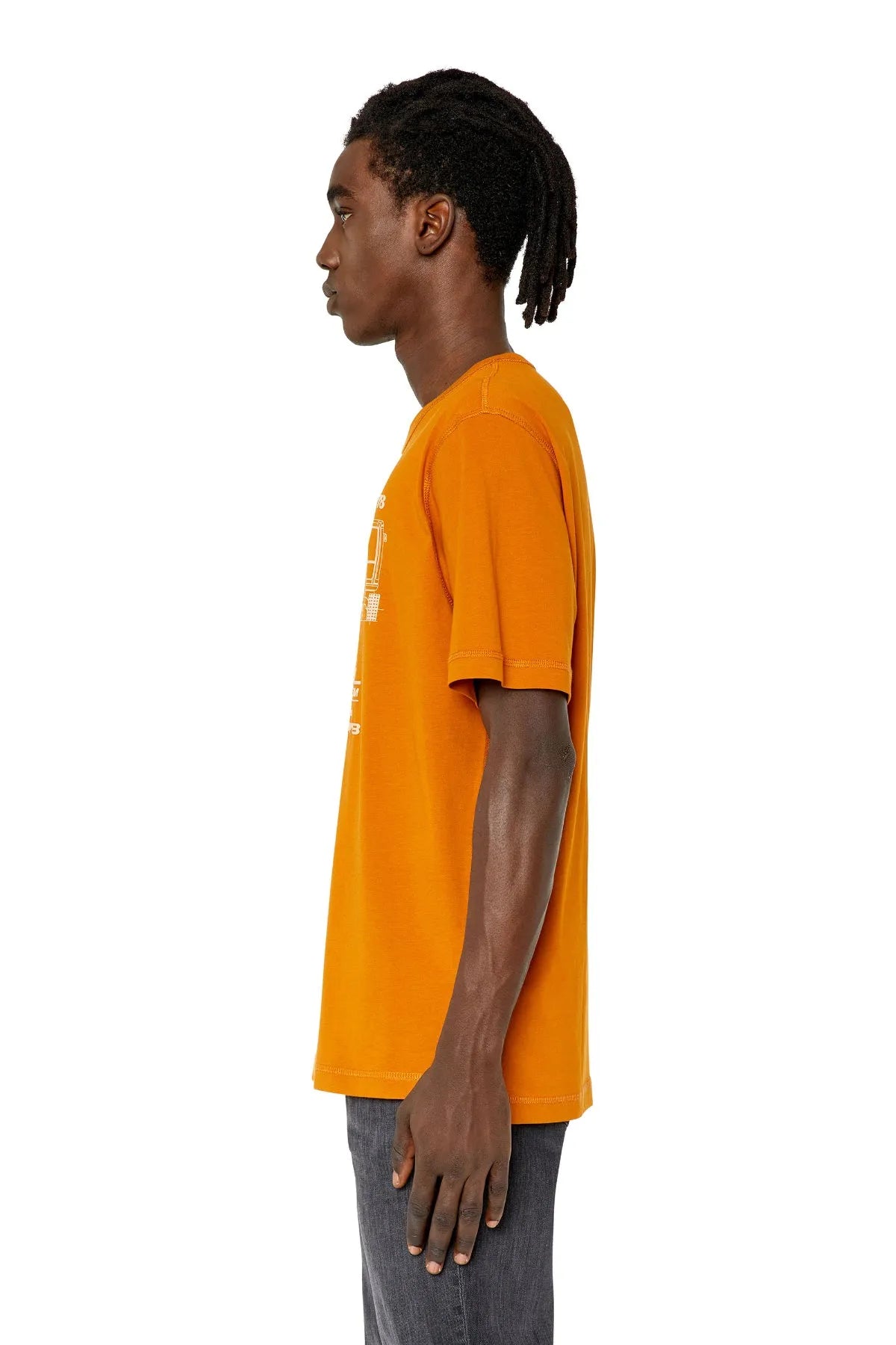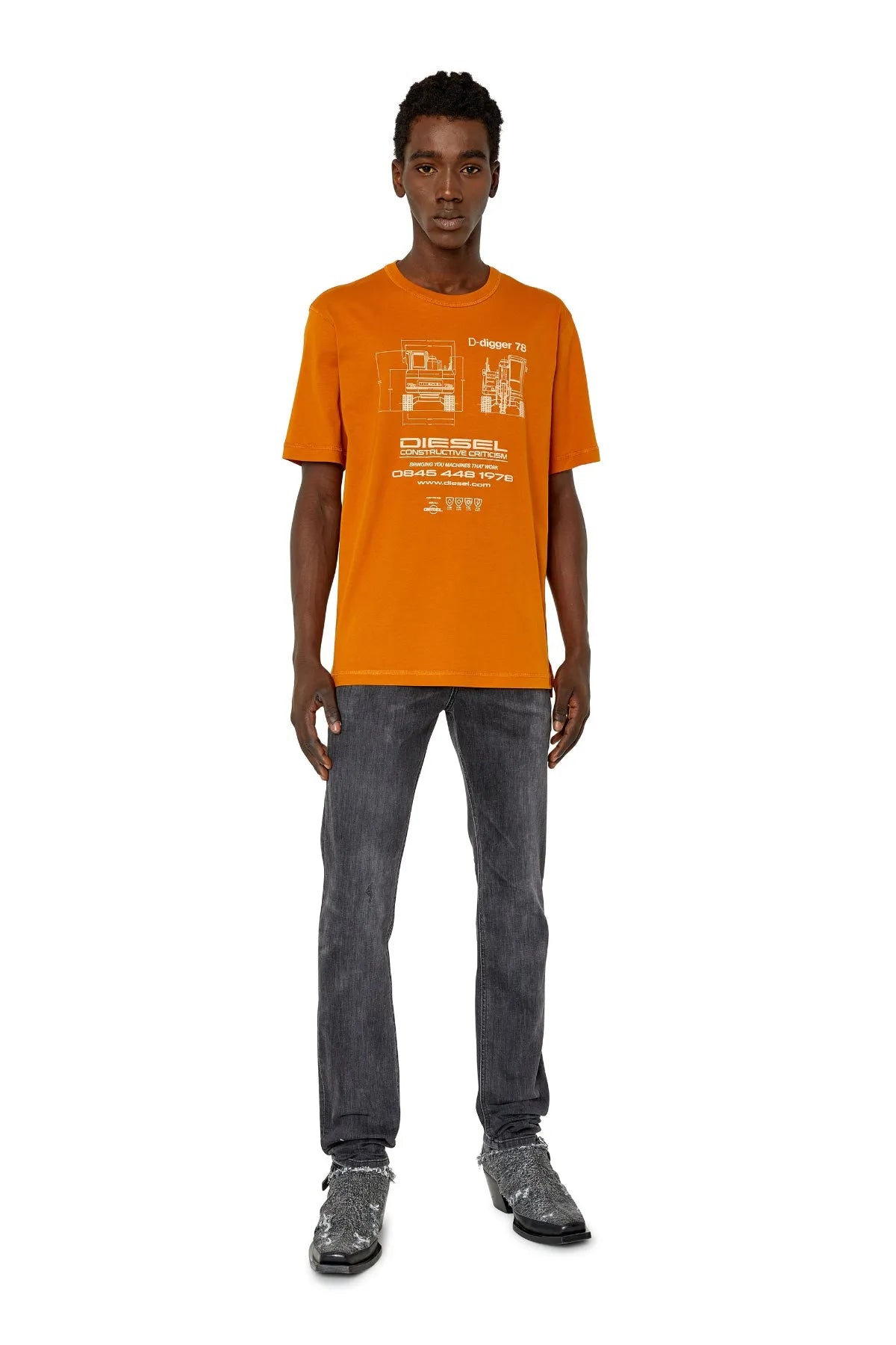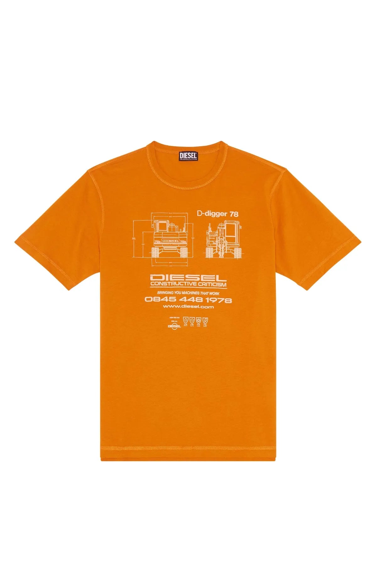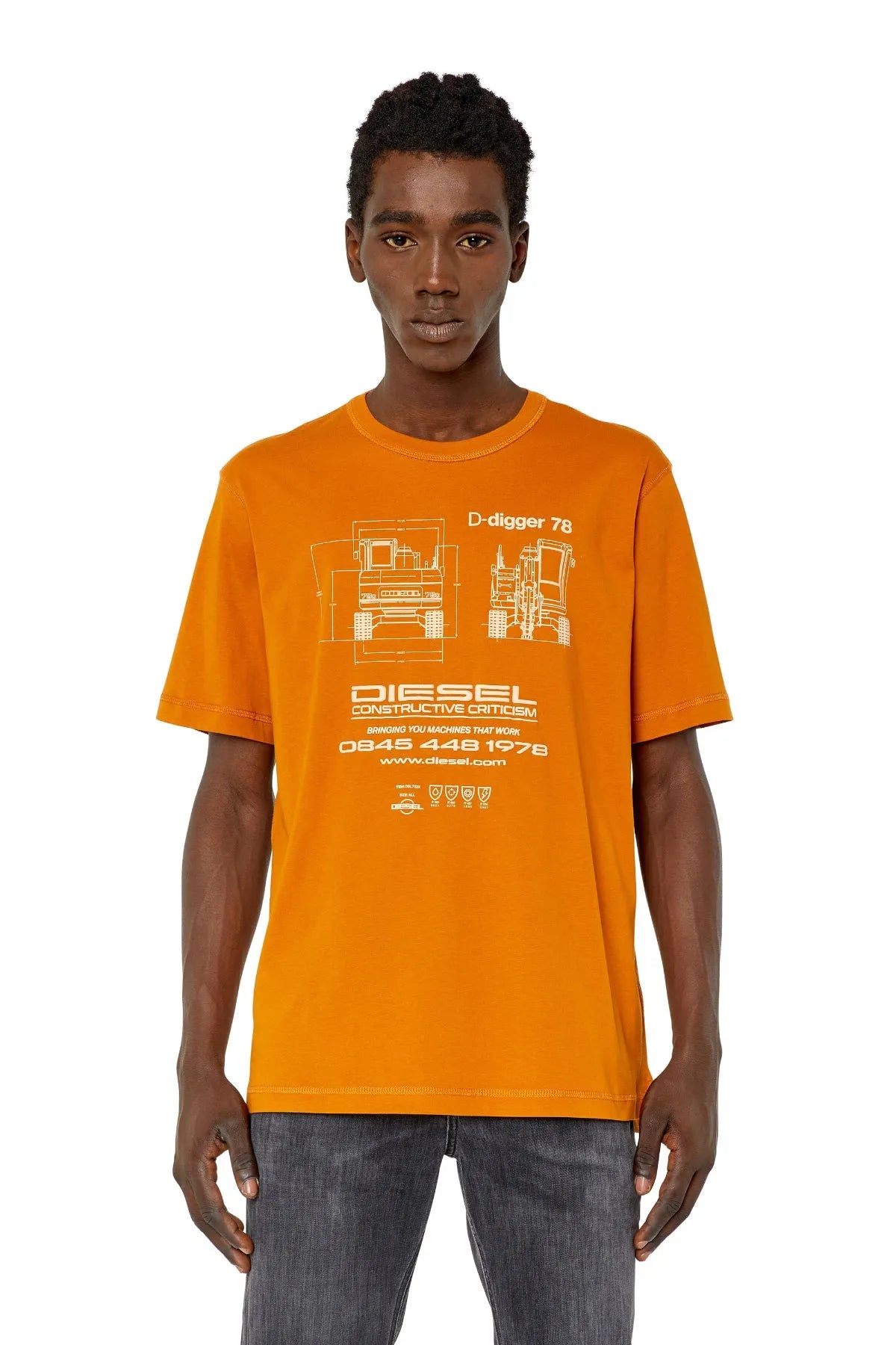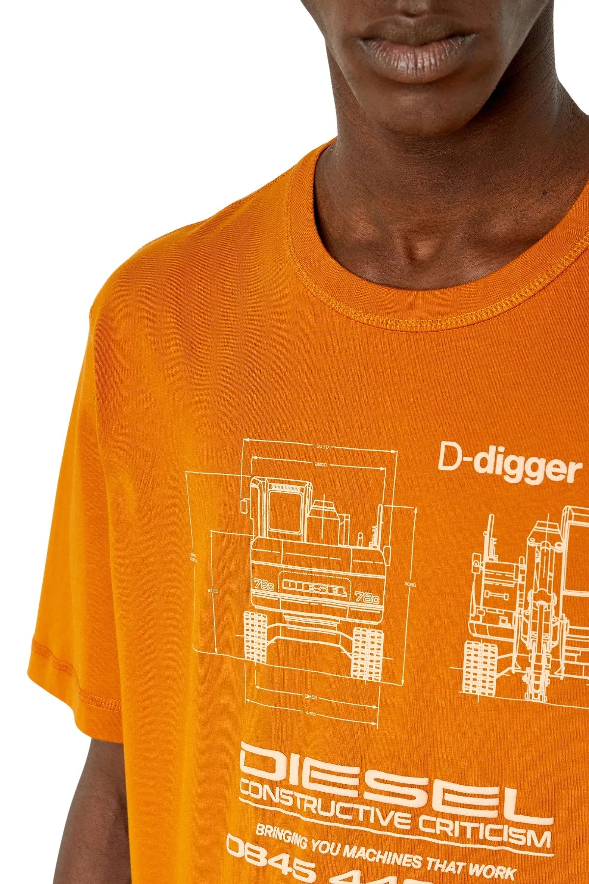 Men's graphic T-shirt in cotton jersey. A regular-fit style with side slits, it features technical drawings of heavy machinery alongside the phrase 'Diesel Constructive Criticism'—part of the design is printed using puff ink for subtle 3D texture.