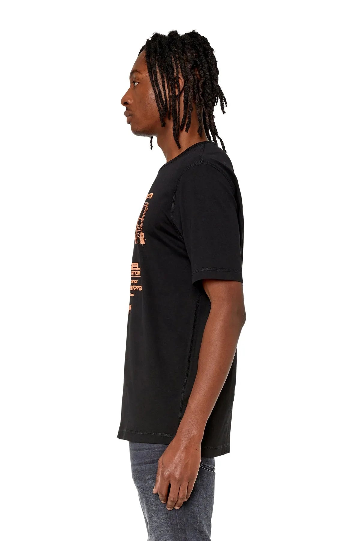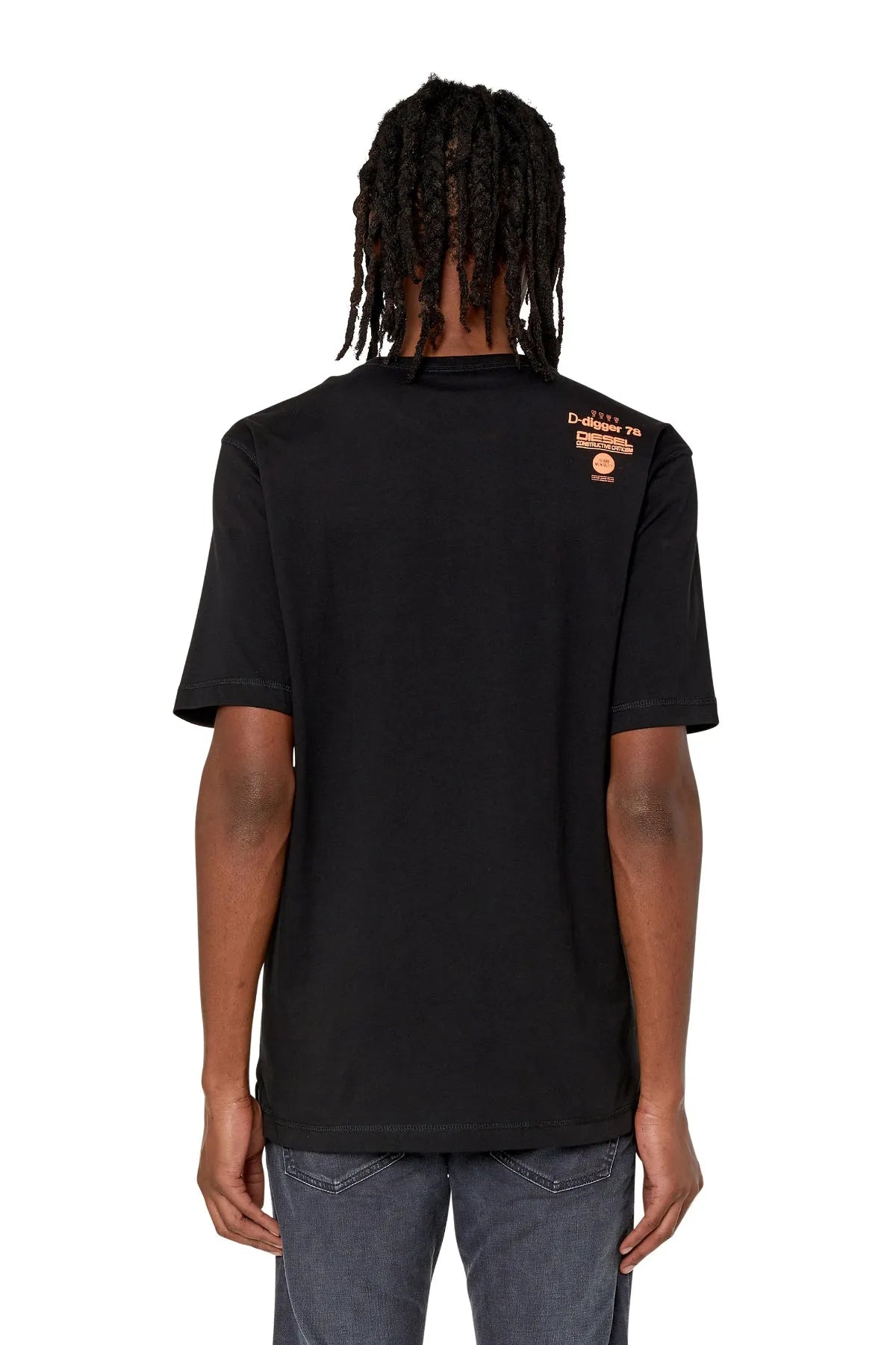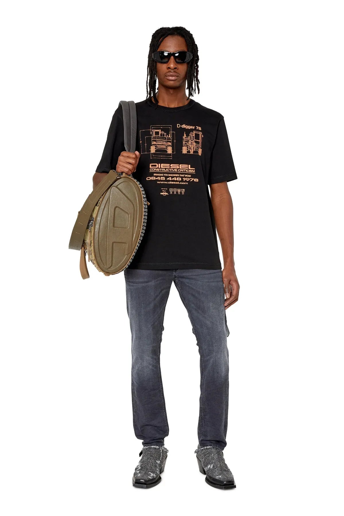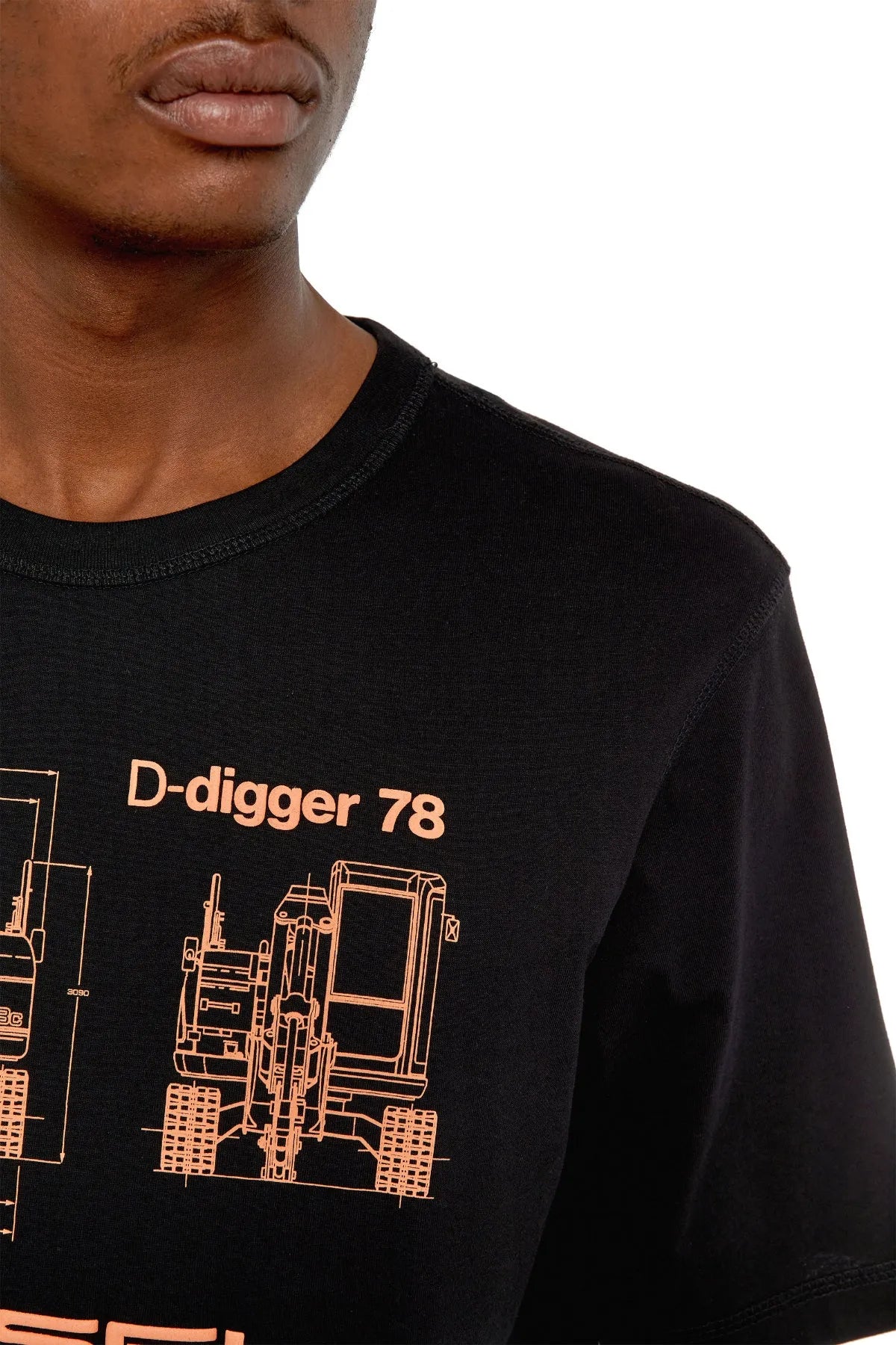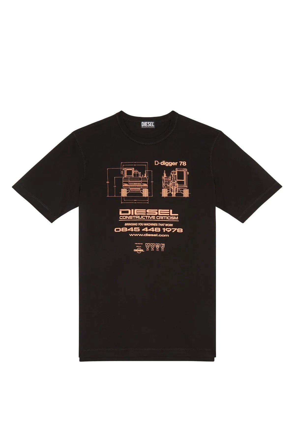 Men's graphic T-shirt in cotton jersey. A regular-fit style with side slits, it features technical drawings of heavy machinery alongside the phrase 'Diesel Constructive Criticism'—part of the design is printed using puff ink for subtle 3D texture.