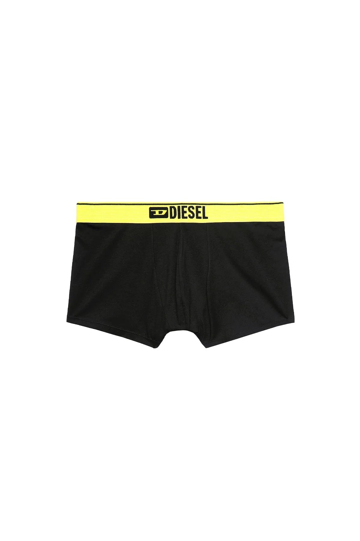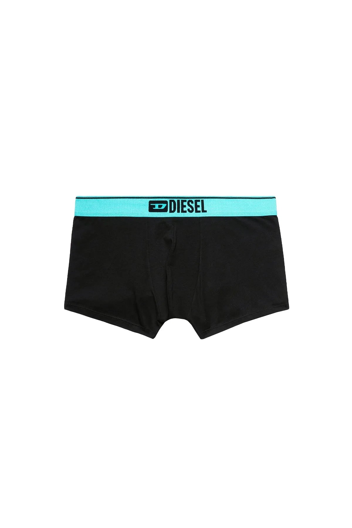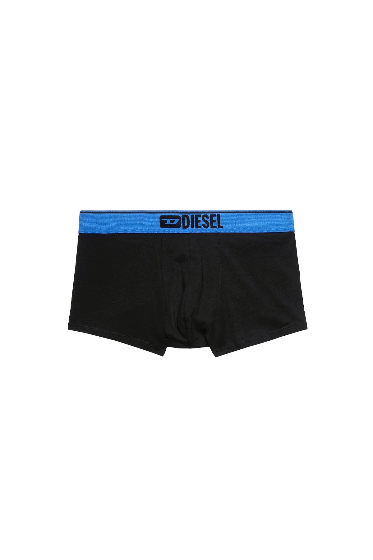 Three pack of plain stretch cotton boxer briefs. Each is topped with a contrast elasticated waistband in a different tone, branded with a front Diesel logo.