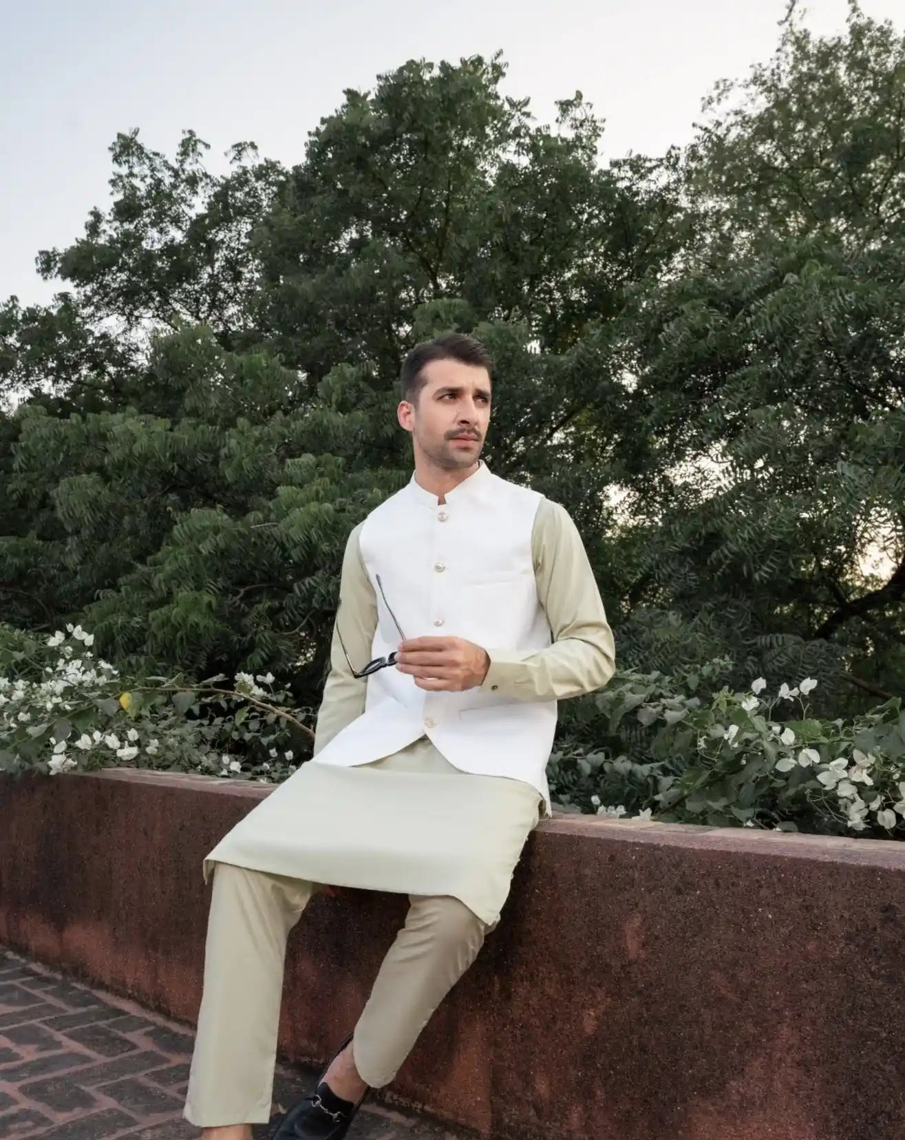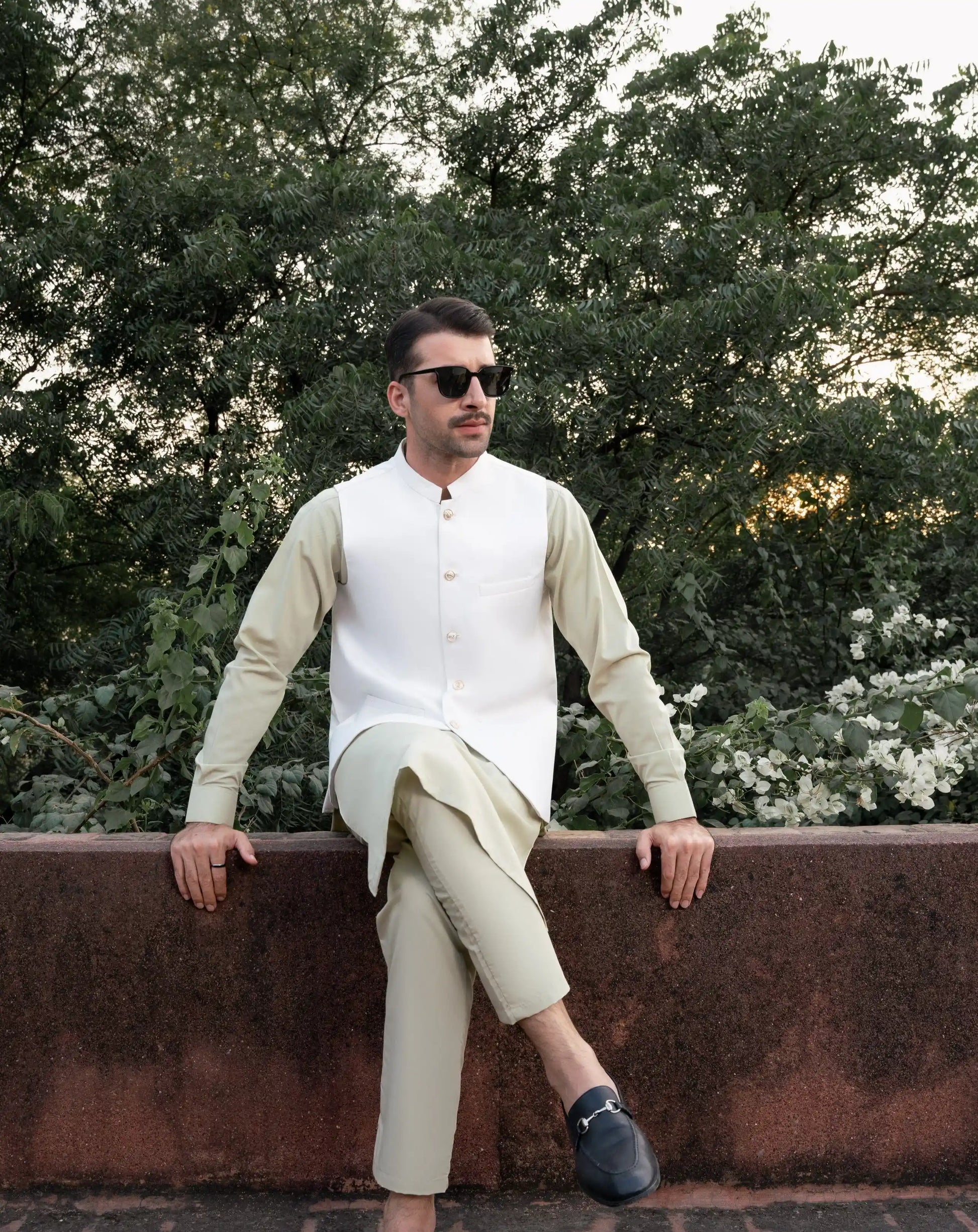 Mint Kameez Shalwar with Off White Suiting Waistcoat - Round Cut - Men