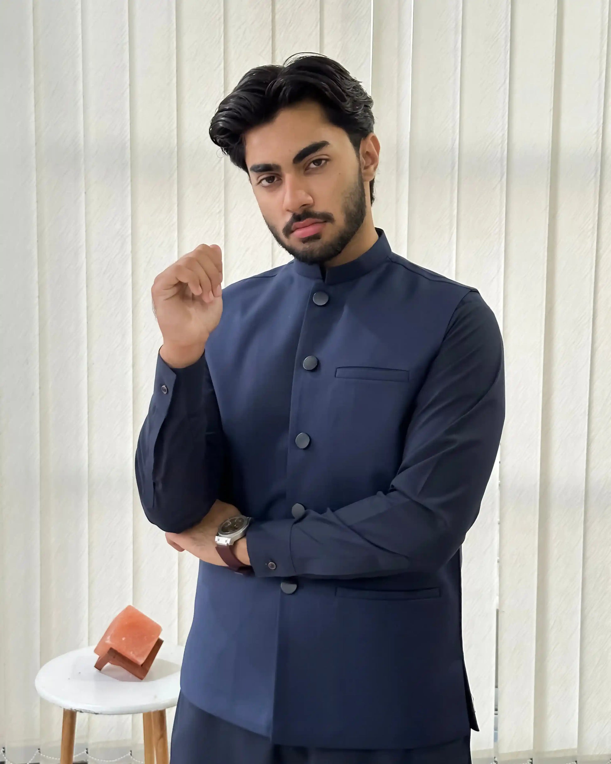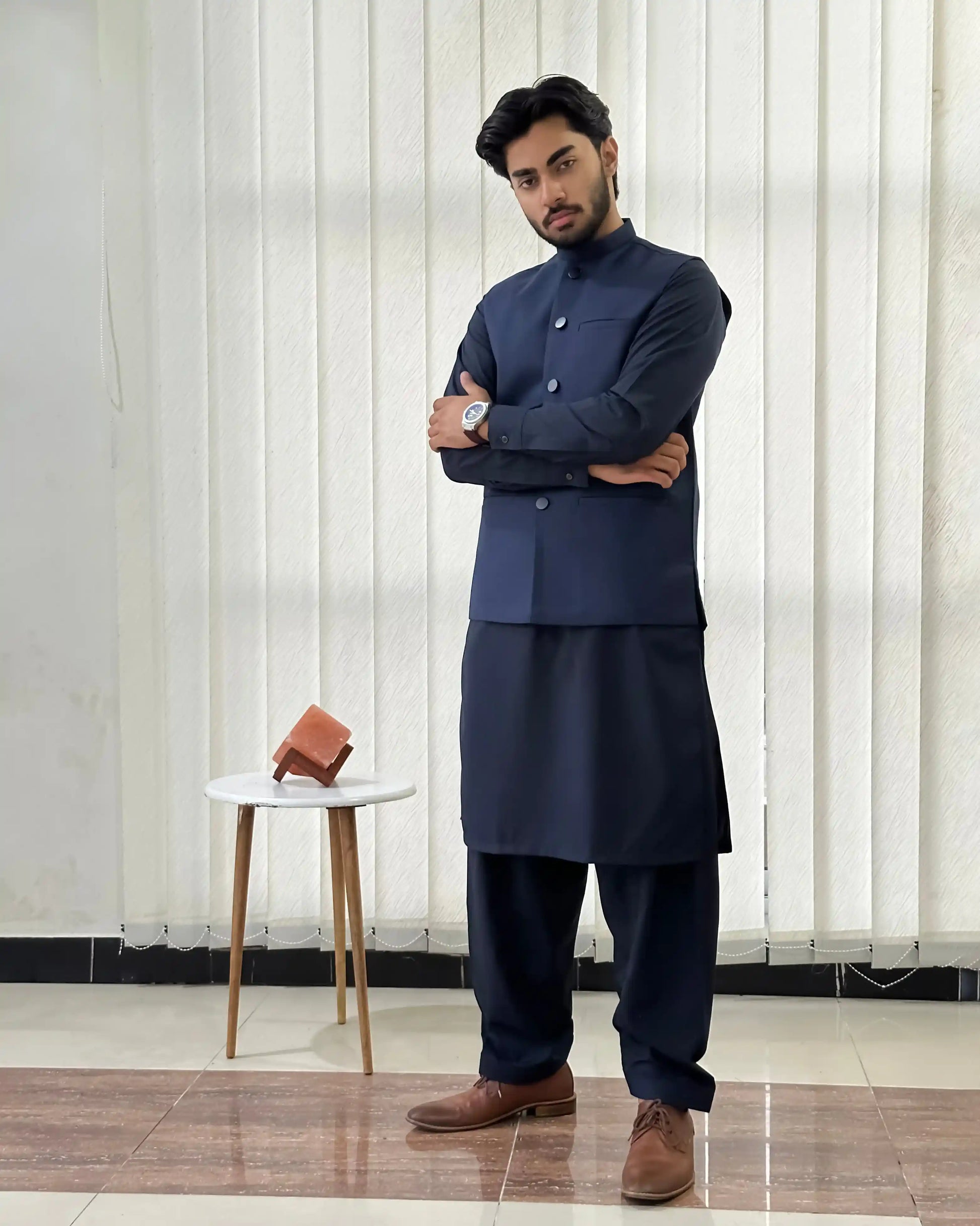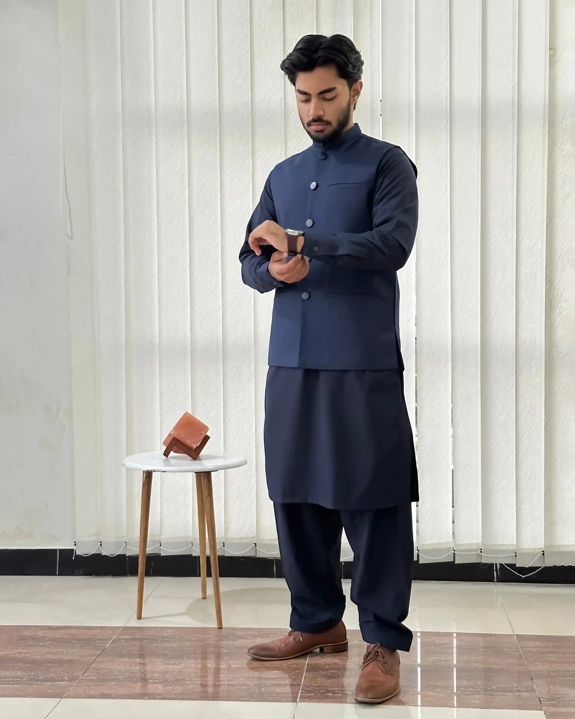 Navy Blue Kurta Shalwar with Suiting Waistcoat - Straight Cut - Men