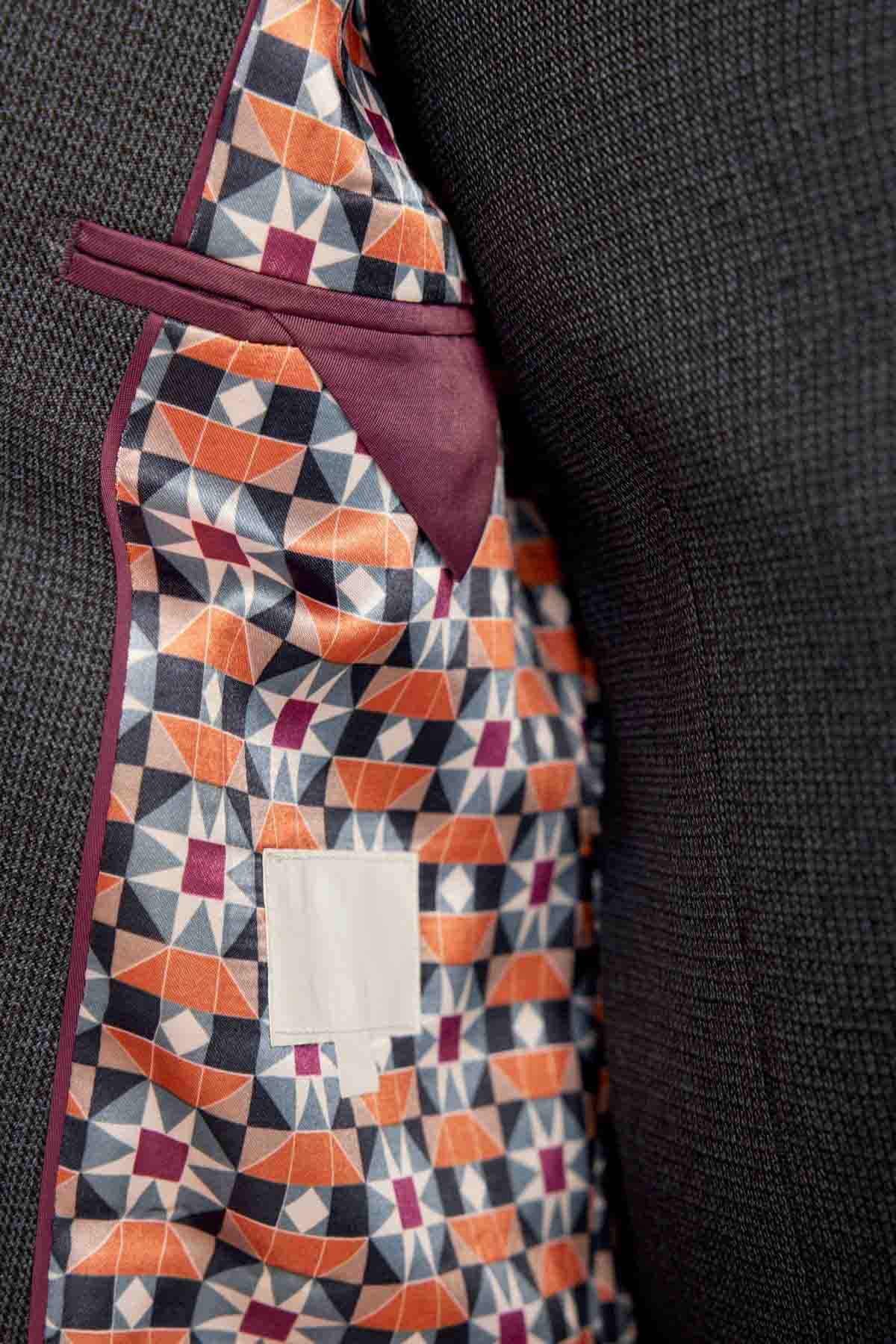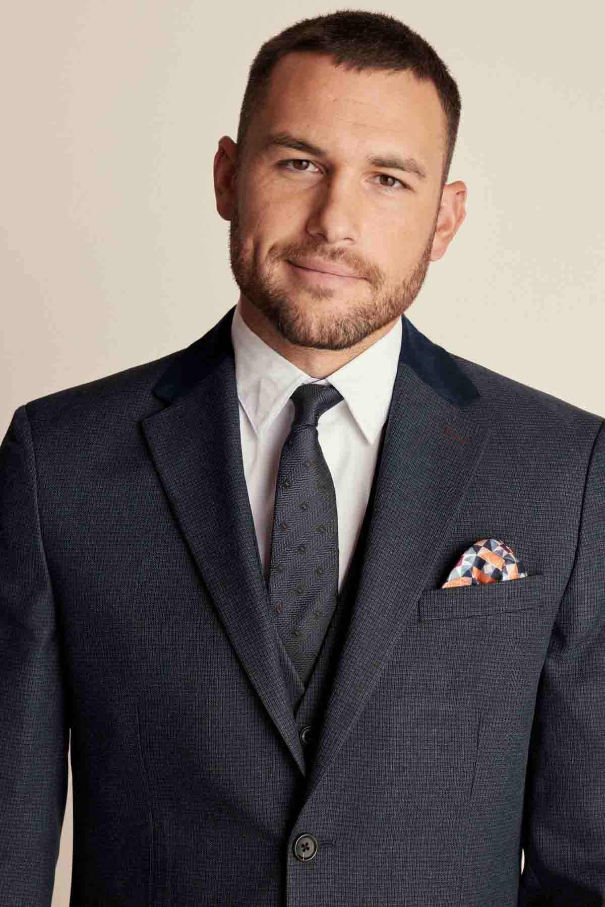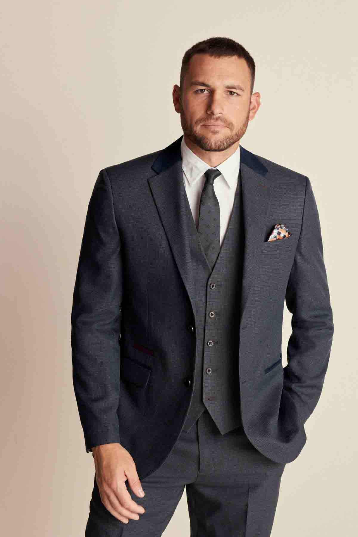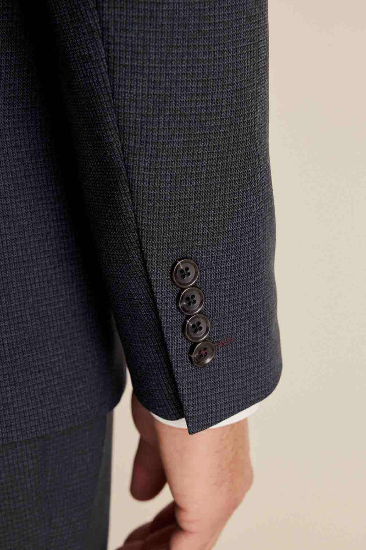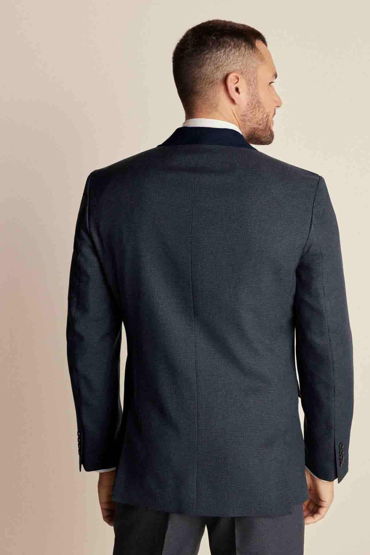 Navy Blue Regular Fit Trimmed Textured Suit Jacket
