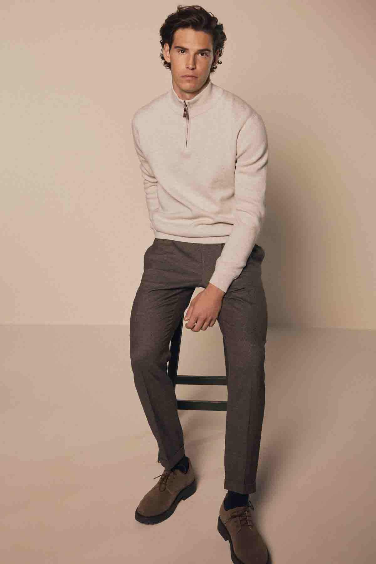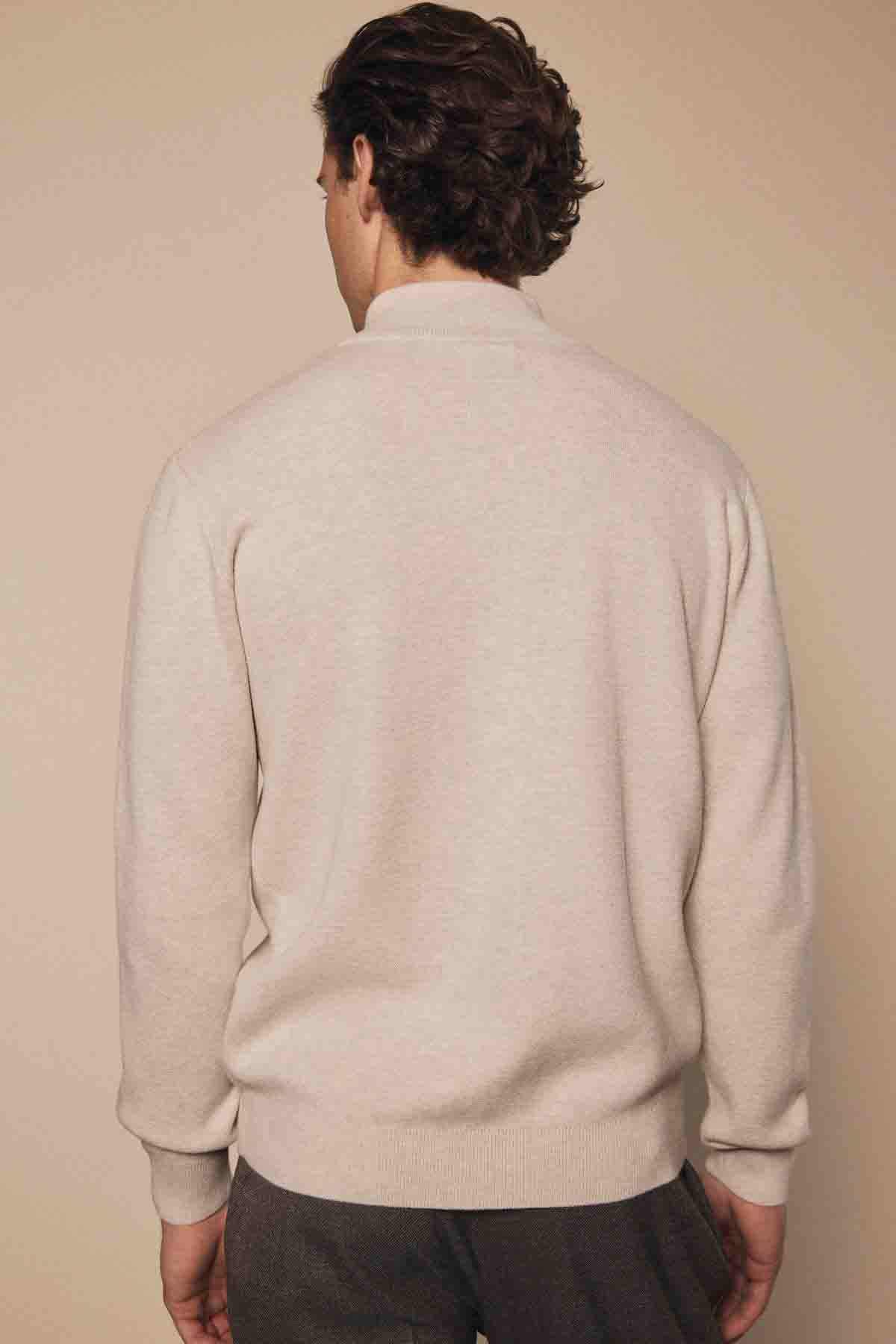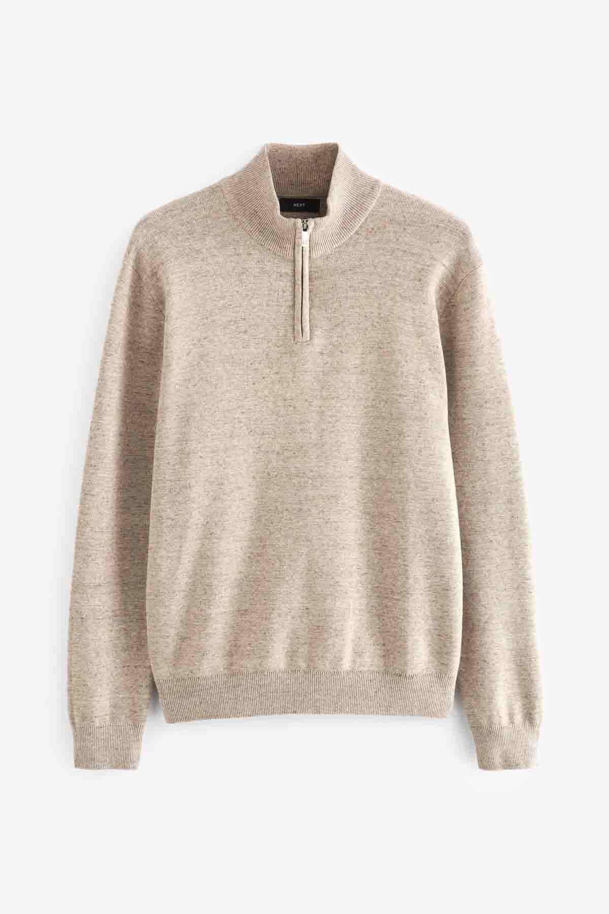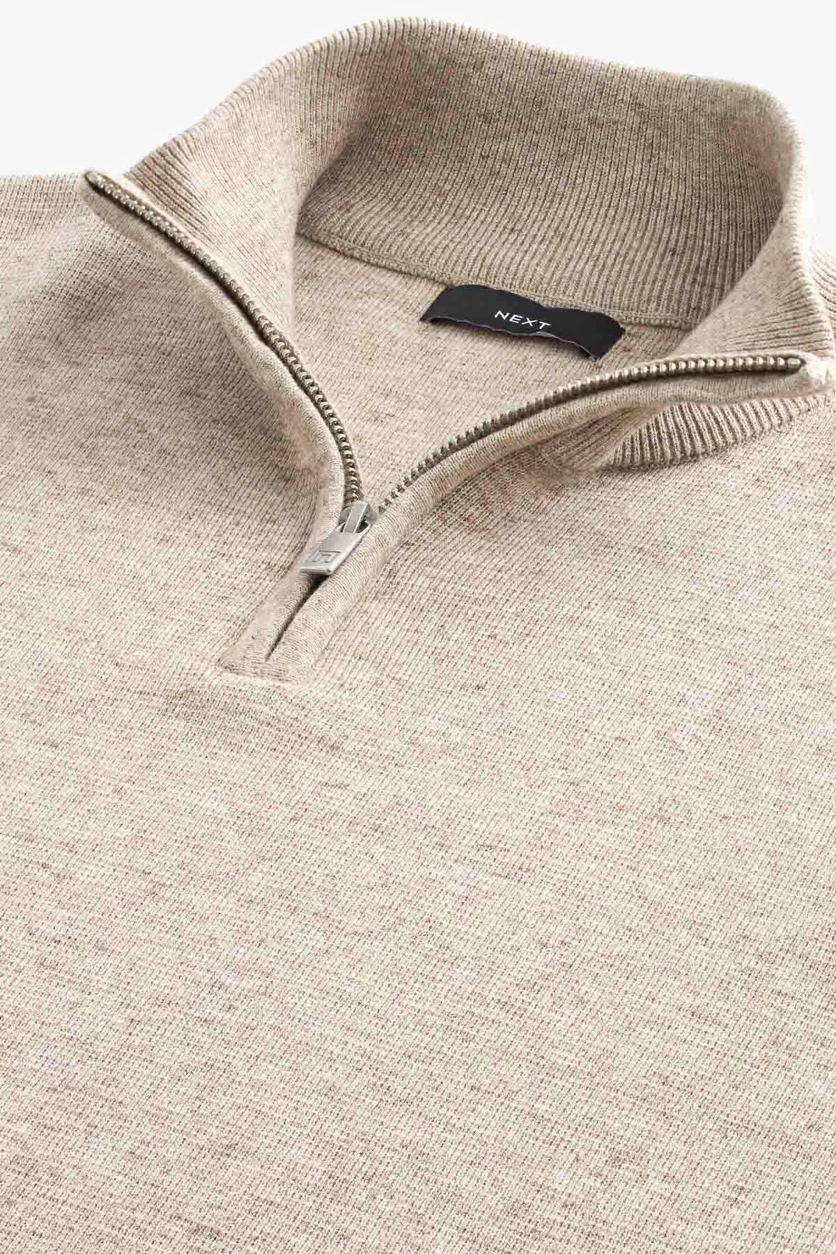 Oatmeal Marl Plain Regular Fit Cotton Premium Quarter Zip Jumper