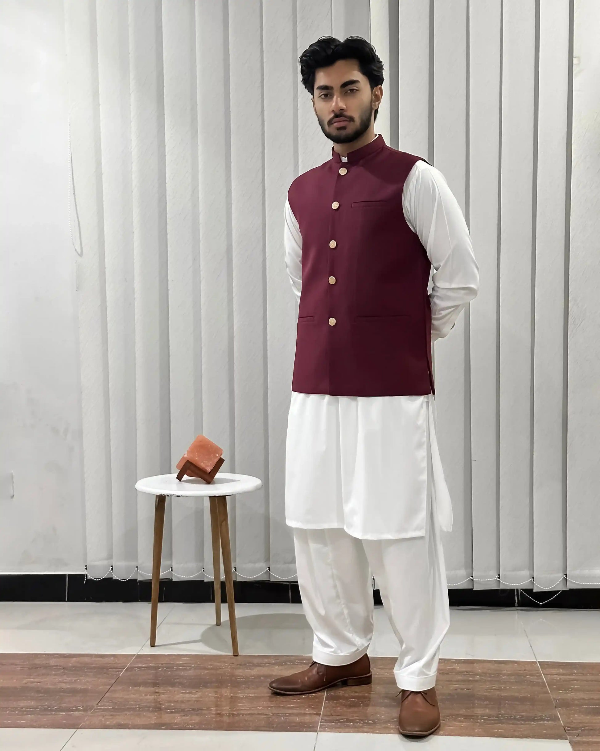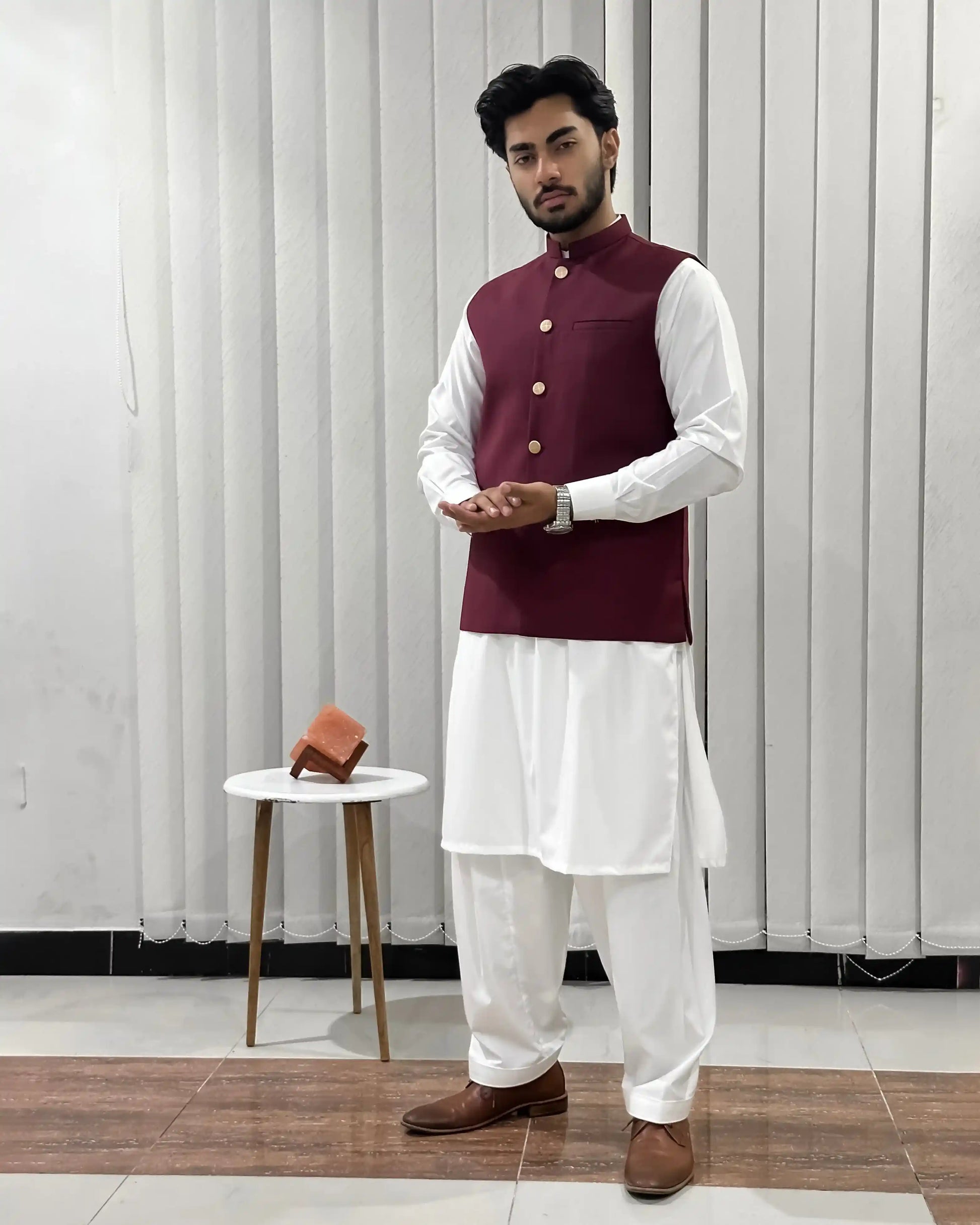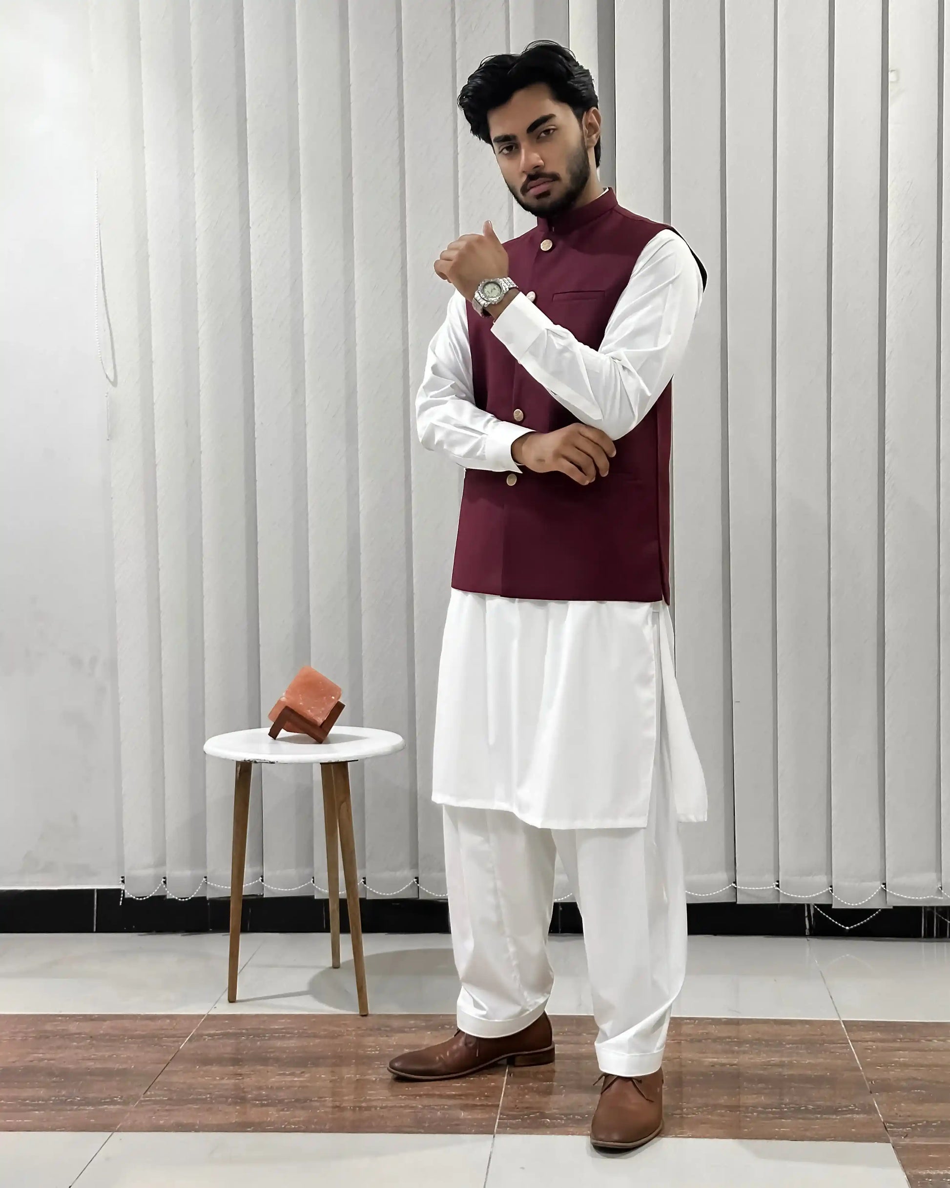 Off White Kurta Shalwar with Maroon Suiting Waistcoat - Straight Cut - Men