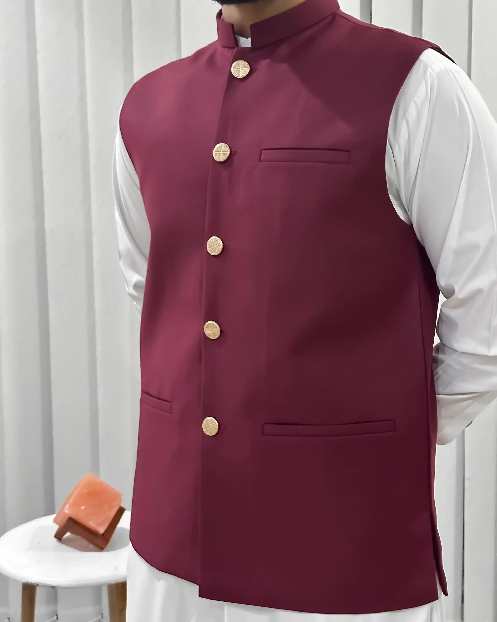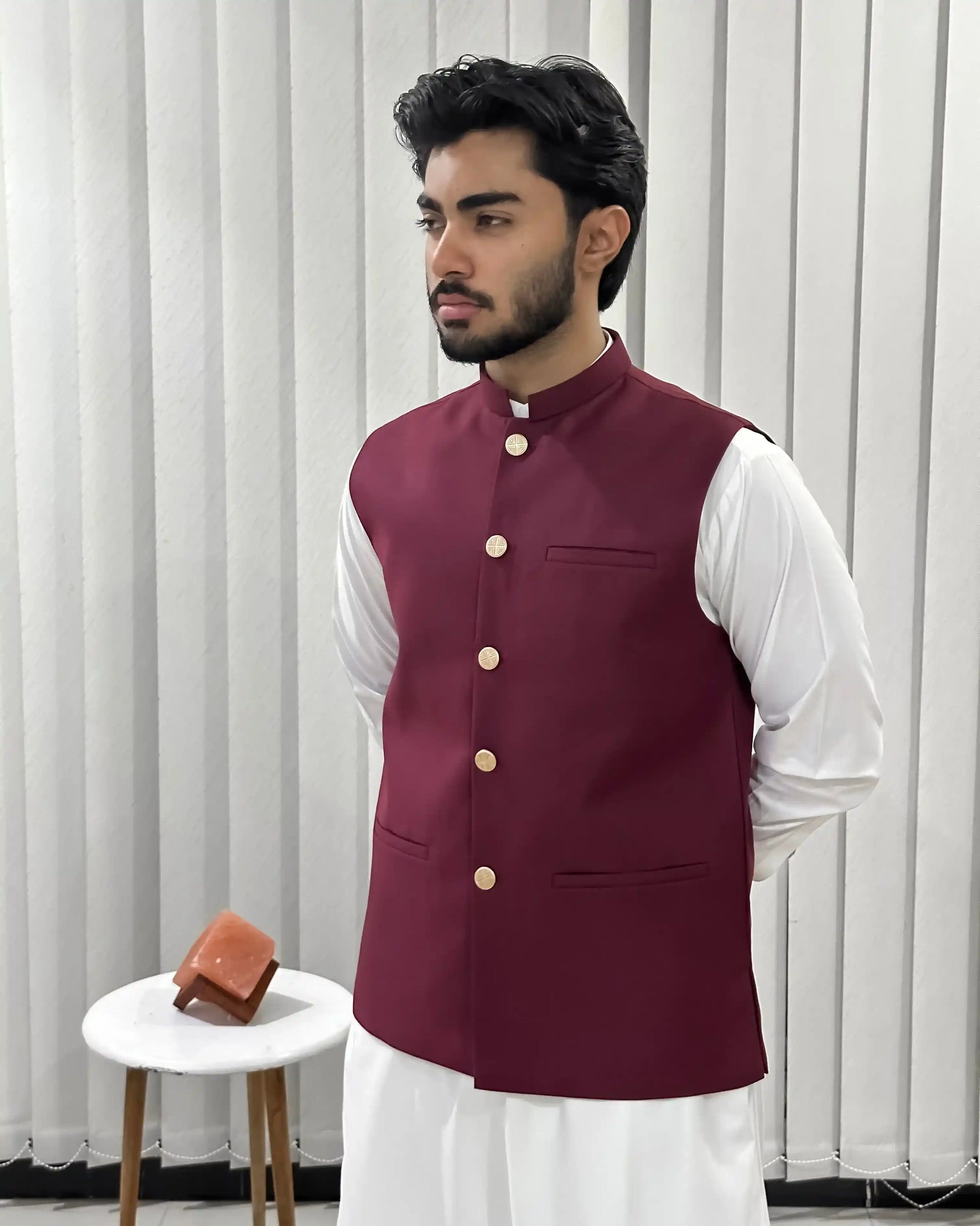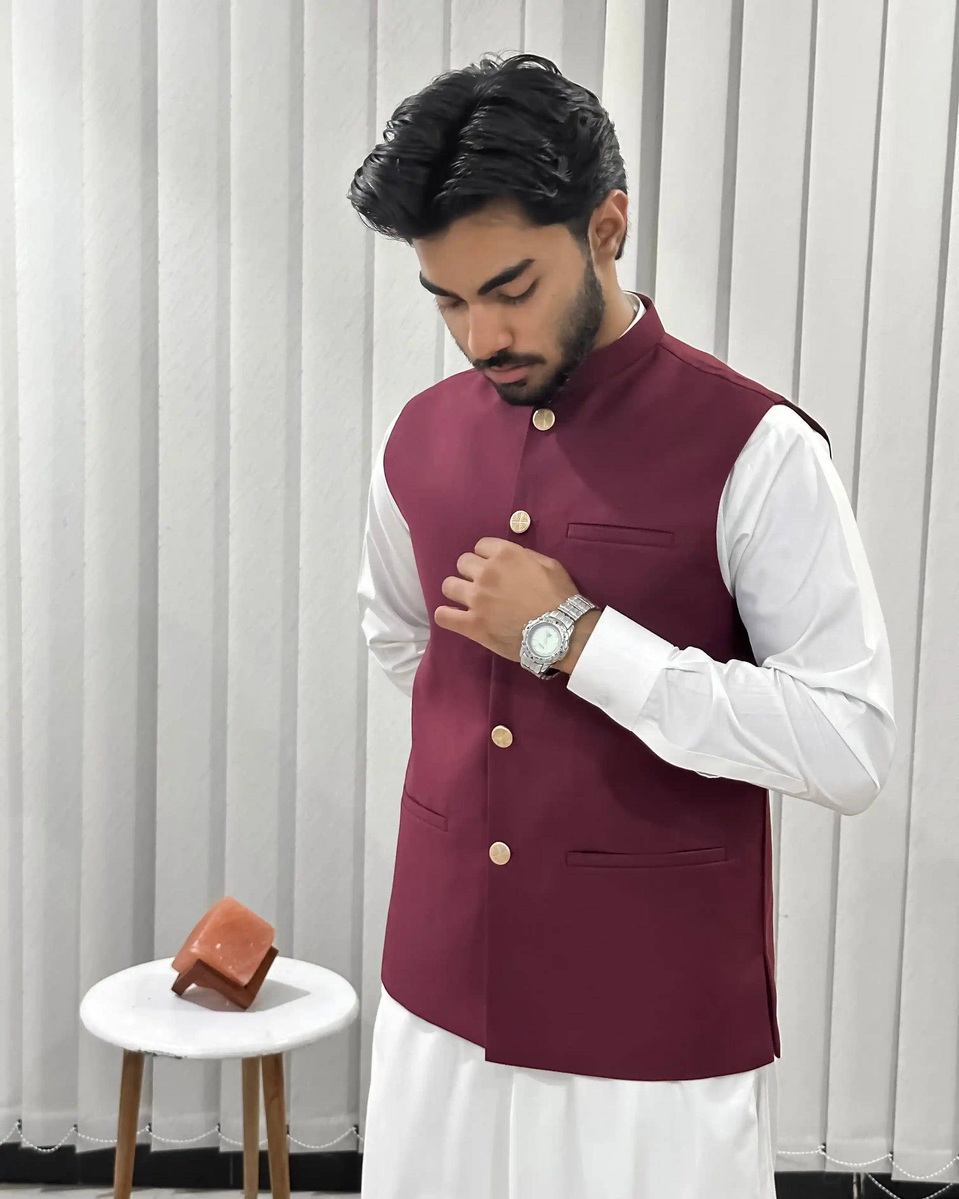 Off White Kurta Shalwar with Maroon Suiting Waistcoat - Straight Cut - Men
