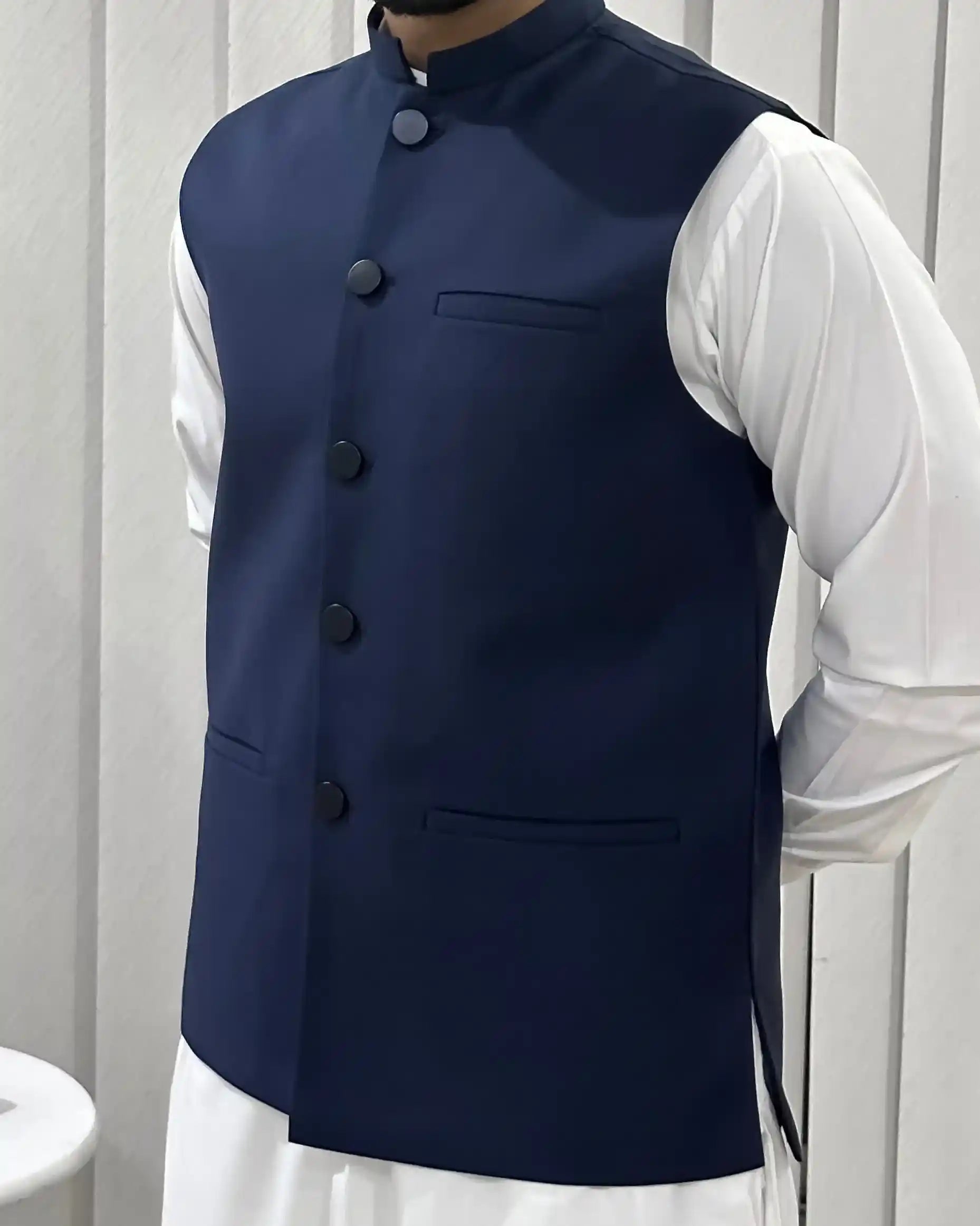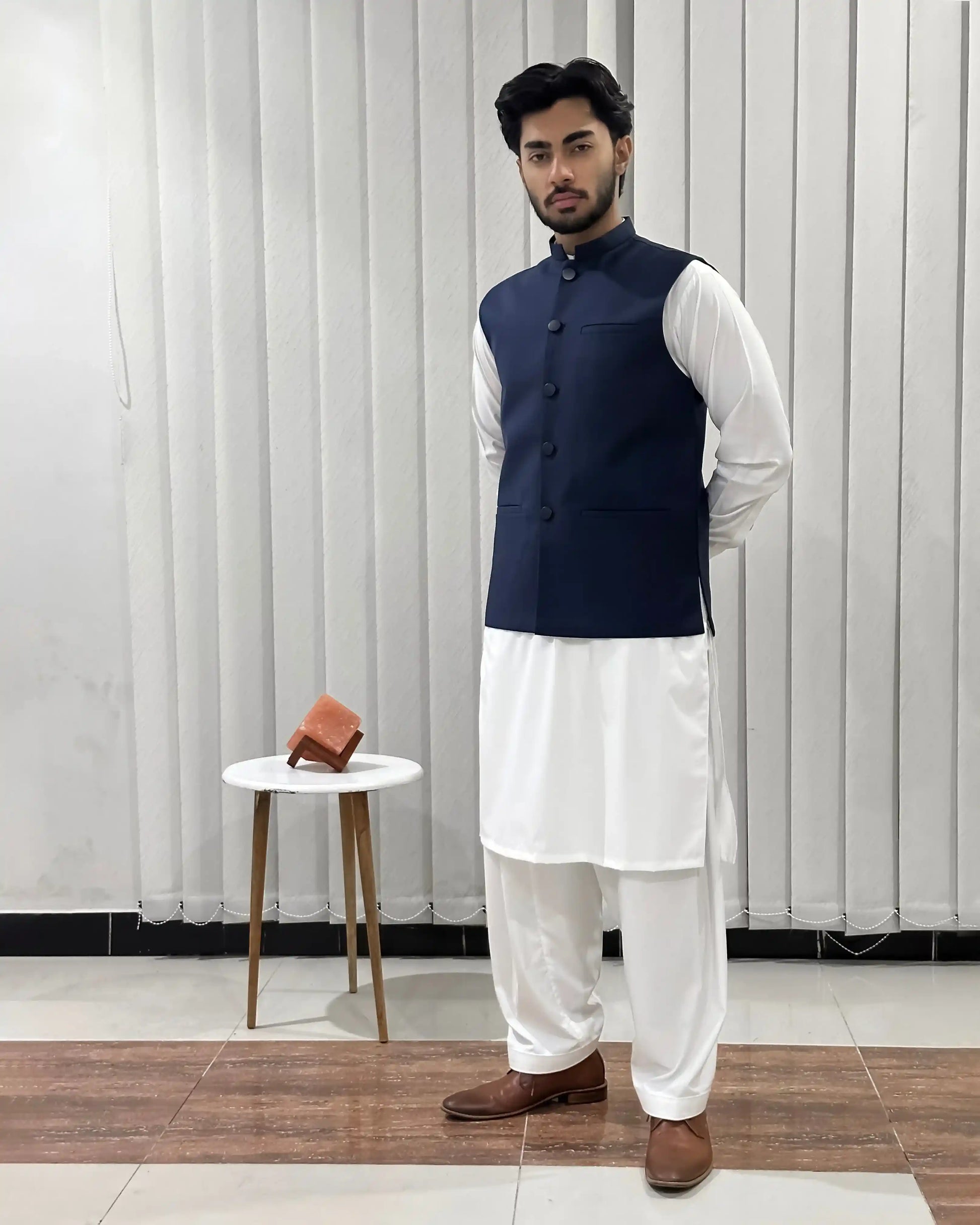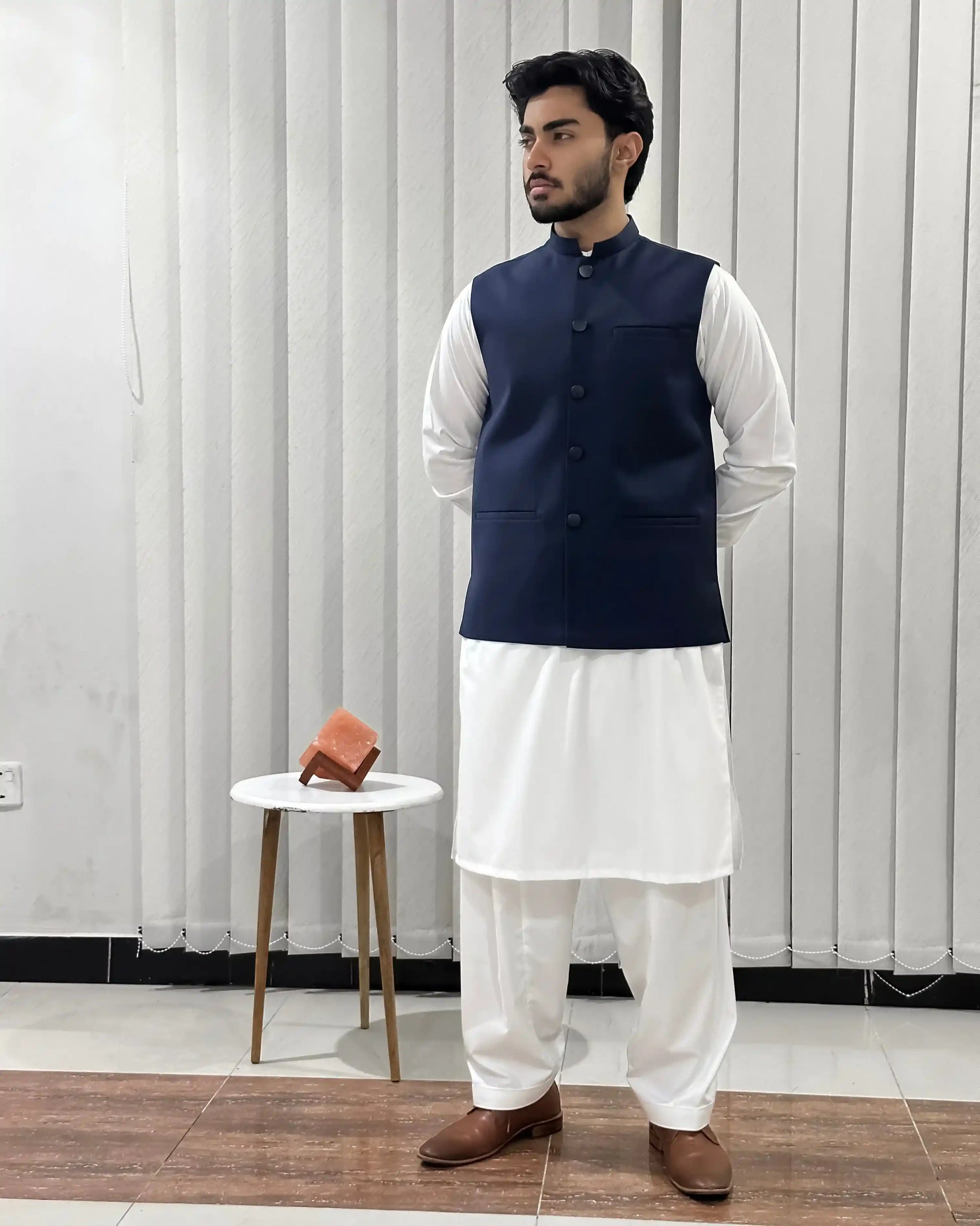 Off White Kurta Shalwar with Navy Blue Suiting Waistcoat - Straight Cut - Men
