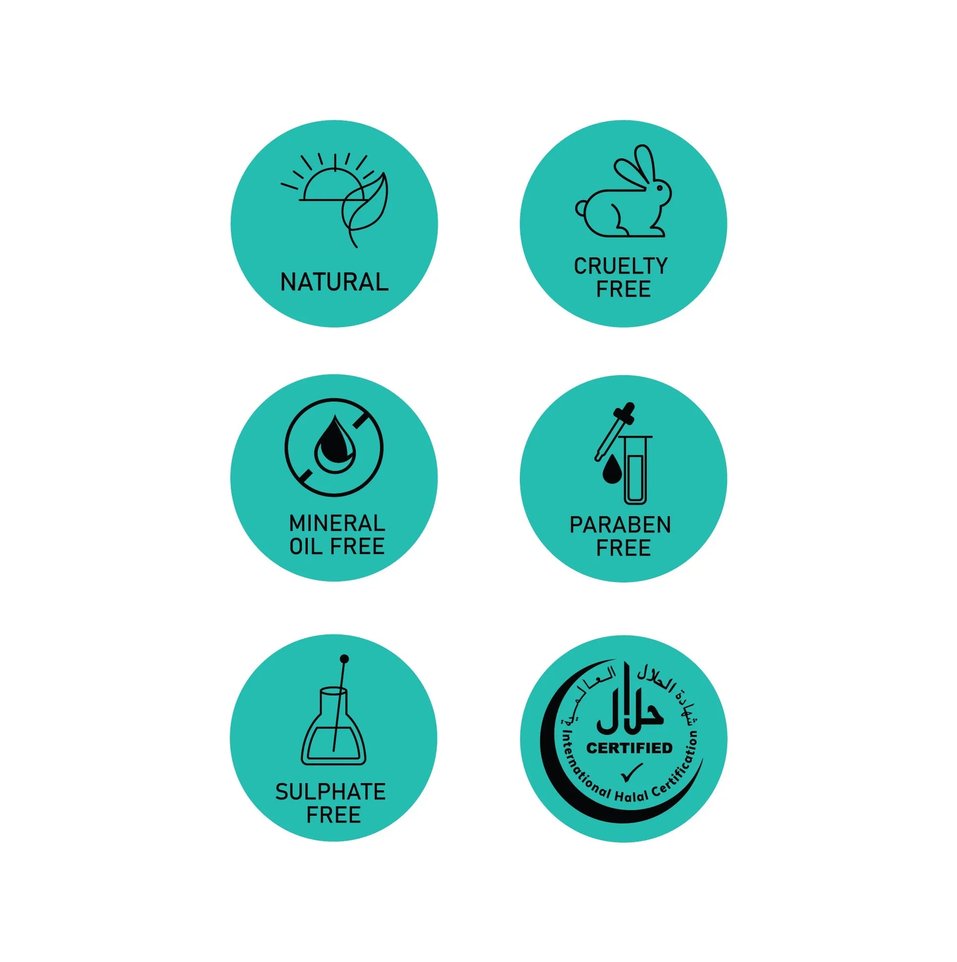 Natural, Cruelty Free, Mineral Oil Free, Paraben Free, Sulphate Free, Halal