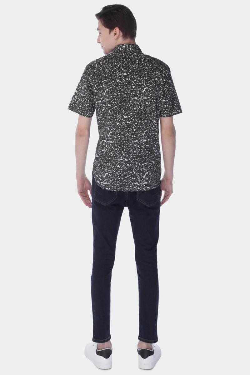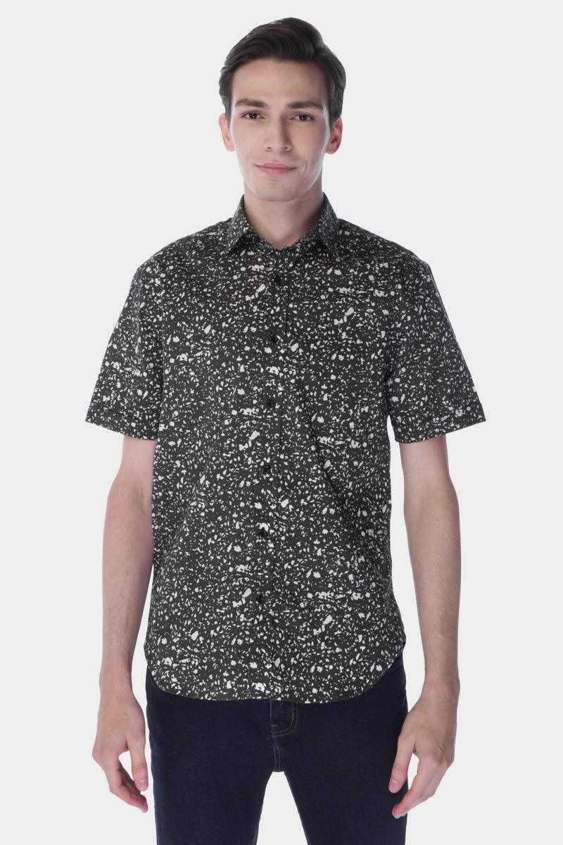 Casual Spattering Print Button Down Closure Shirt With Regular Collar. Folded Hem Sleeeves. Curved Hem