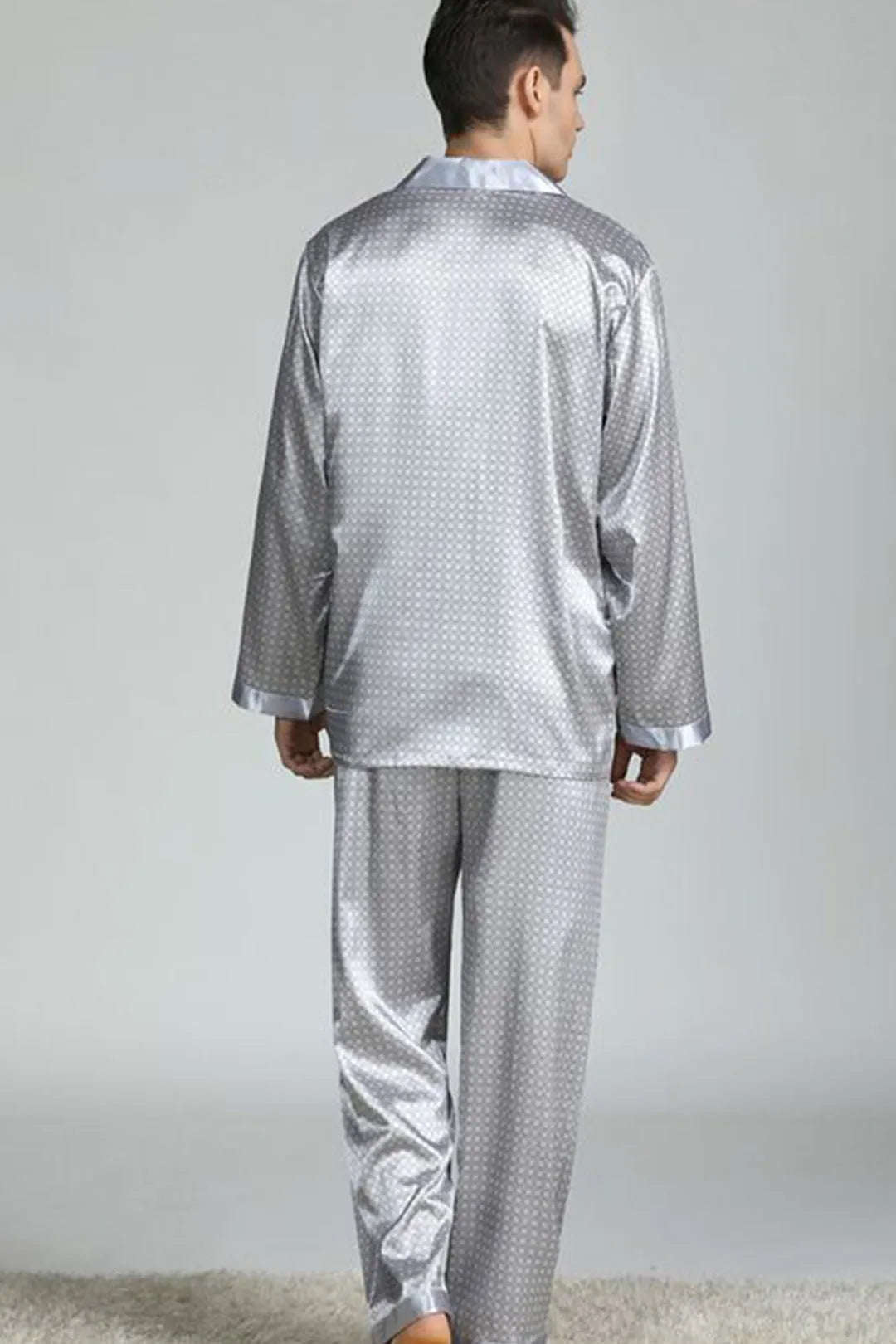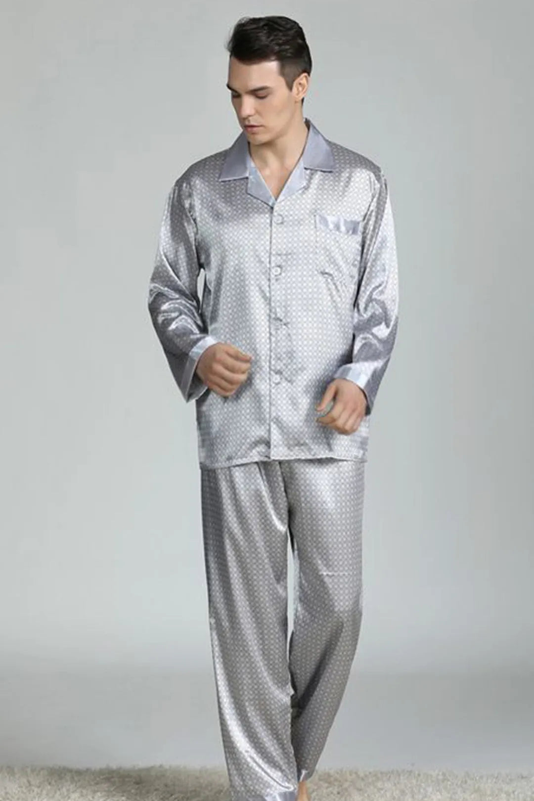 Our Men's Satin Full-Sleeve Pajama Set is nicely tailored with a classic cut. Made of 100% lightweight polyester fabric with a satin weave and silky feel, these men's pajamas feature one front pocket on the chest, a comfortable elastic waistband