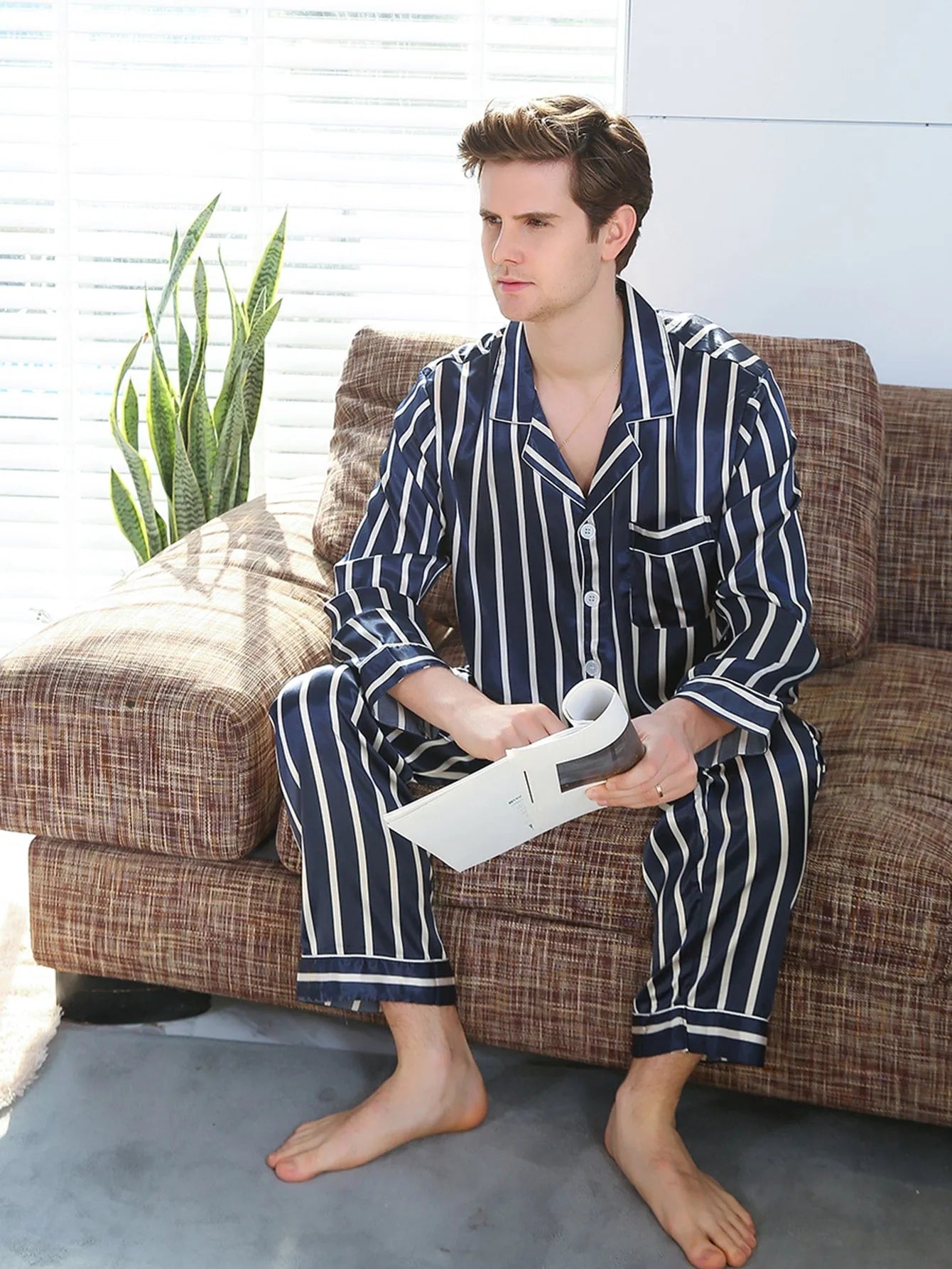 Our Men's Satin Full-Sleeve Pajama Set is nicely tailored with a classic cut. Made of 100% lightweight polyester fabric with a satin weave and silky feel, these men's pajamas feature one front pocket on the chest, a comfortable elastic waistband