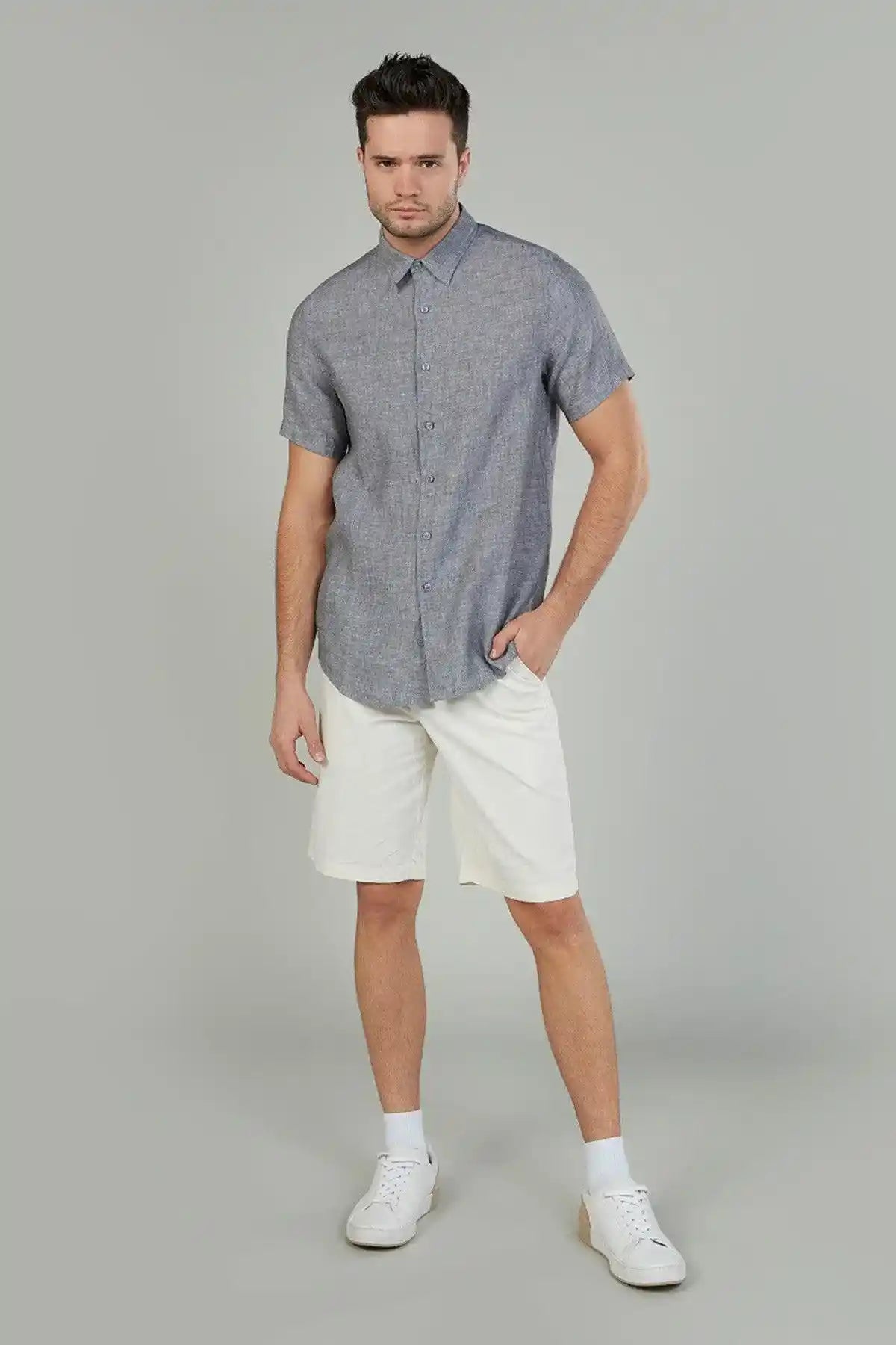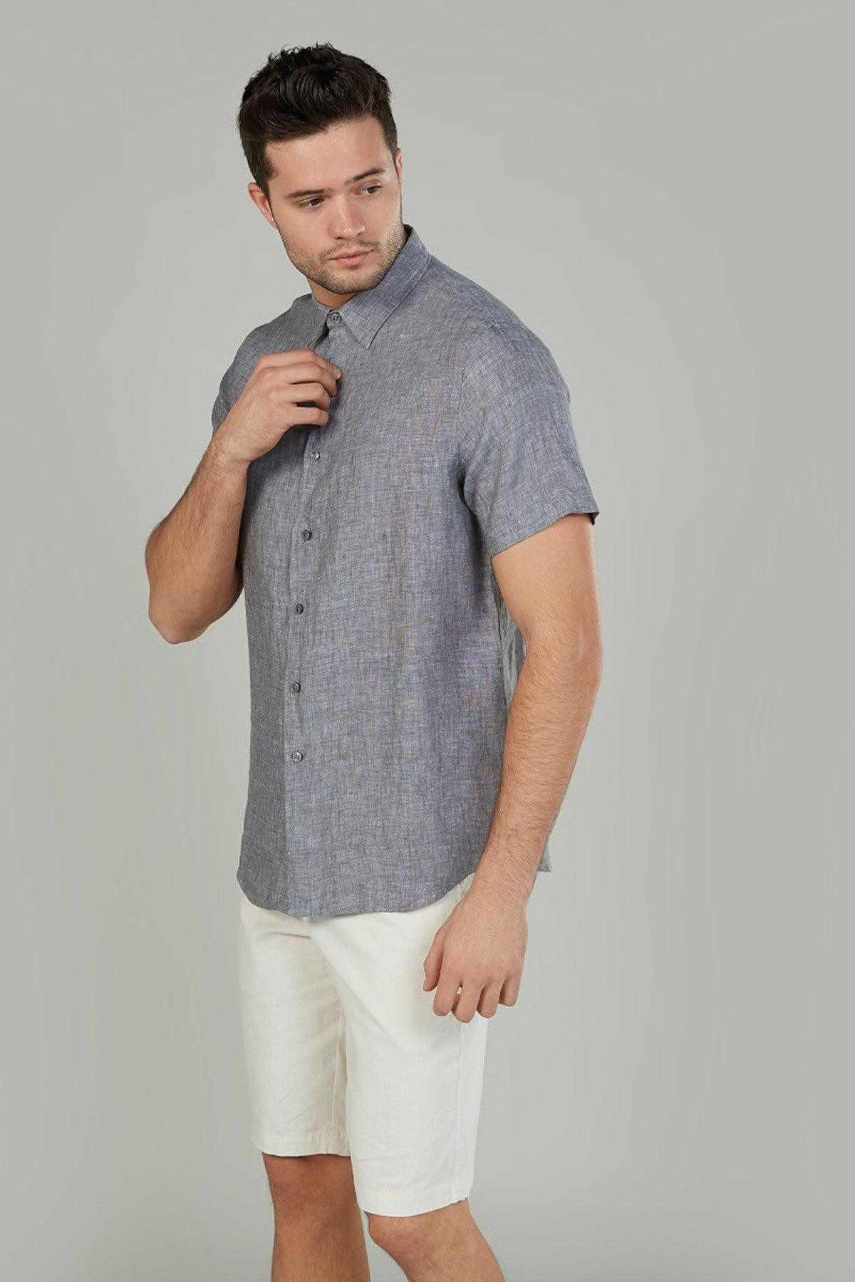 Slim Fit Textured Linen Shirt with Short Sleeves and Spread Collar