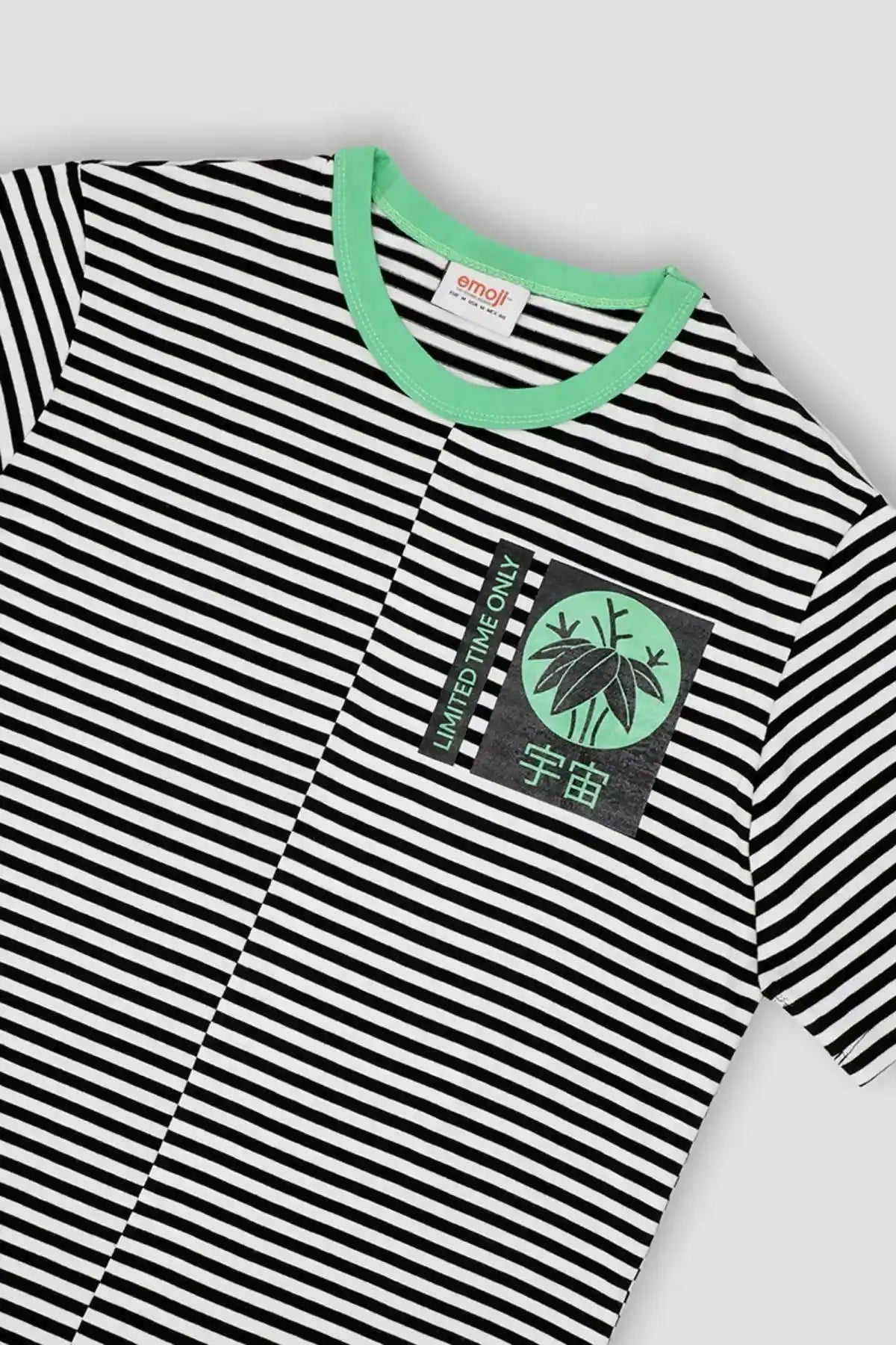 100% Cotton. High Quality Single Jersey Monochromatic Bias Trim Crew Neck T-Shirt Featuring Short Sleeves And Chest Print Detail.