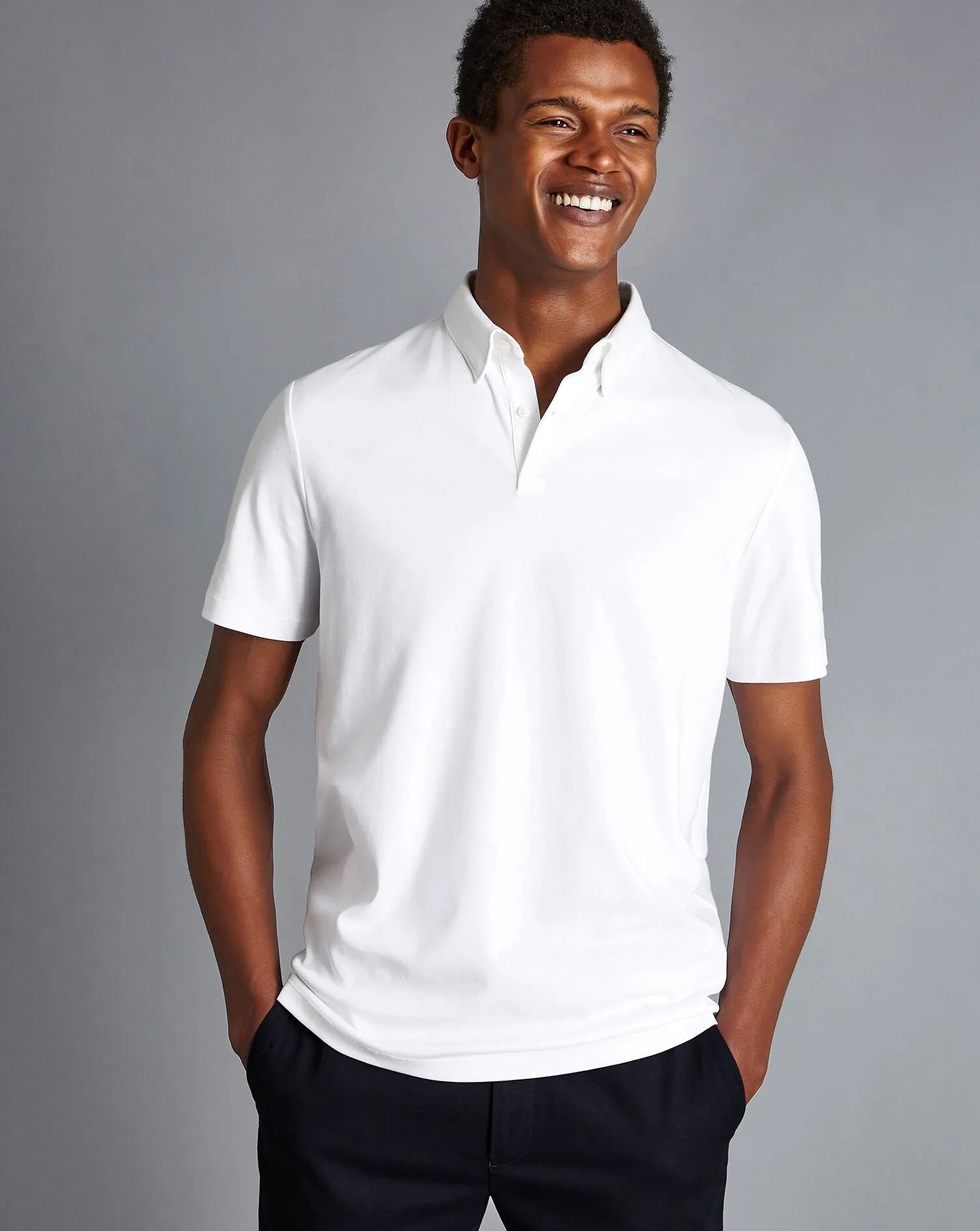 You’ll have to feel this polo to believe it. The jersey fabric is crafted from the finest cotton yarns, which are extra smooth thanks to a special mercerized wash. Mercerized cotton is also more lustrous, durable and less likely to shrink, plus it retains a brighter color, wash after wash. A clean forward-point collar has a sharp and modern look, and the concealed button-down feature delivers a neat finish.