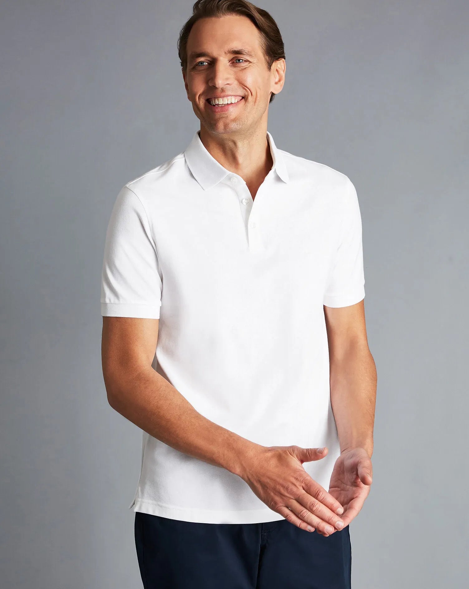 Comfort is a top priority - the fabric blends breathable cotton with a hint of stretch, so movement is easy. The superior cotton yarns are extra-durable, making this a style you can return to again and again. A smart-casual classic that looks as good with chinos as it does with your favorite suits, this timeless white pique polo is a versatile wardrobe hero.