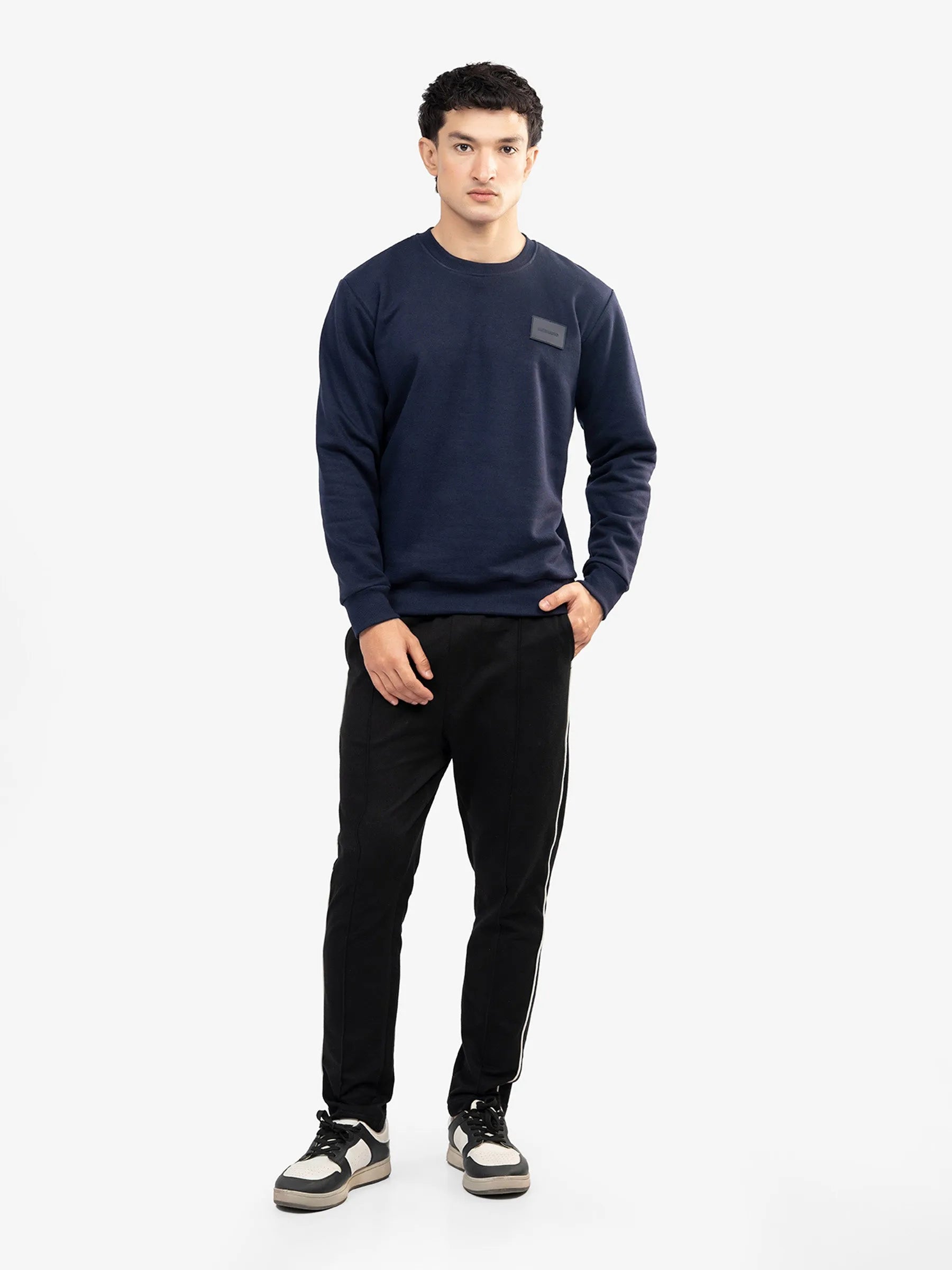 A premium 375 GSM navy blue solid color sweatshirt designed for everyday comfort with a clean, modern look. Crafted in a soft, heavyweight feel for warmth and structure, it features a same-tone rubber patch on the front for subtle branding. Easy to layer, easy to style.