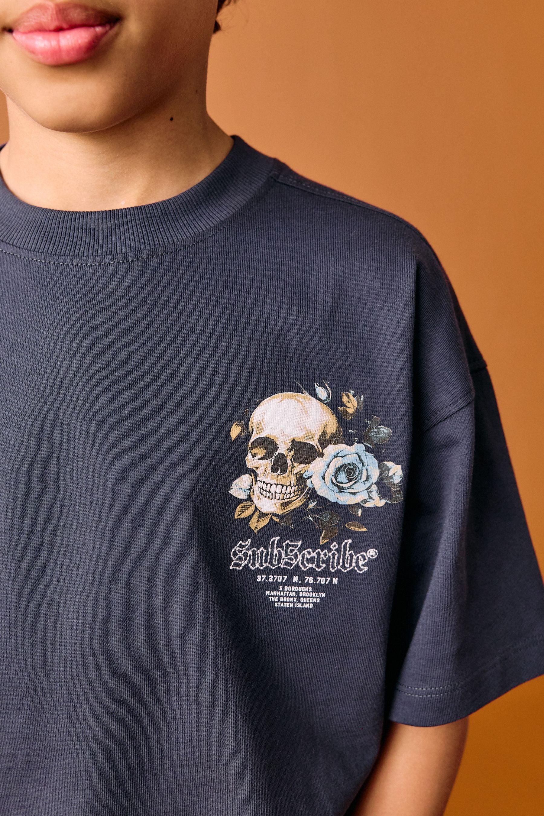 Blue Skull Back Print Relaxed Fit Short Sleeve Graphic T-Shirt