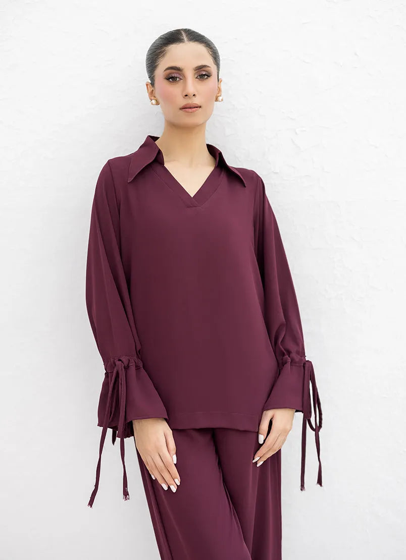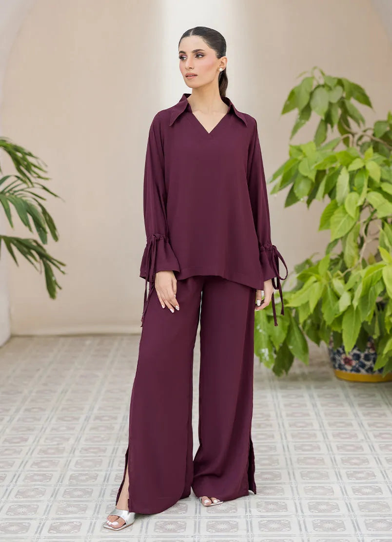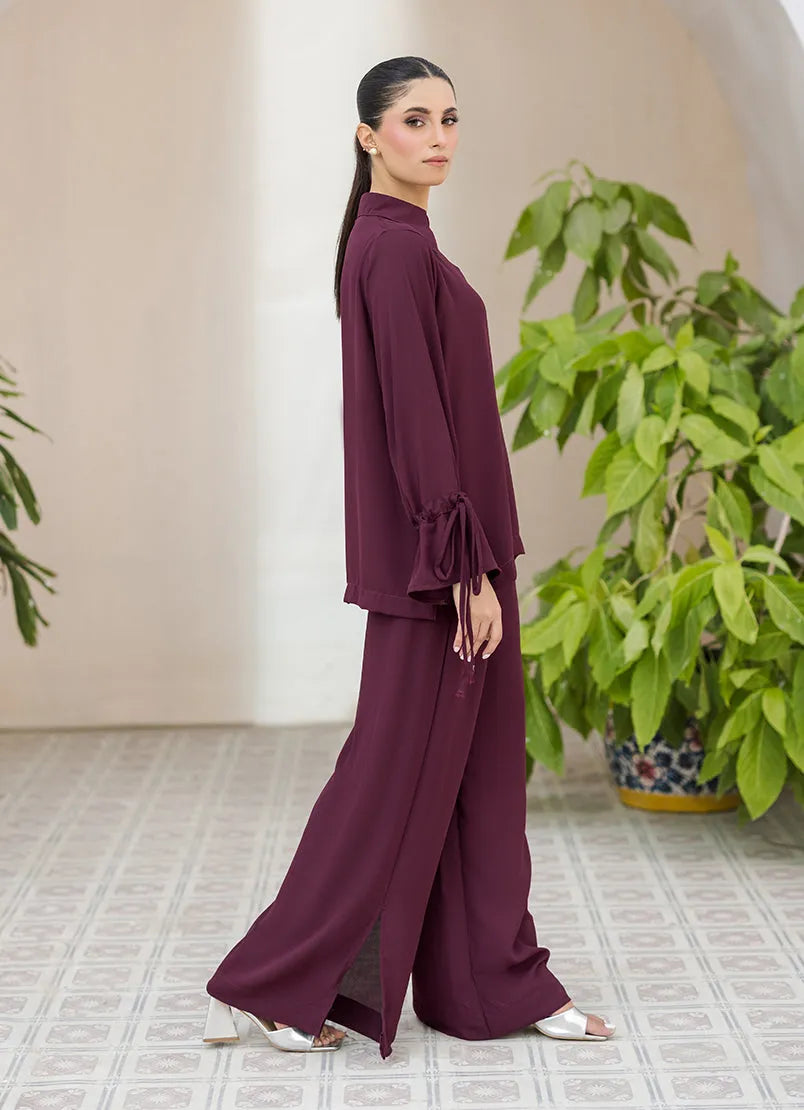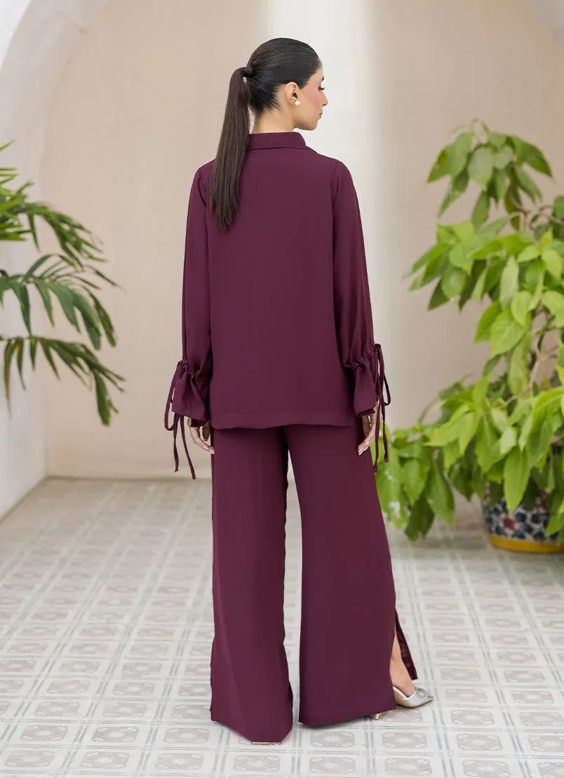 Plum Poise Set is a 2-piece ensemble crafted from luxurious georgette. The outfit features a chic short fusion top paired with slit-cut culotte pants, creating a graceful yet contemporary silhouette in a rich plum hue.