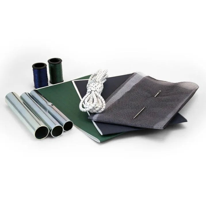 Contains: 2 adhesive-backed nylon patches, 2 mesh screen patches, 2 spools nylon thread, 1-#4 needle, 3 ferrules (1 each: 8.5 mm, 9.5 mm and 11 mm), 45†(114 cm) shock cord, and a resealable bag for storage