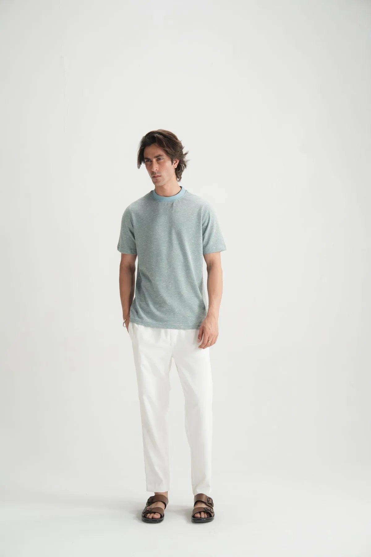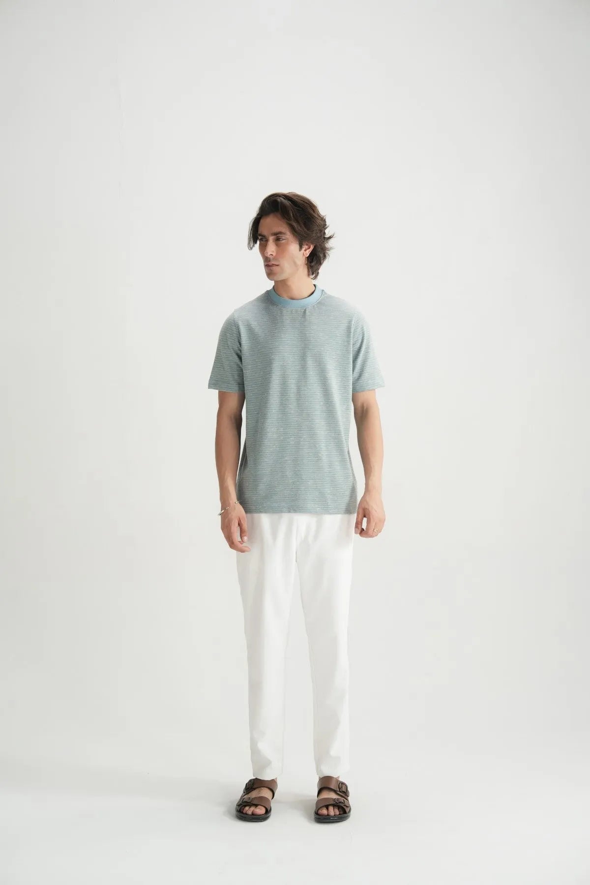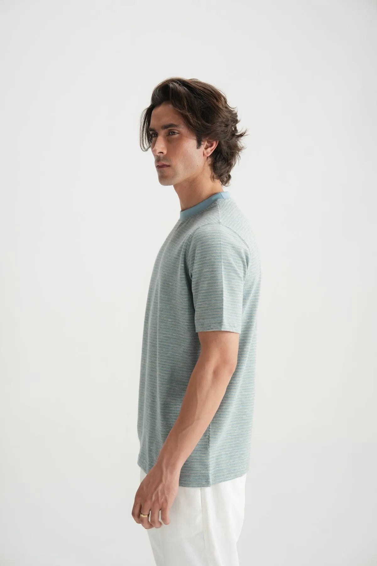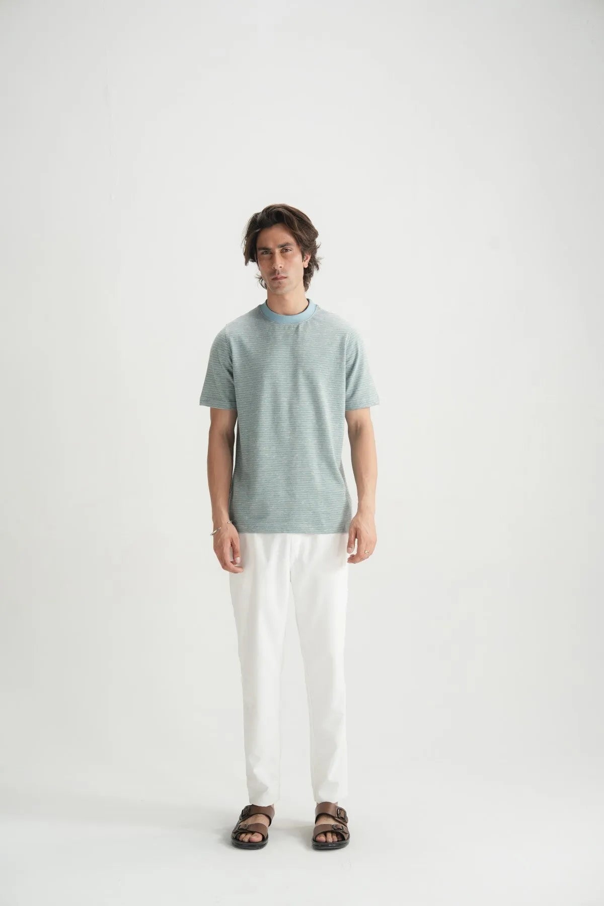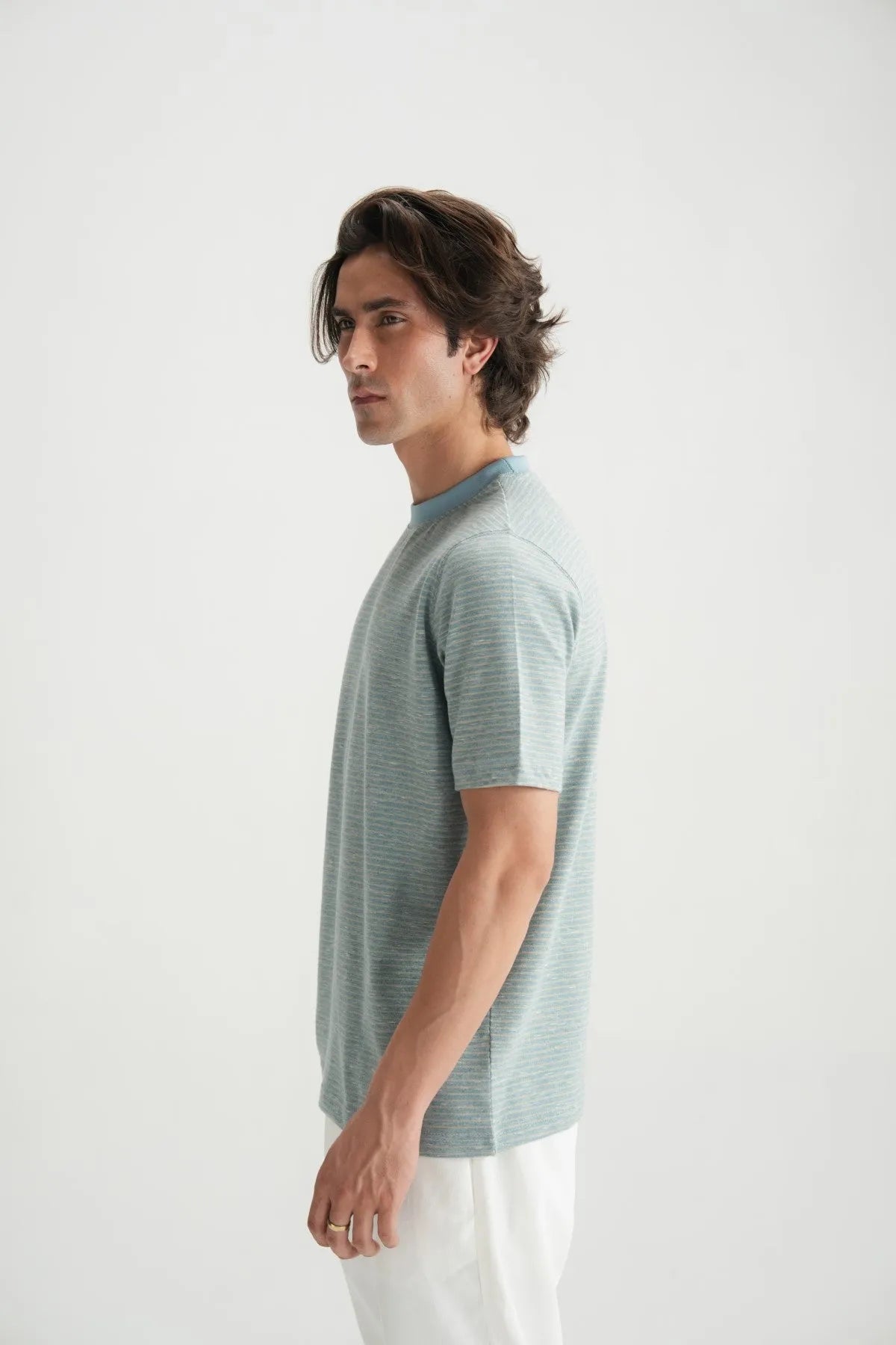 Refresh your basics with our Air Blue T-shirt, crafted from soft cotton fabric featuring subtle horizontal lines for added texture. The regular fit ensures a comfortable, clean silhouette, while the airy blue tone brings a calm, modern touch to your wardrobe.
