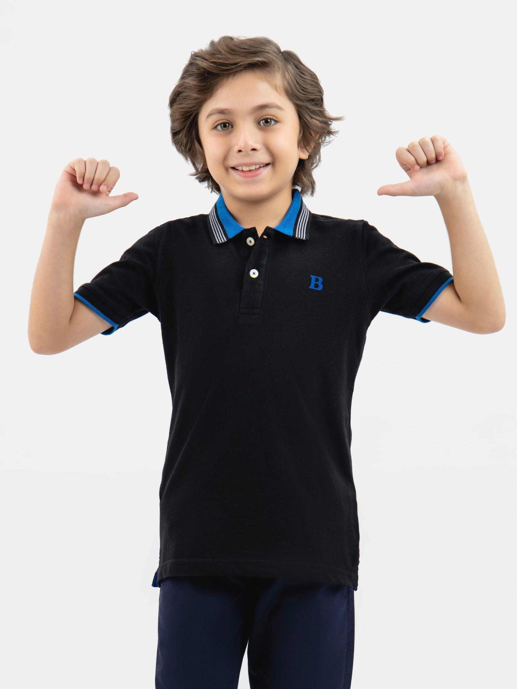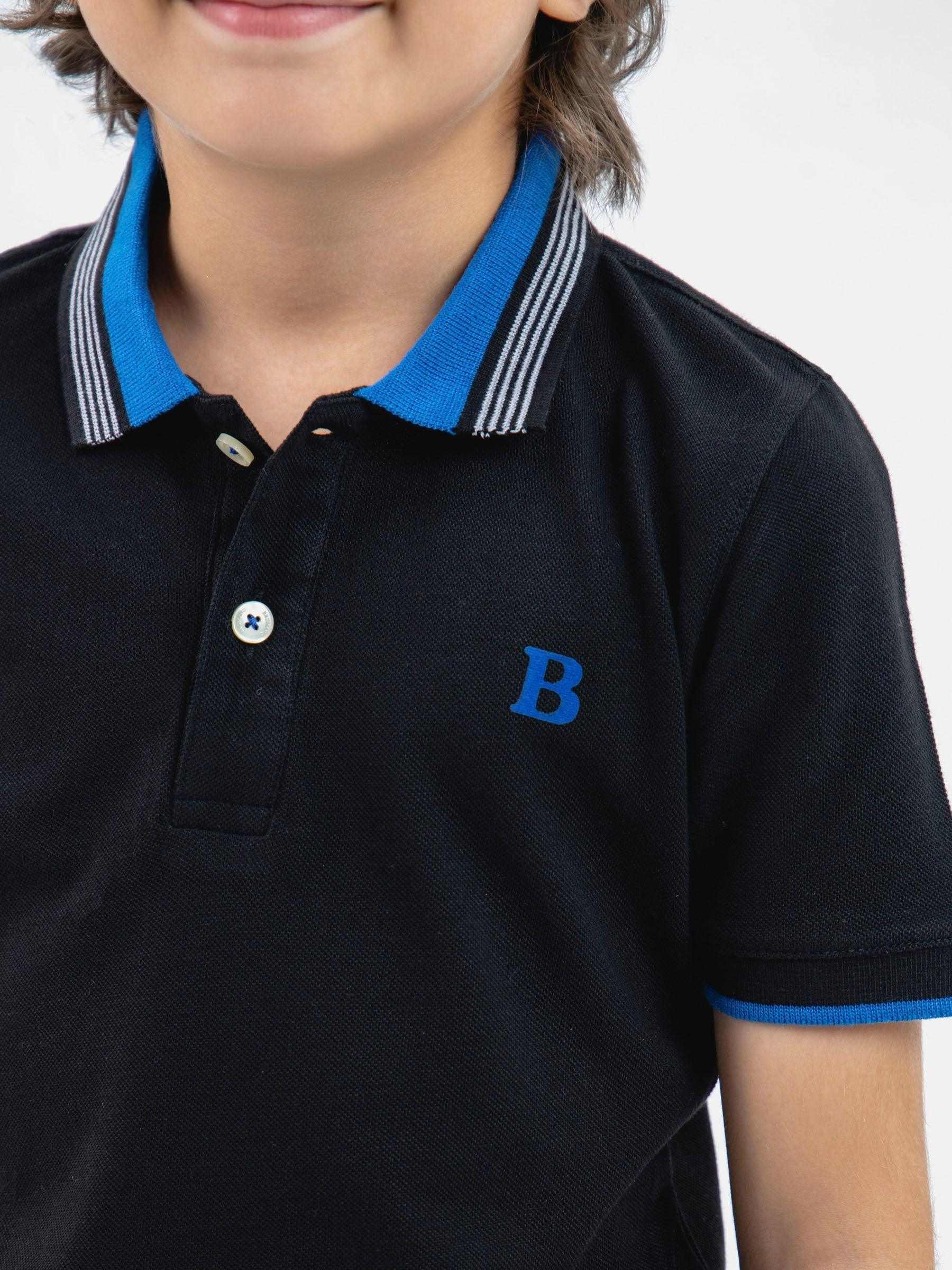 Keep your little one cool and comfortable in in our kids black pique polo. Made with fine fabric, it features contrasting blue collar, two button placket & branded 'B' emblem in front. Pair it with shorts for a summer look