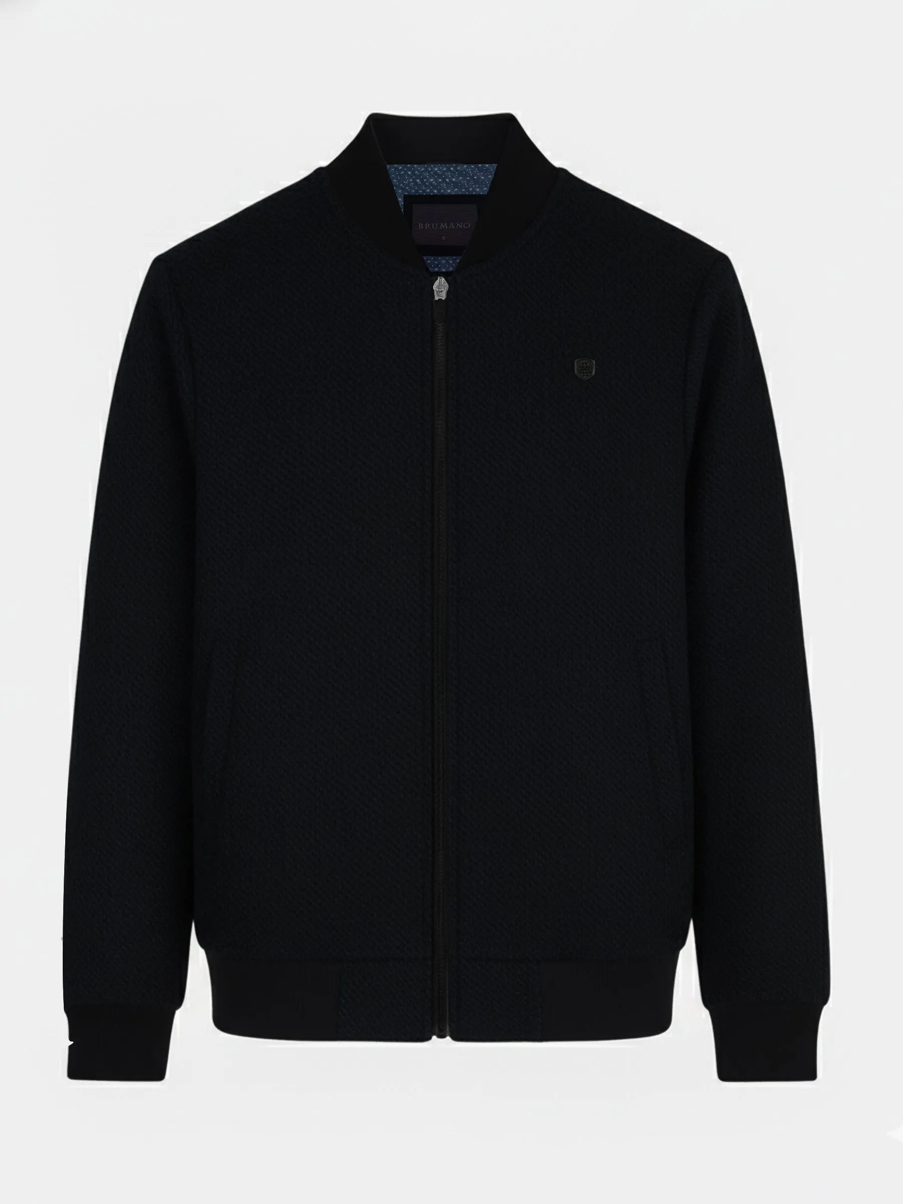 Sleek blend of warmth and style, this bomber is tailored in premium wool structured fabric. Featuring a full-zip closure, ribbed collar & cuff & front metal emblem. It’s a versatile layer perfect for both casual and smart looks.