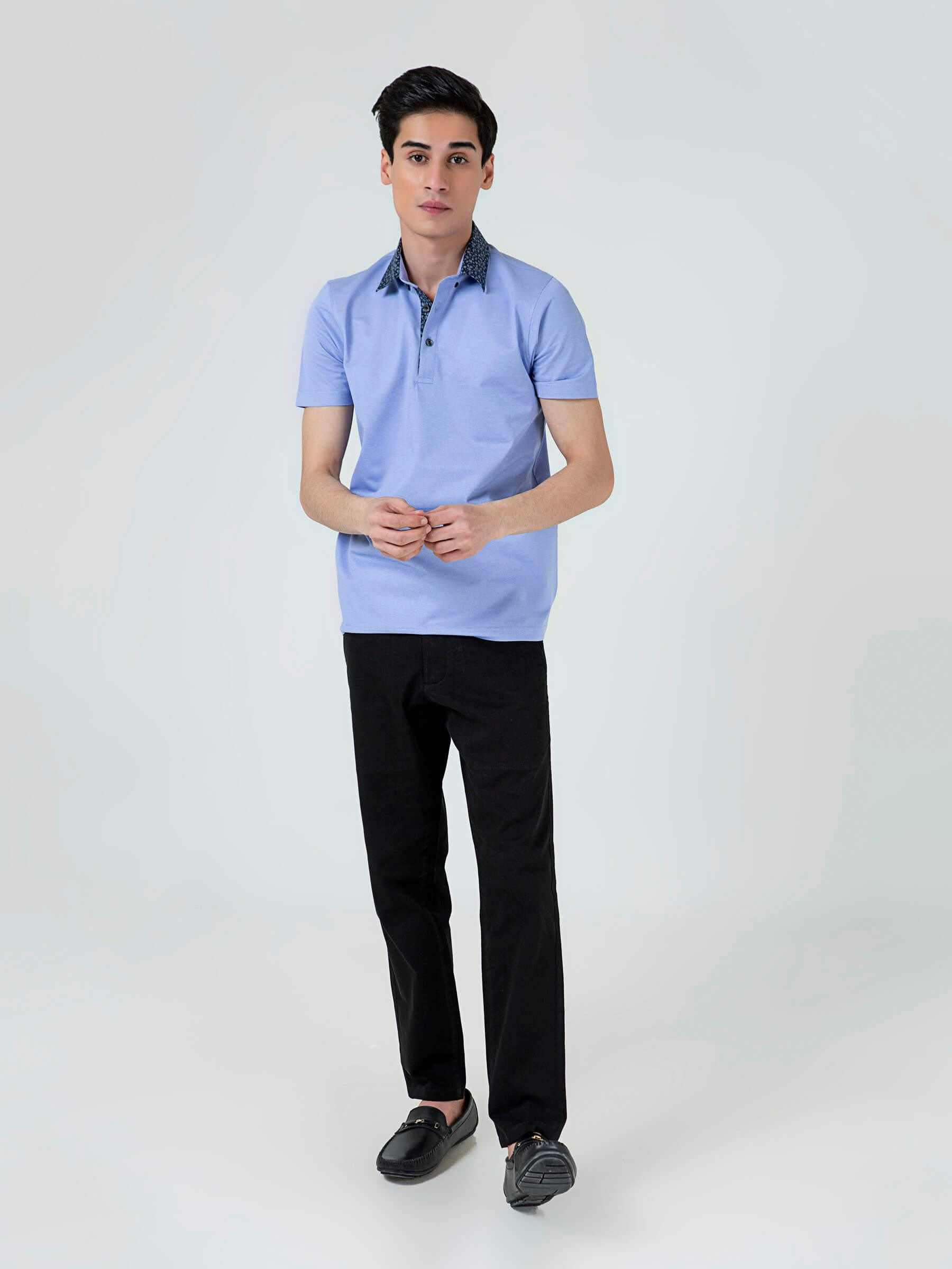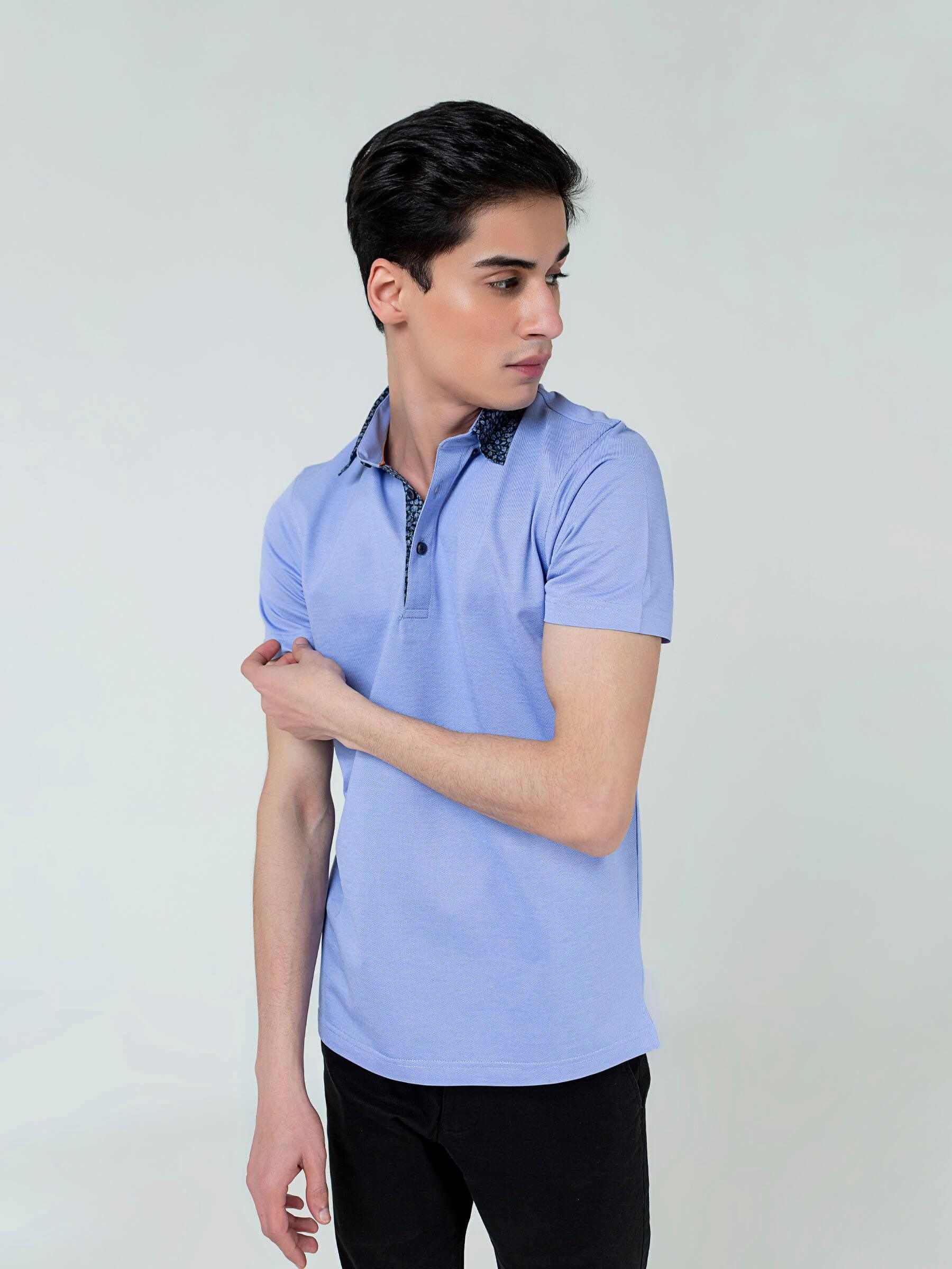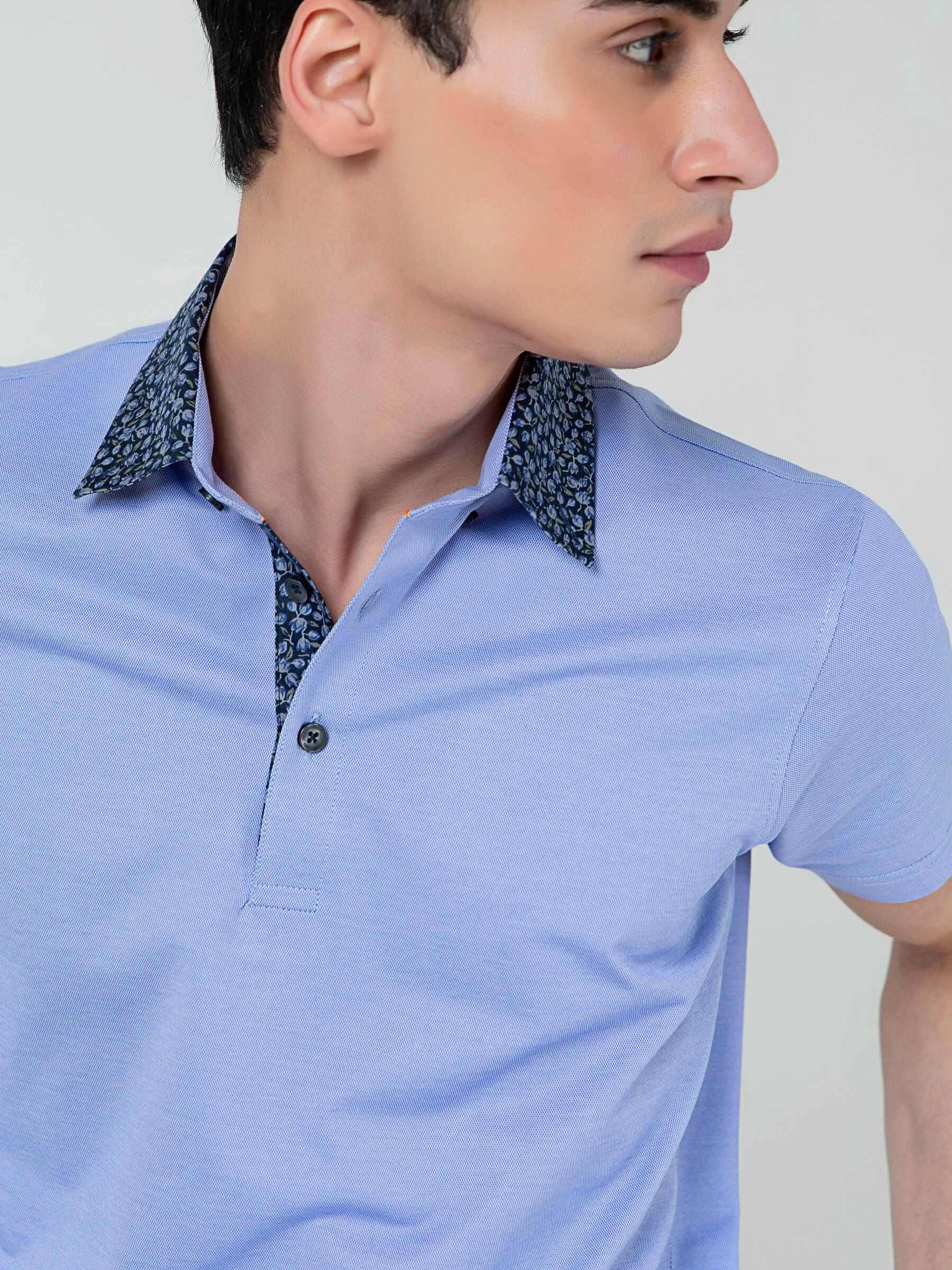 Blue Pique Polo With Floral Printed Collar