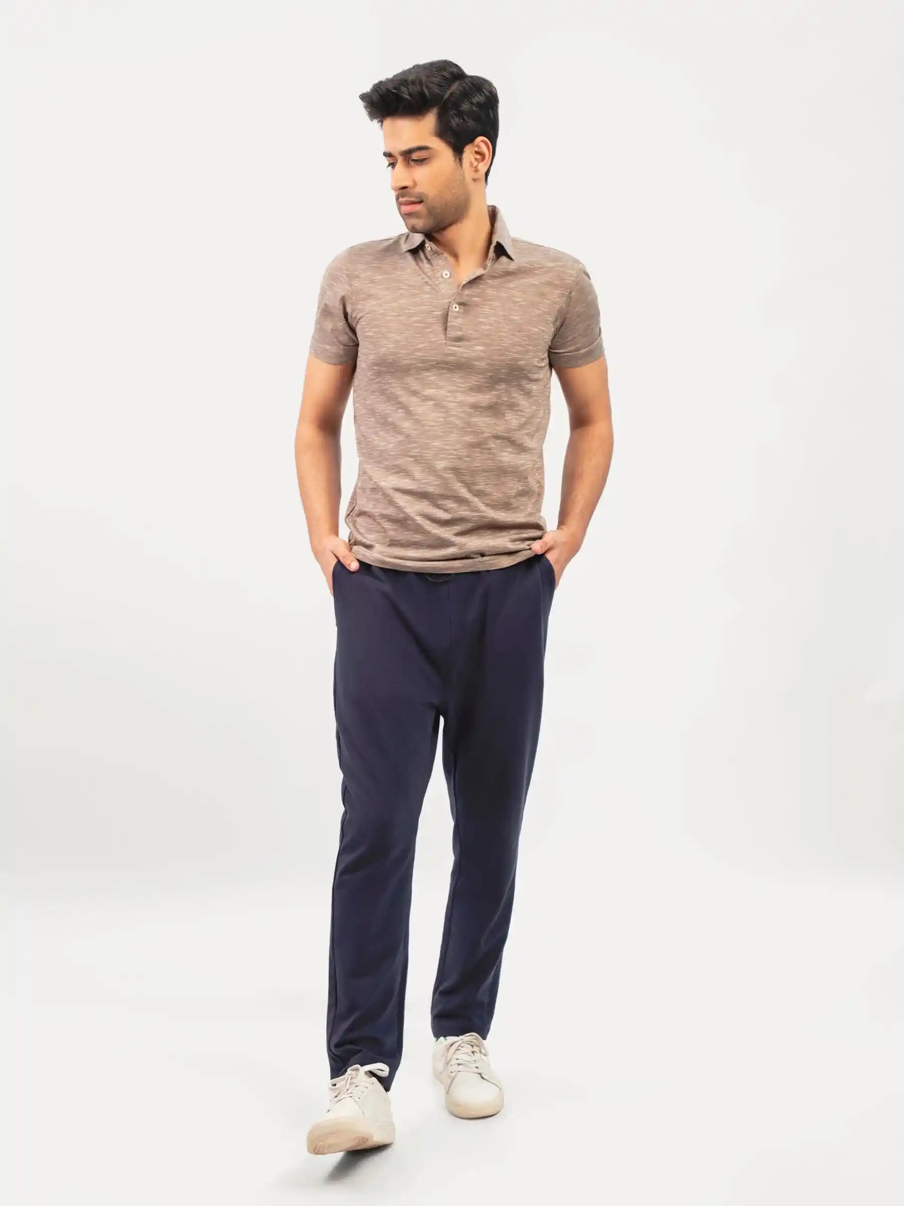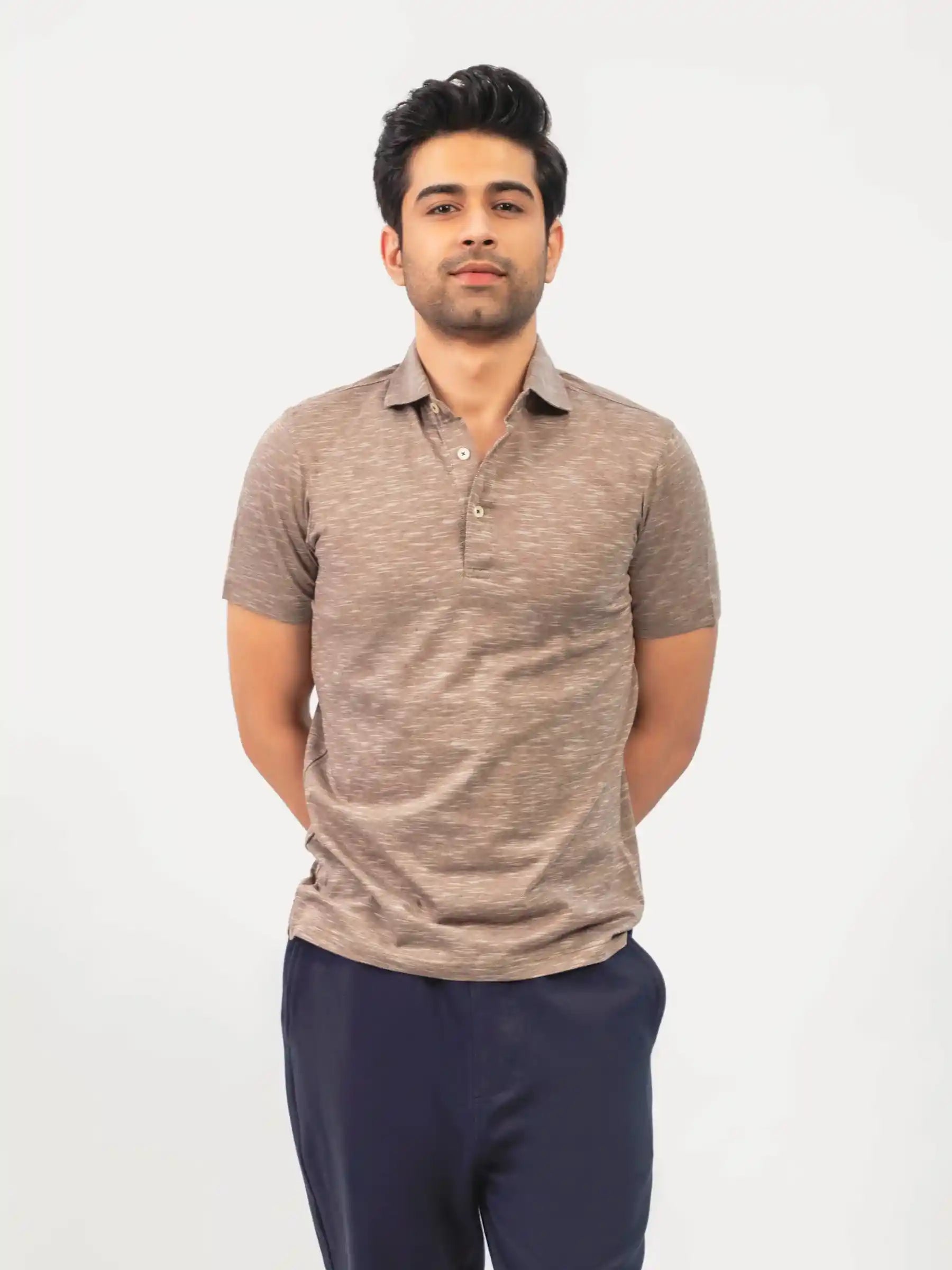 Unleash casual sophistication with our brown inject pattern polo with cutaway collar, a summer essential that effortlessly combines comfort and timeless style. Neutral brown hue adds versatility to your wardrobe, making it a perfect choice for various occasions. Featuring executive cutaway collar design for that polished look
