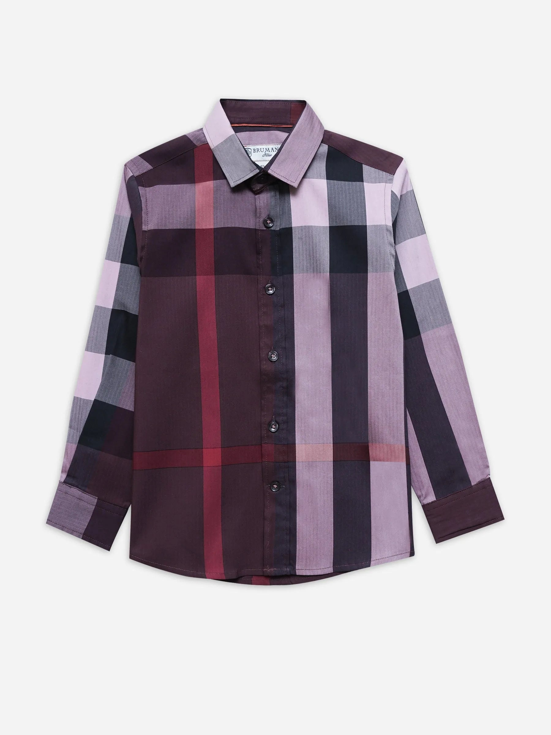 Add a pop of style to your little boy’s wardrobe with this burgundy large checkered shirt. Designed in soft, breathable cotton, it keeps him comfortable all day while giving a smart casual look. Perfect for school events, family outings, or weekend wear.