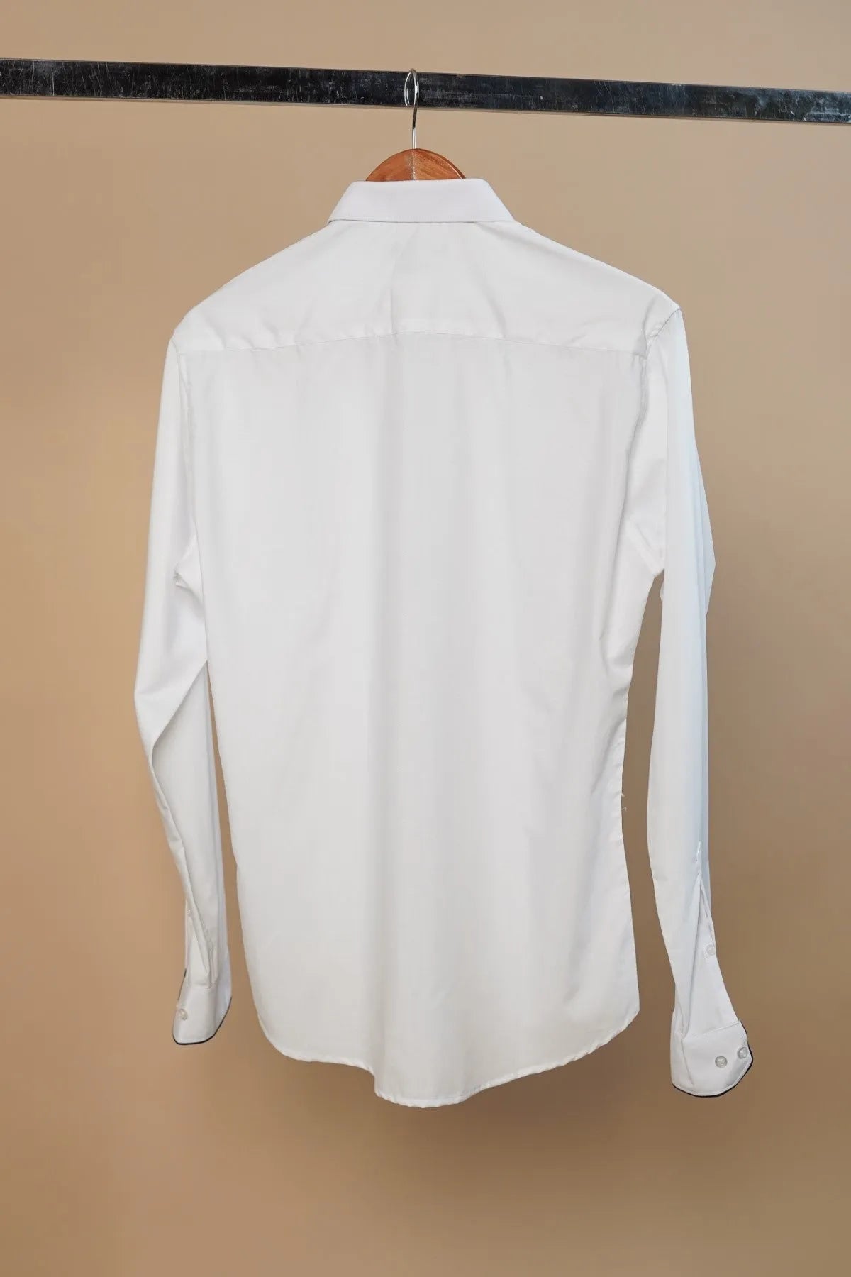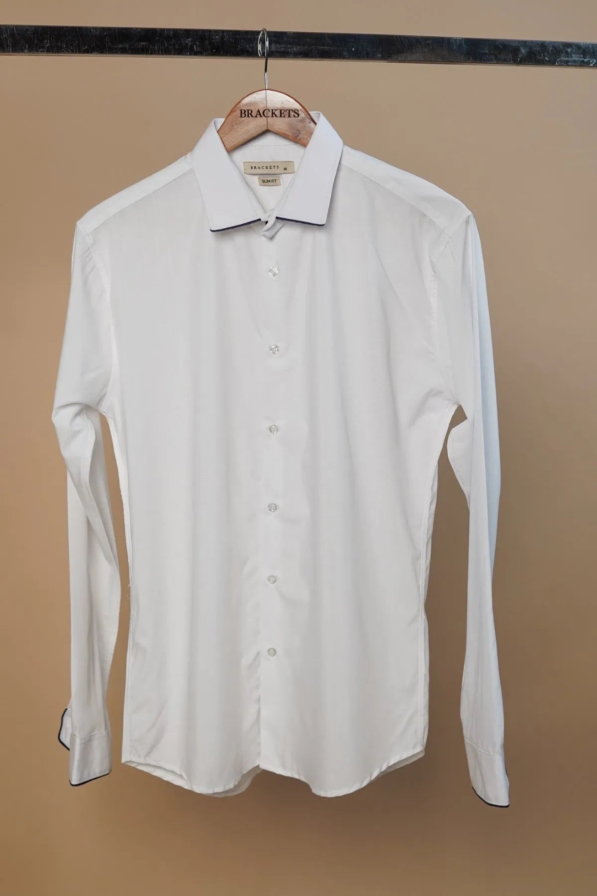Put away that stuffy white button-down; Brackets has a more contemporary version for you. Made 100% cotton, this shirt has a form-hugging slim fit and is extremely comfortable to wear. Â Baby stitch hem adds a delicate touch of on-trend flair and DTM buttons blend into the fabric for a clean, minimalist look; details like these elevate your everyday. Â This shirt will be a summer wardrobe staple thanks to its full sleeves, buttoned cuffs, and sharp collar. Â Â