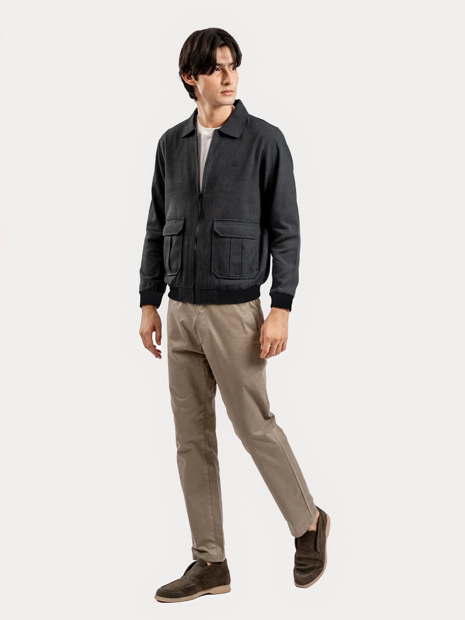 Crafted from durable cotton-blended fabric, this charcoal casual jacket features a smart collar design and spacious cargo pockets for added functionality. Finished with heavy flannel lining to keep you warm on cold days. Ideal for casual wear