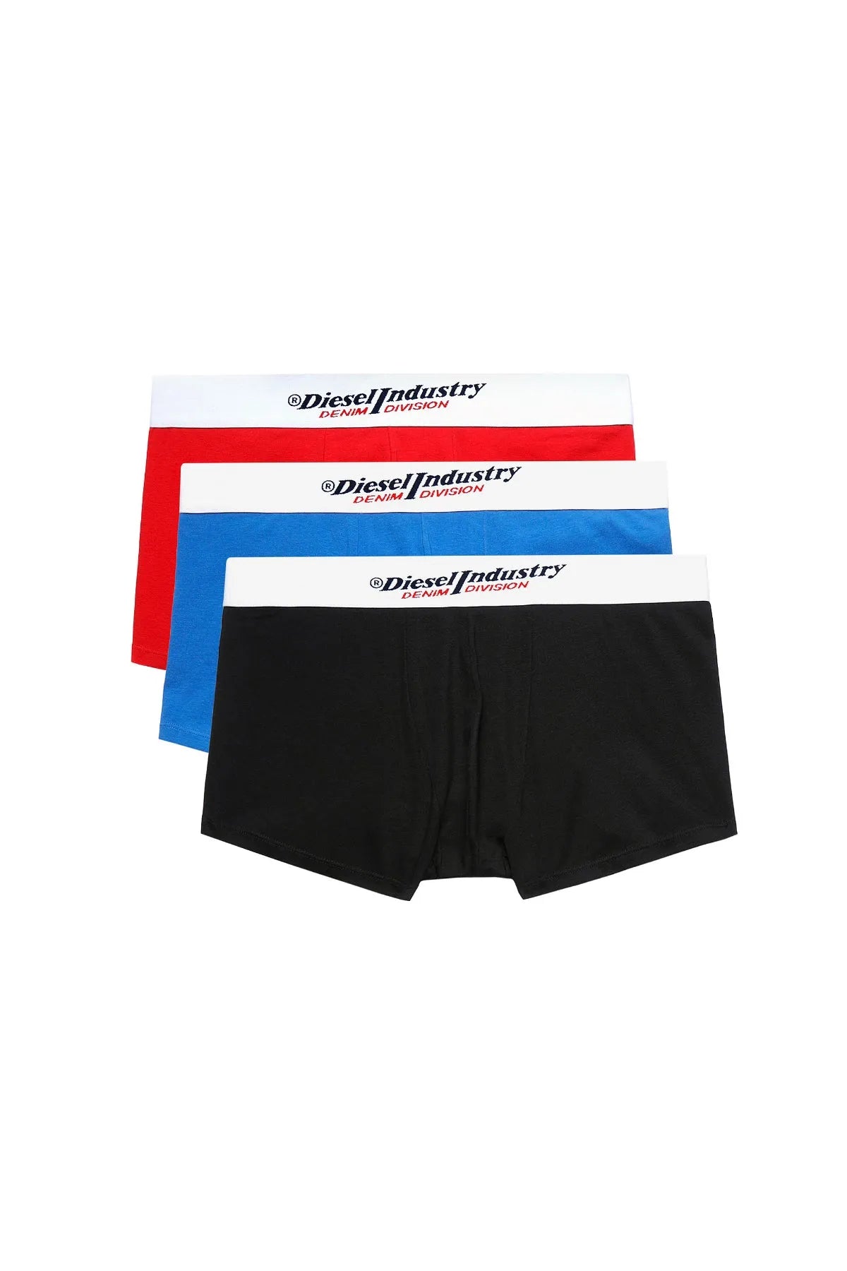 Three-pack of solid-color boxer briefs with a jacquard Diesel Industry Denim Division waistband. Each pair is crafted from certified organic stretch cotton, including the waistband.